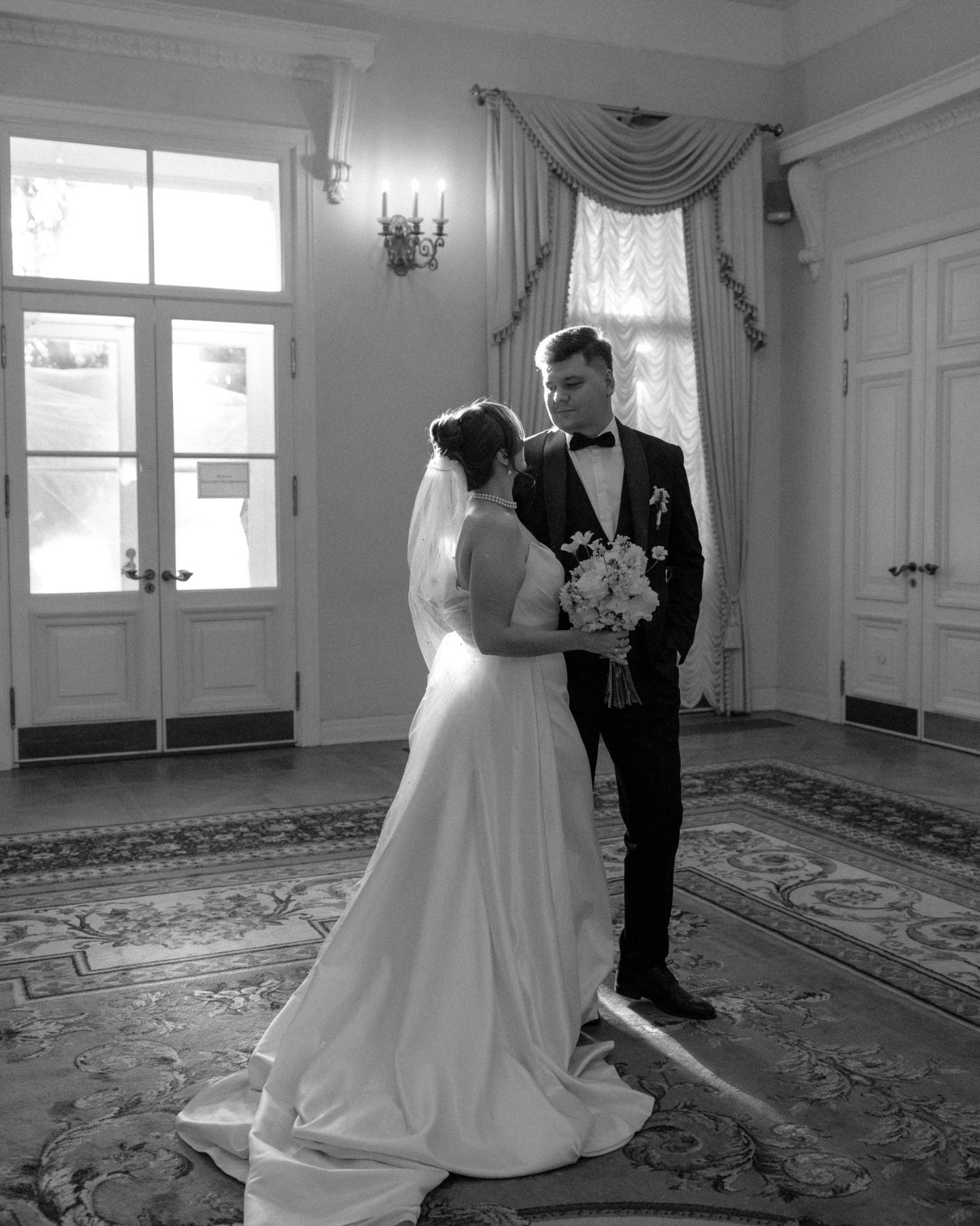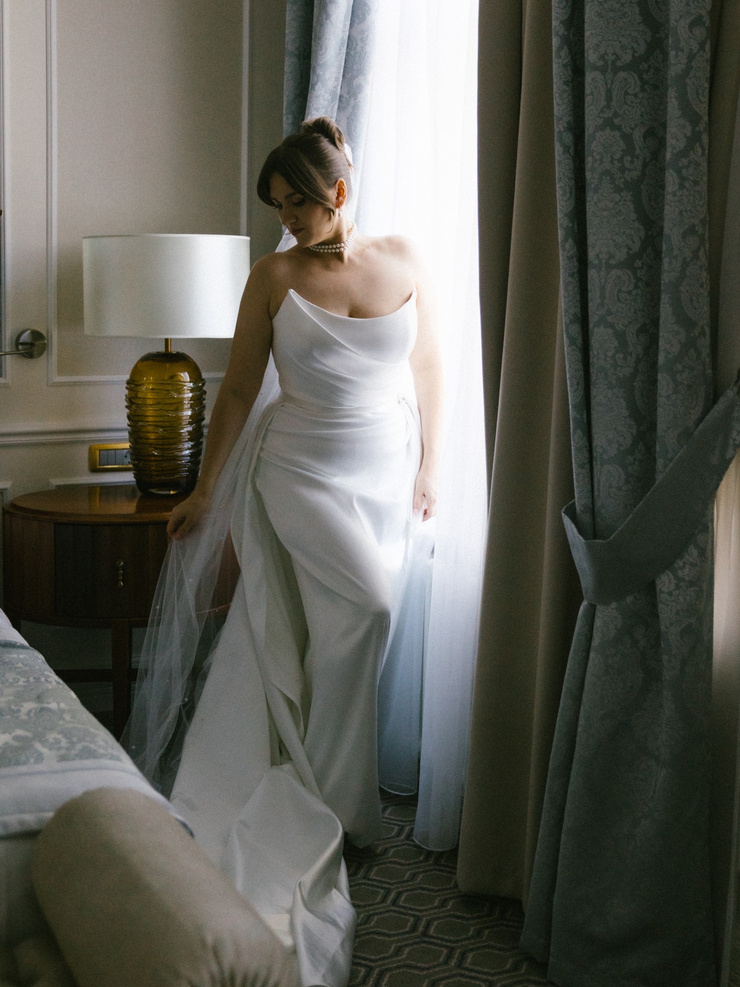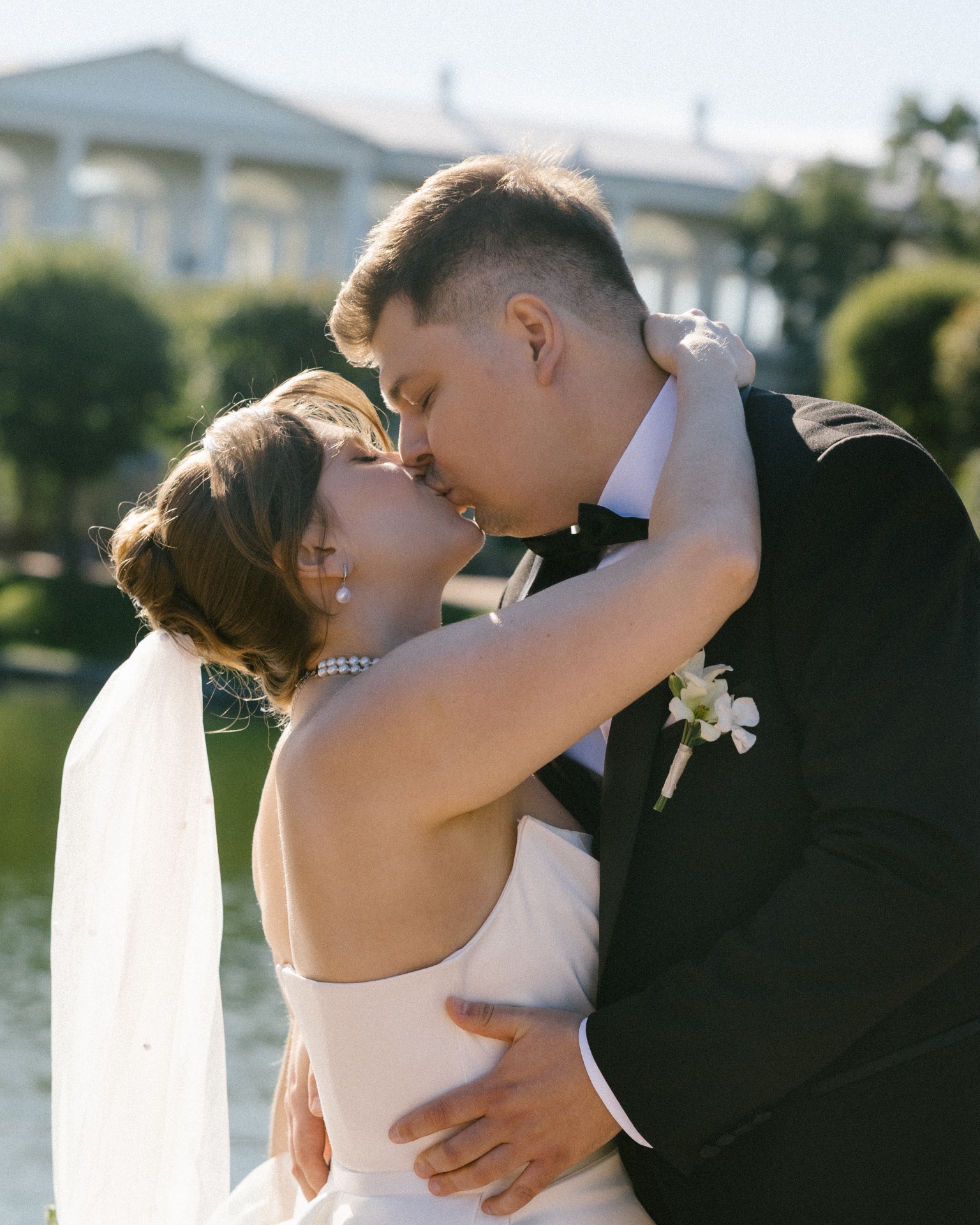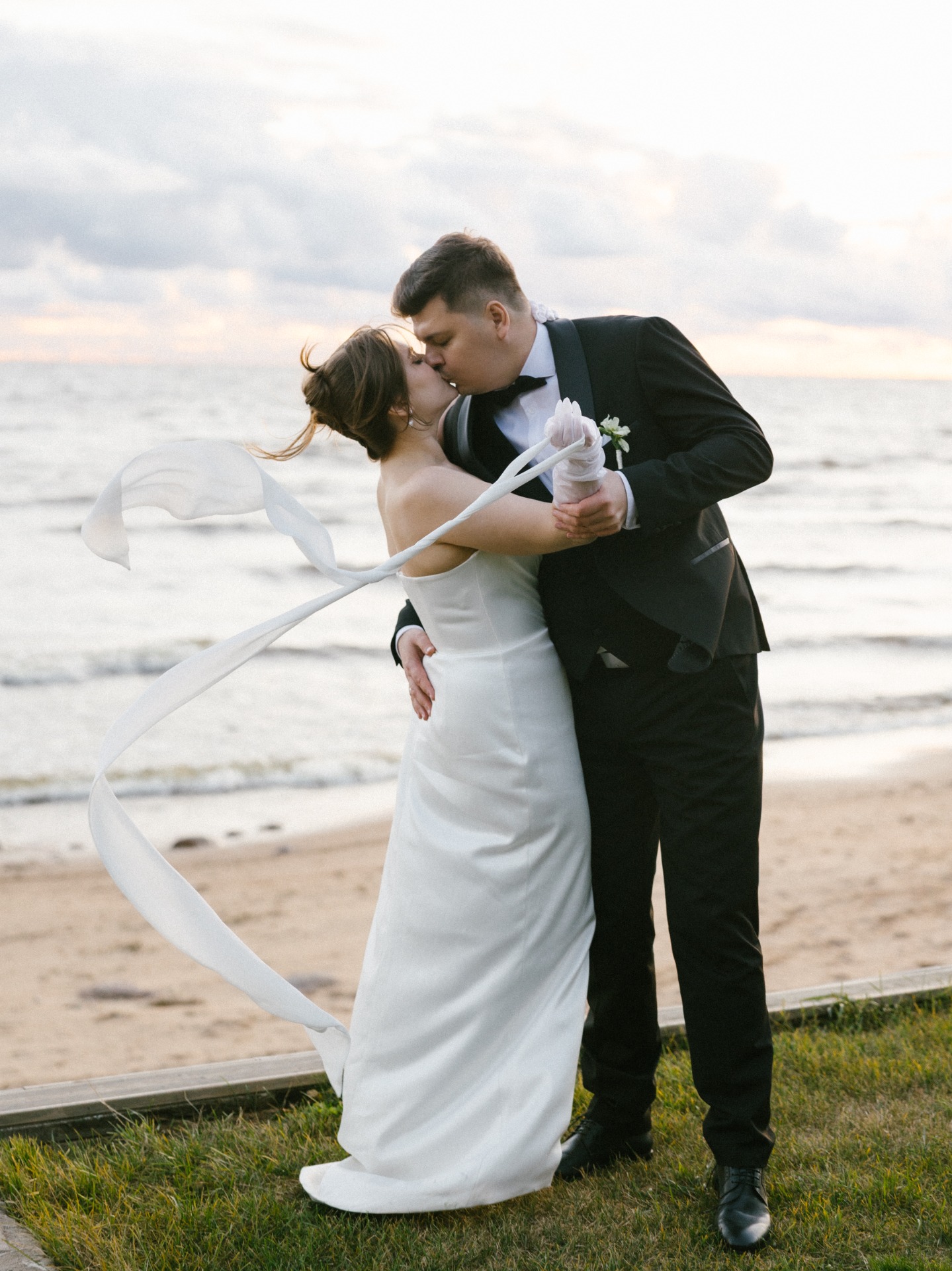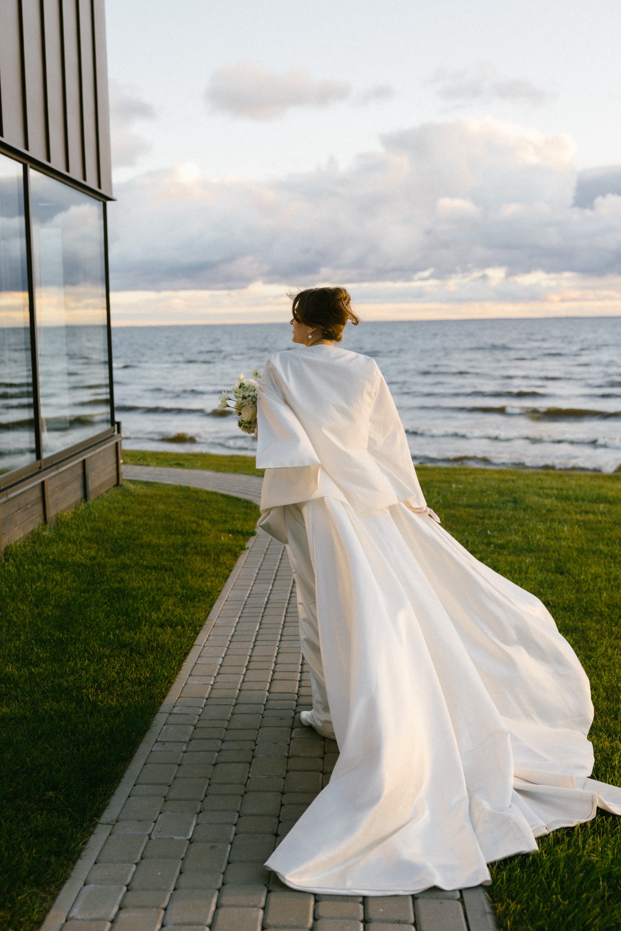 Платье я выбрала практически день в день. Посетив четыре салона, я остановилась на платье бренда Seashell, которое полностью отражало нашу классическую концепцию. Также у этой модели был съёмный шлейф, что оказалось очень удобно. Он позволил мне быстро поменять образ в вечернее время, дополнив его шарфом и высокими перчатками, которые надевала на свою свадьбу моя мама.