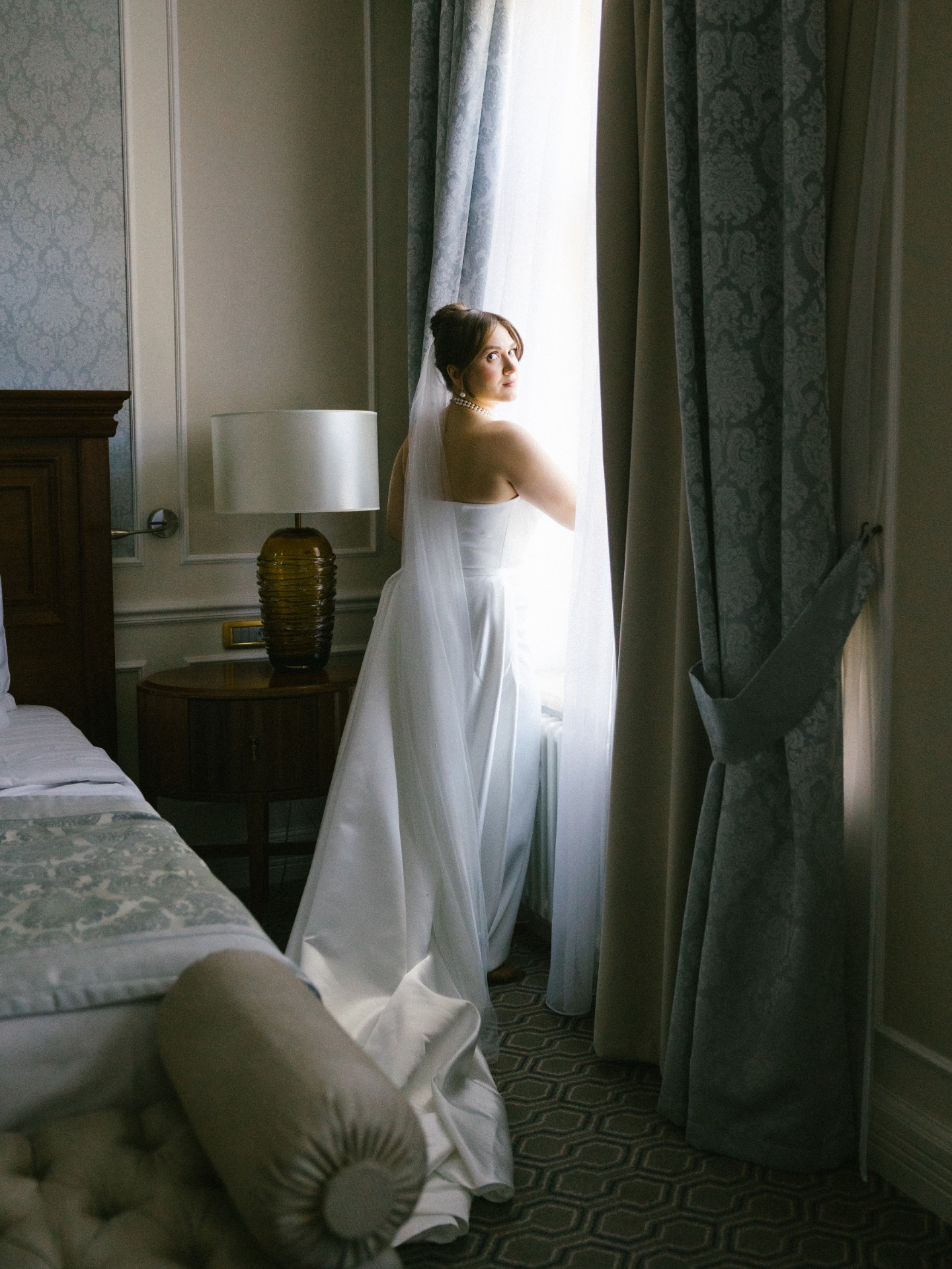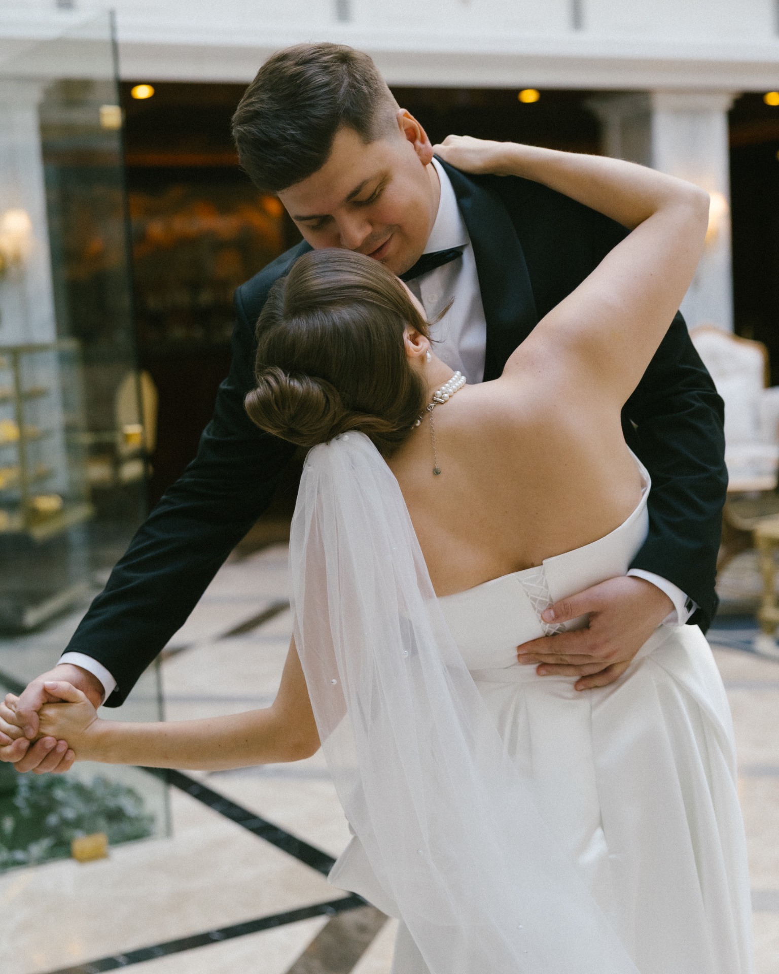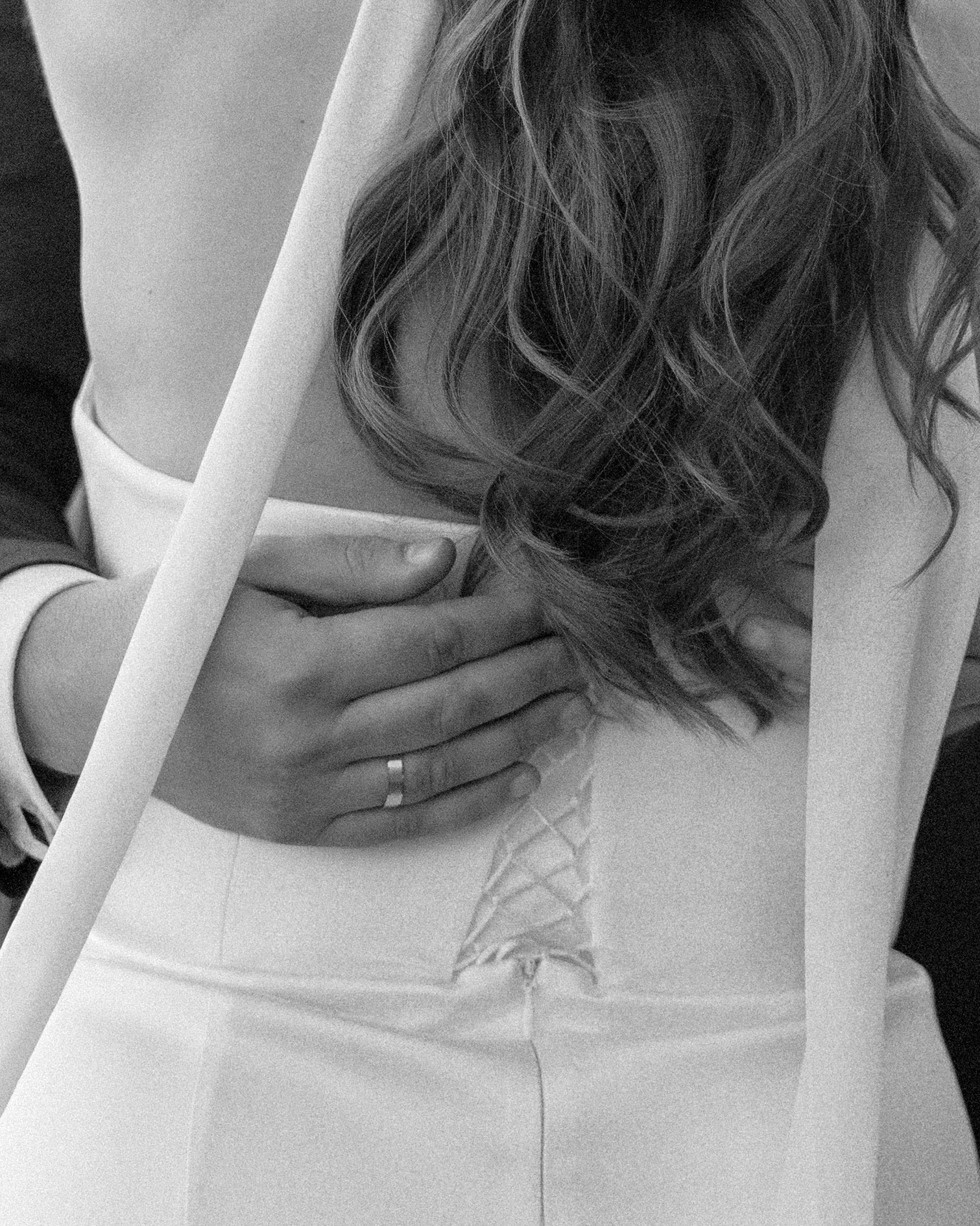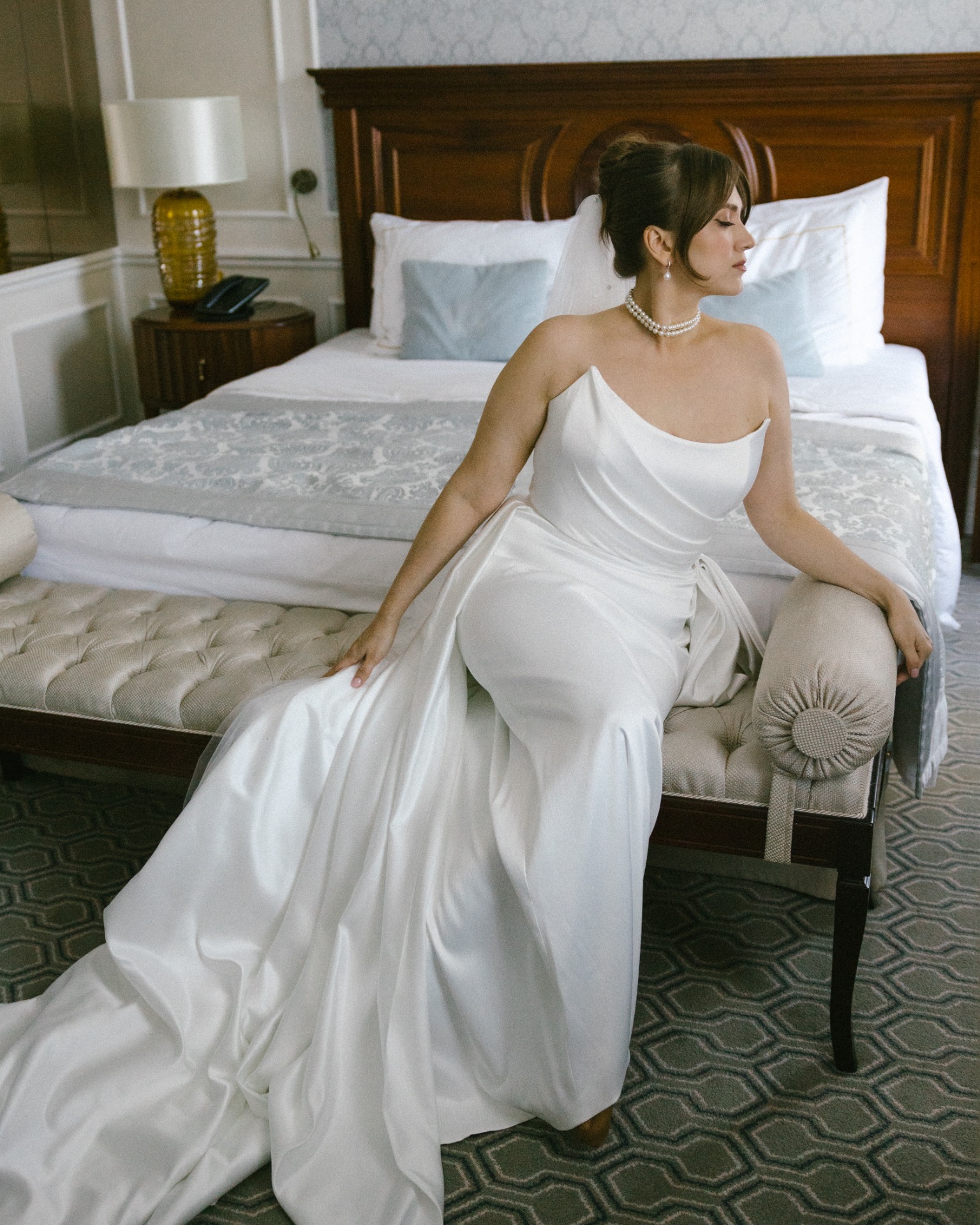 Платье я выбрала практически день в день. Посетив четыре салона, я остановилась на платье бренда Seashell, которое полностью отражало нашу классическую концепцию. Также у этой модели был съёмный шлейф, что оказалось очень удобно. Он позволил мне быстро поменять образ в вечернее время, дополнив его шарфом и высокими перчатками, которые надевала на свою свадьбу моя мама.
