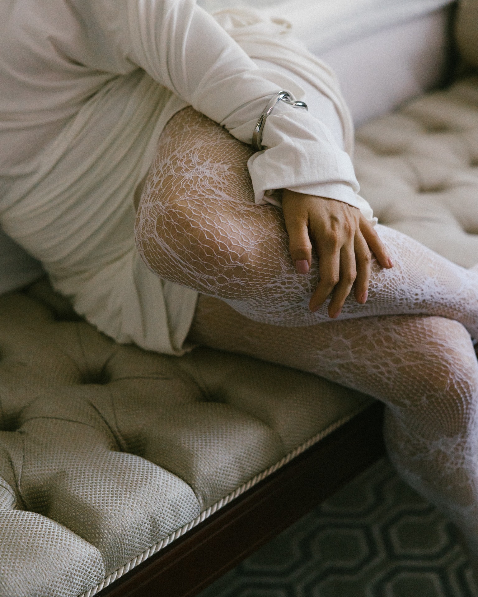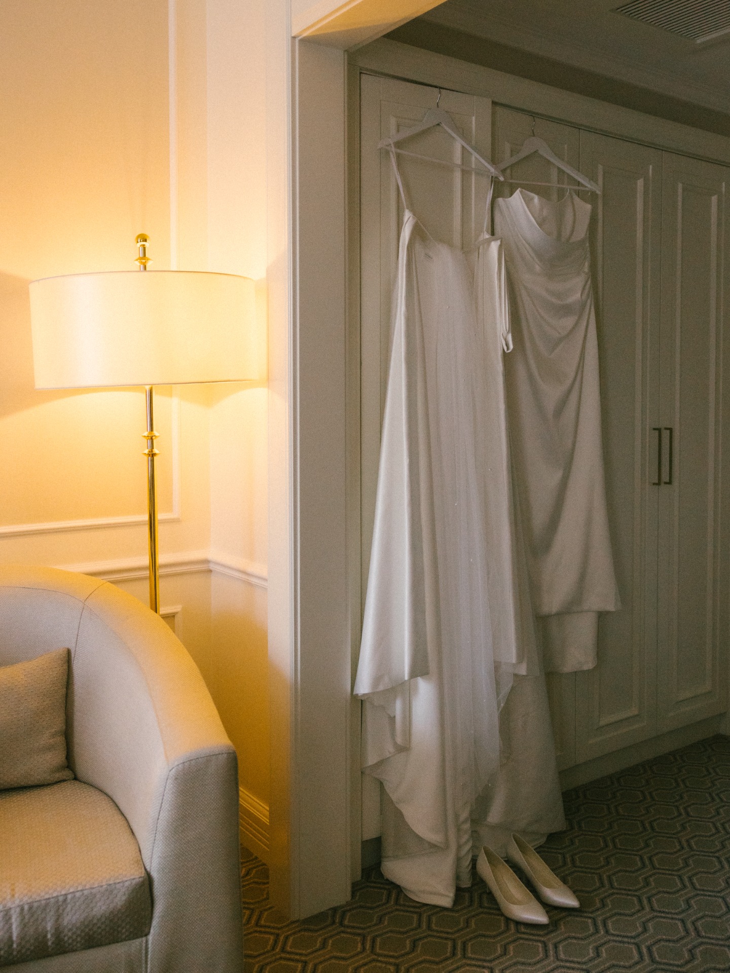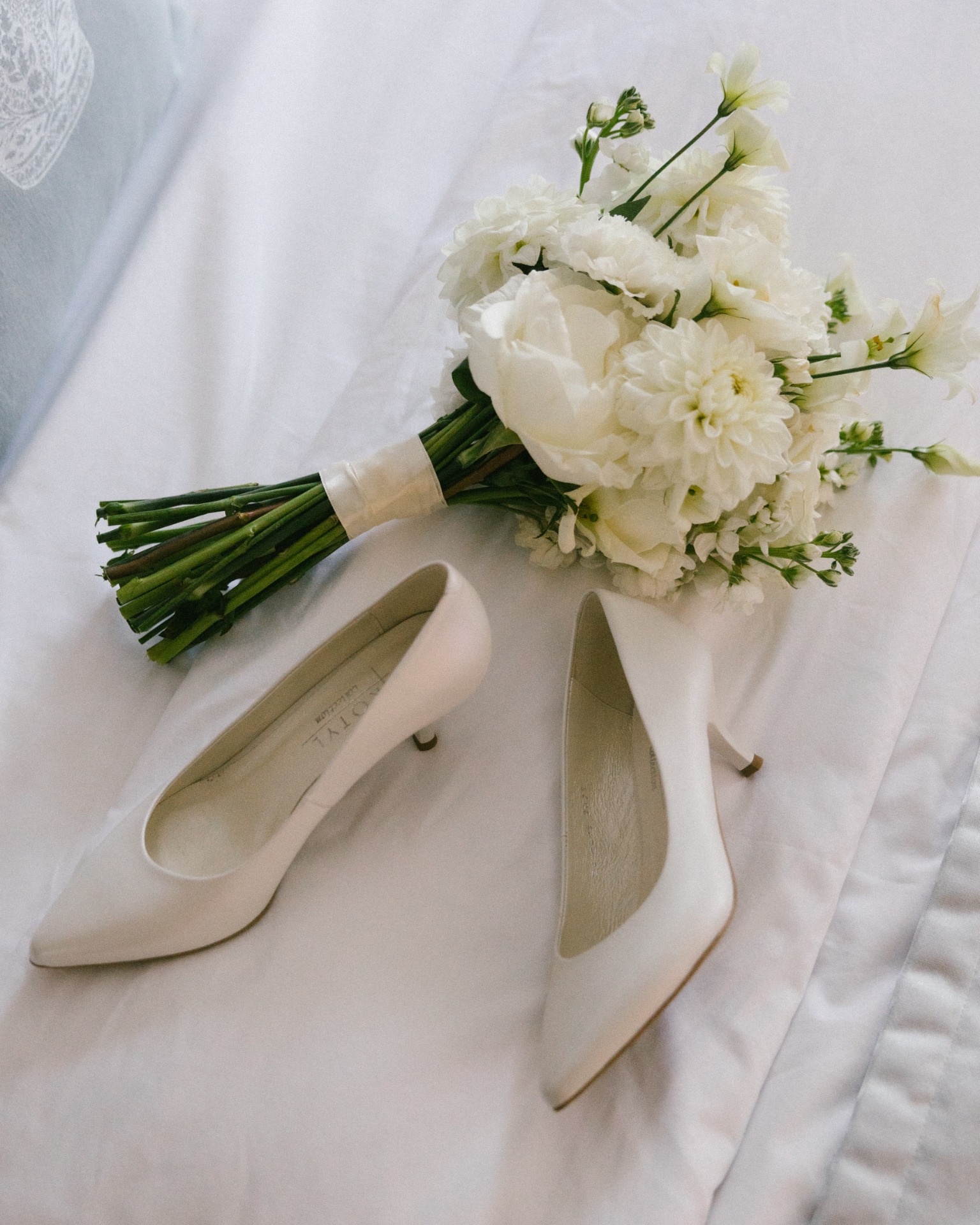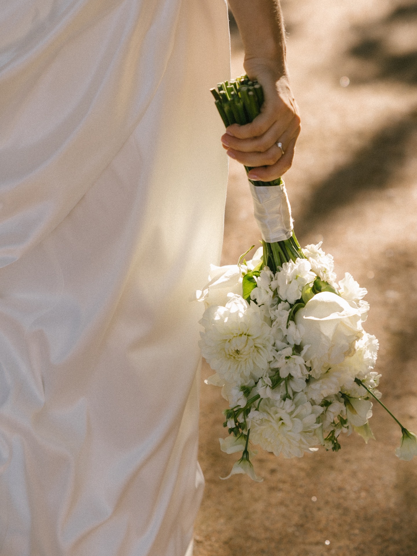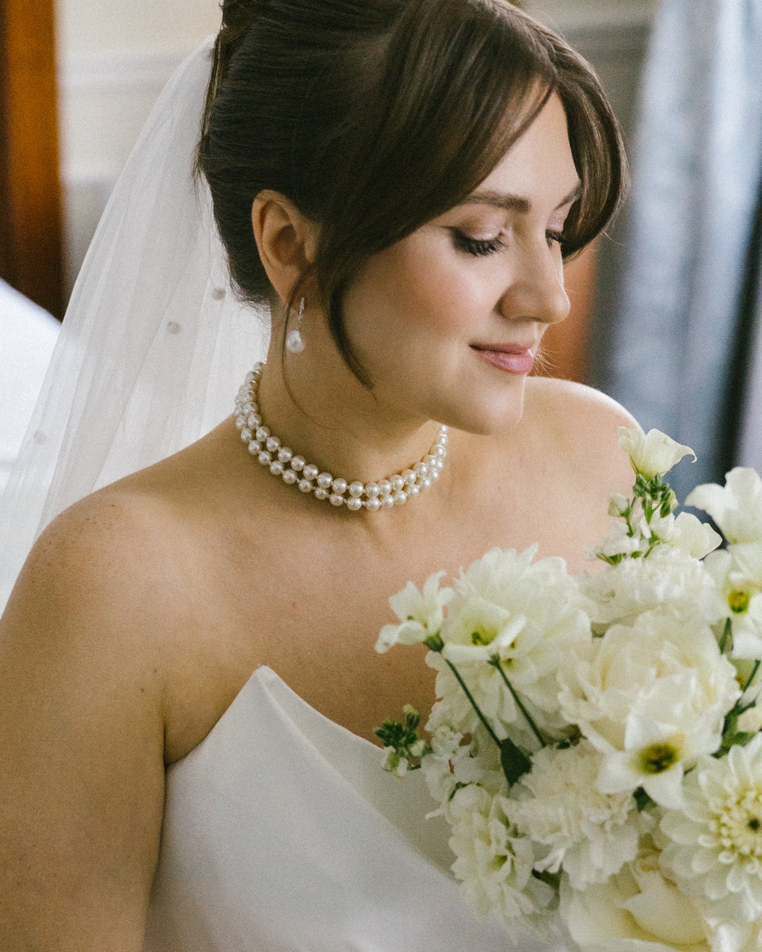 Платье я выбрала практически день в день. Посетив четыре салона, я остановилась на платье бренда Seashell, которое полностью отражало нашу классическую концепцию. Также у этой модели был съёмный шлейф, что оказалось очень удобно. Он позволил мне быстро поменять образ в вечернее время, дополнив его шарфом и высокими перчатками, которые надевала на свою свадьбу моя мама.