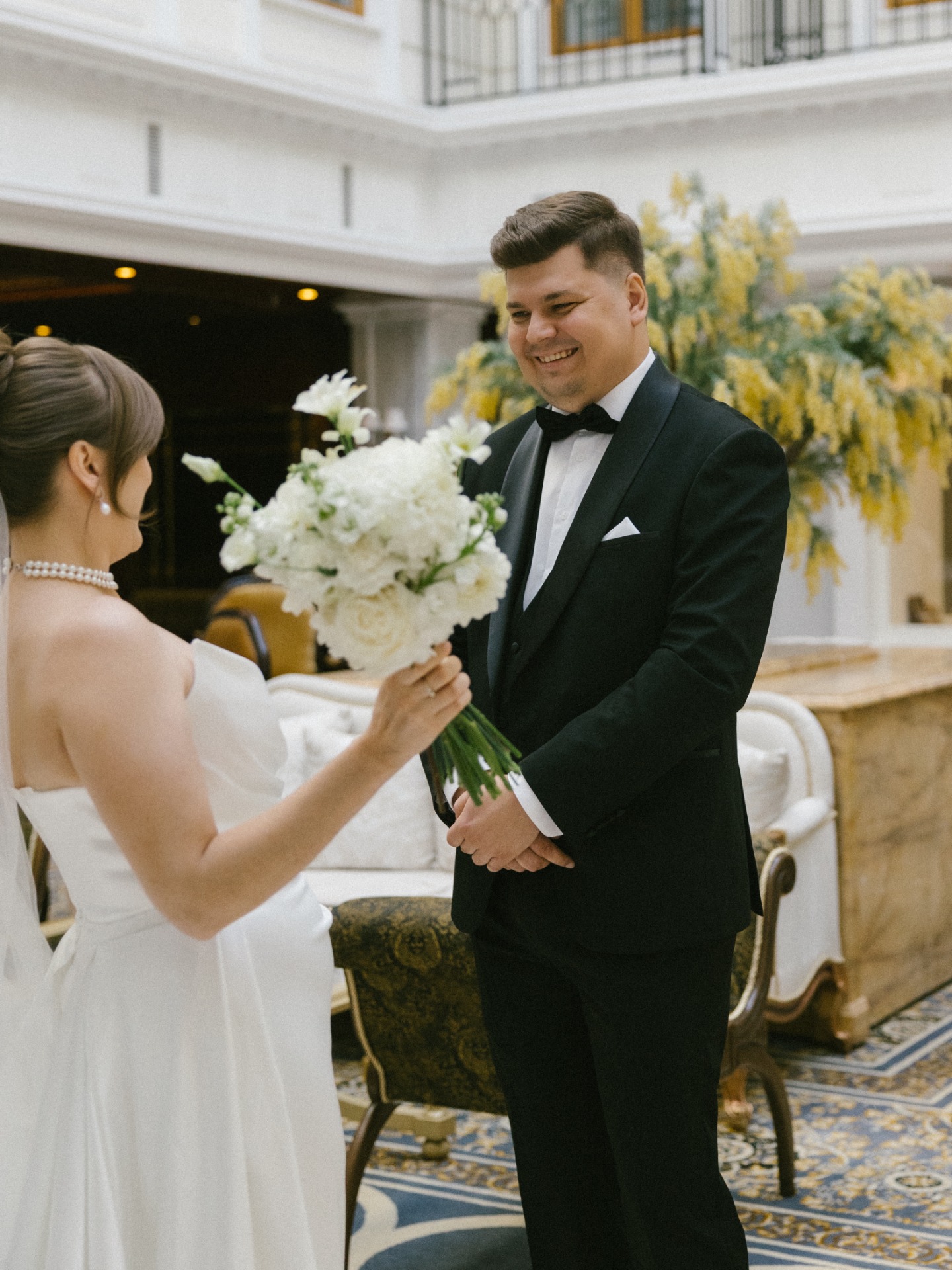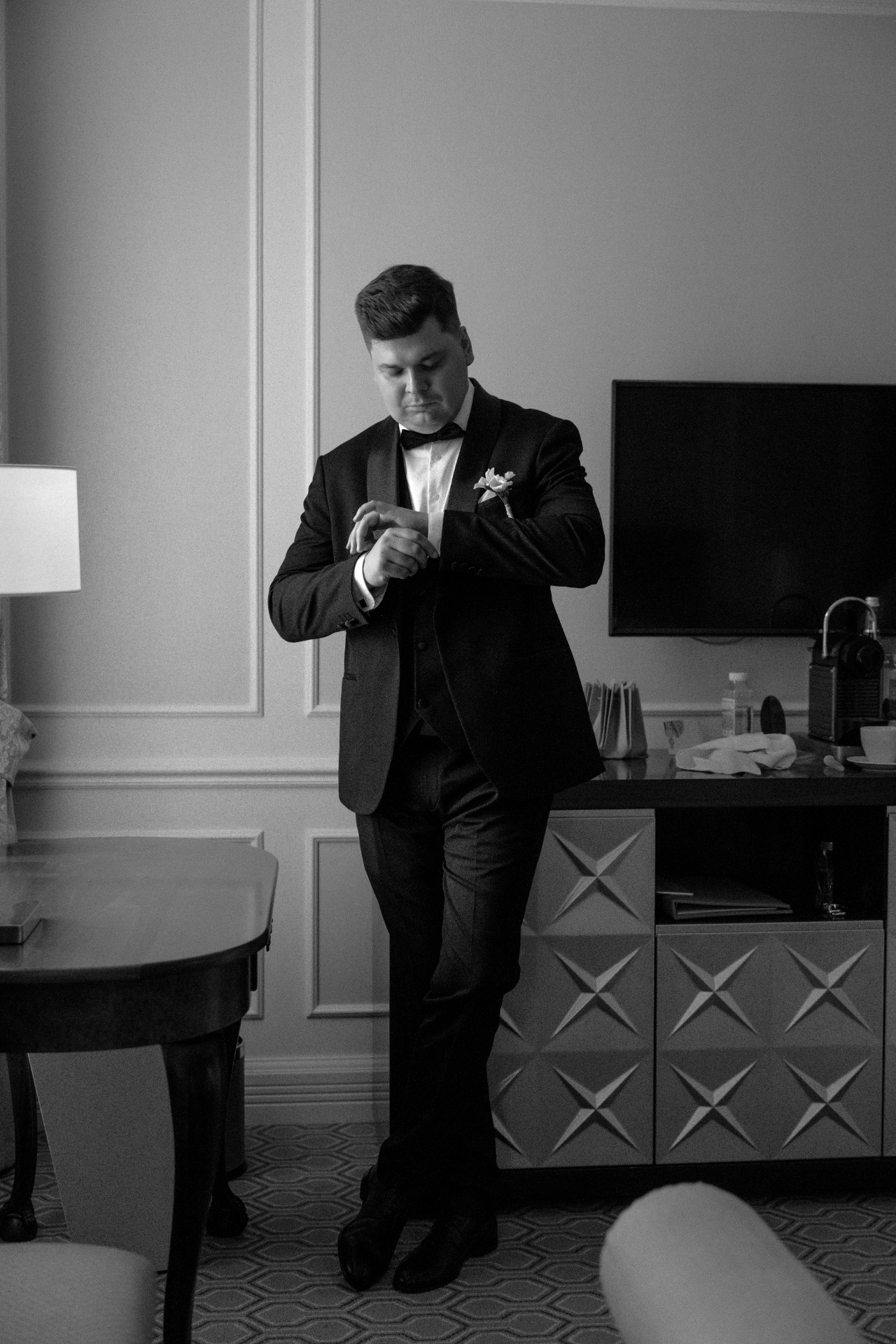 С нарядом Димы было чуть сложнее, так как к концу сезона не во всех салонах оставались классические смокинги. В итоге мы нашли костюм совершенно случайно. Дополнениями к его образу стали бабочка и запонки.