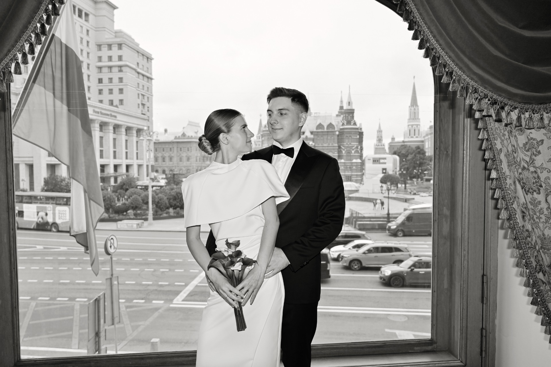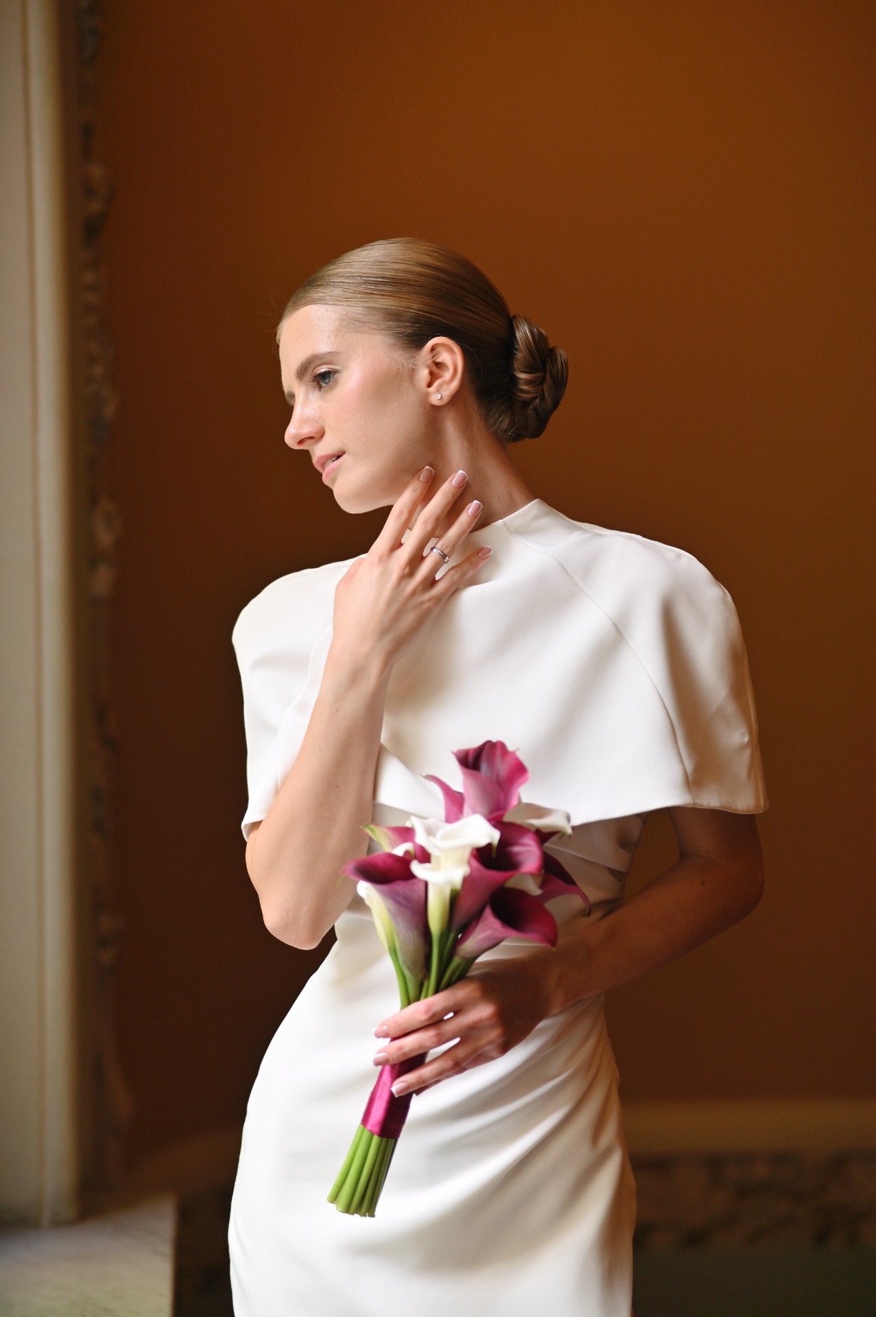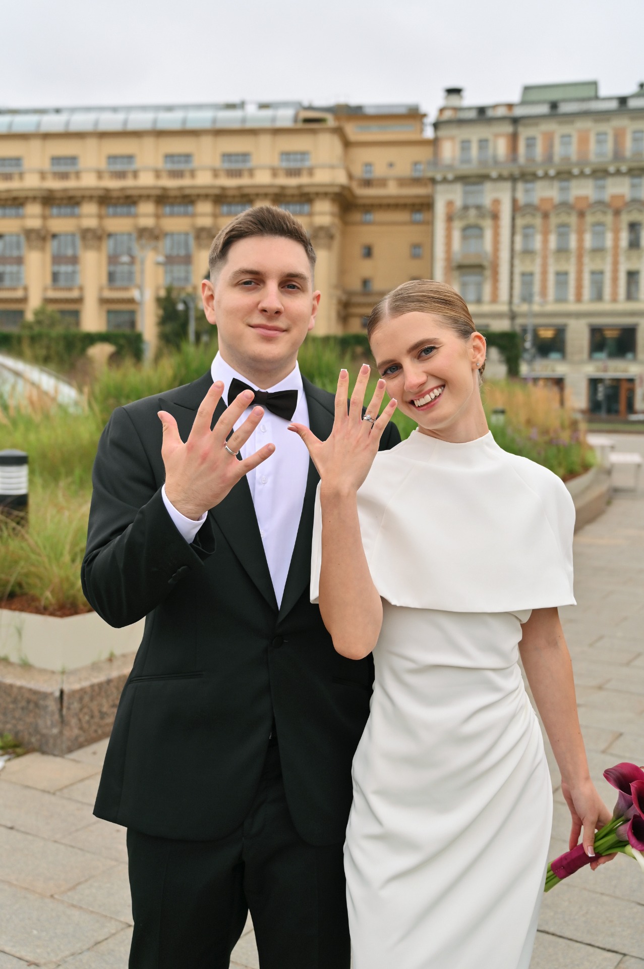 Наша роспись проходила в отеле «Националь», и мне хотелось подобрать для себя что-то утончённое и элегантное. Я выбрала платье молочного оттенка с кейпом и босоножки с открытым мысом. Акцентом стал букет из белых и тёмно-розовых калл.