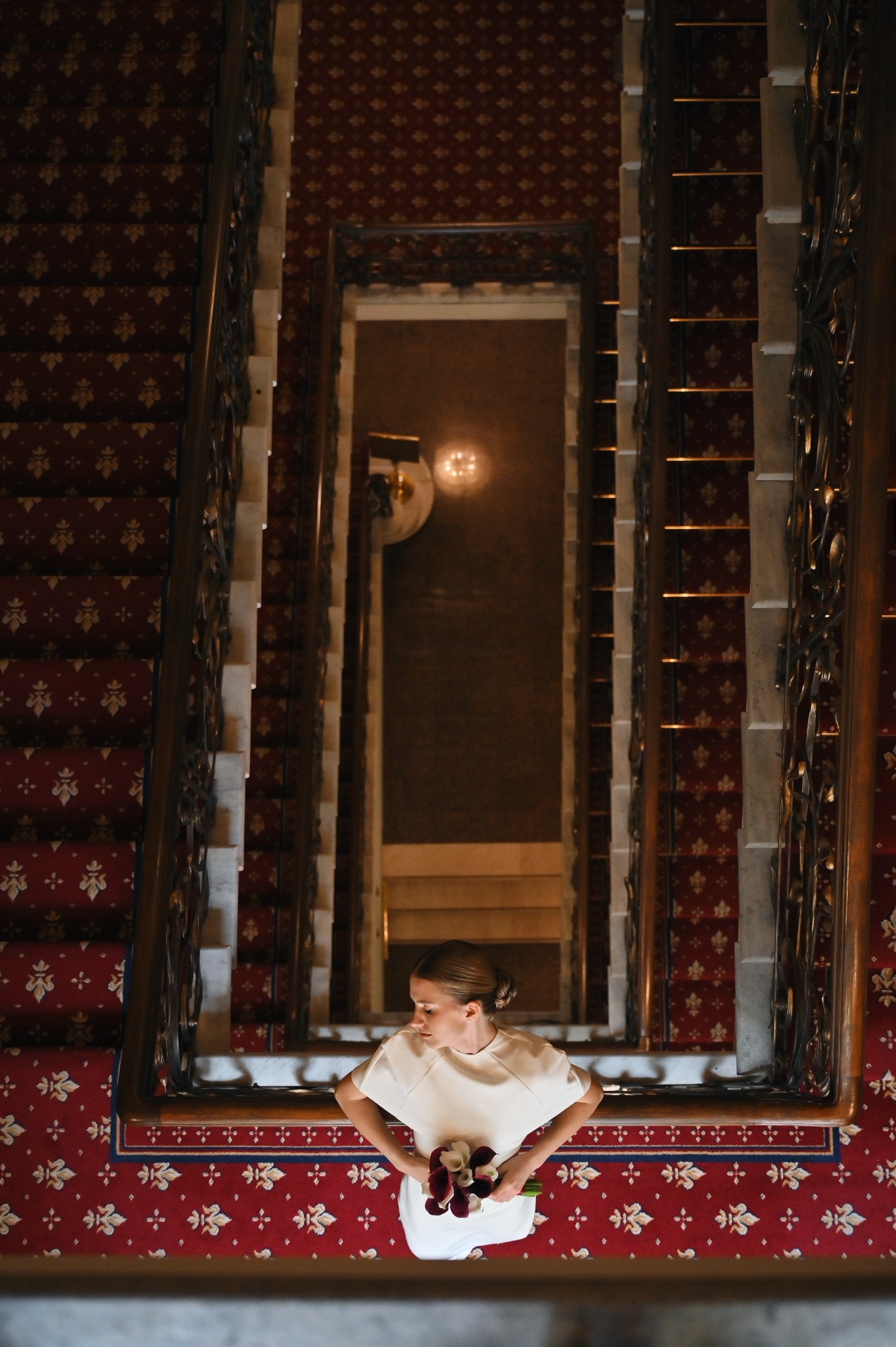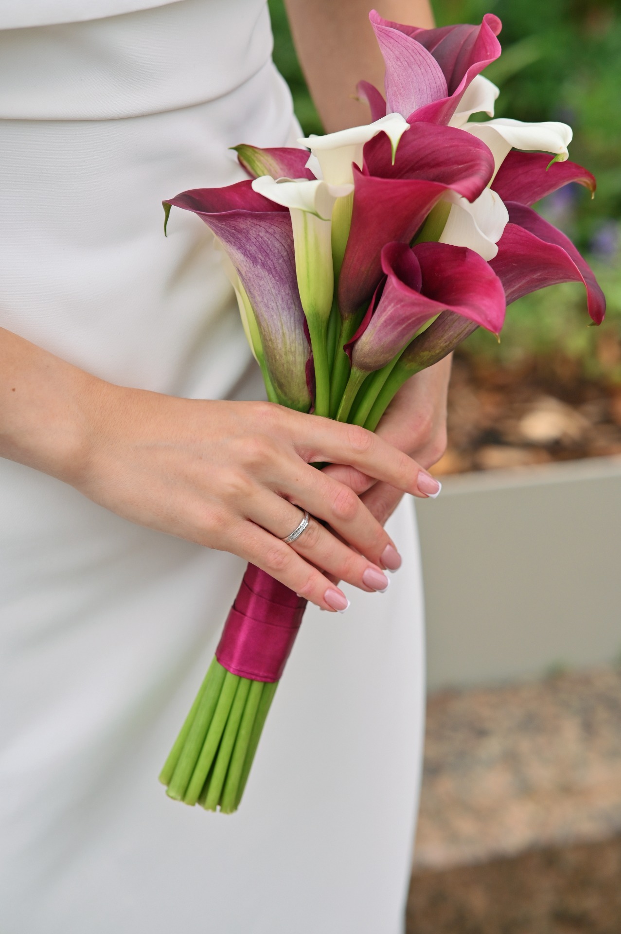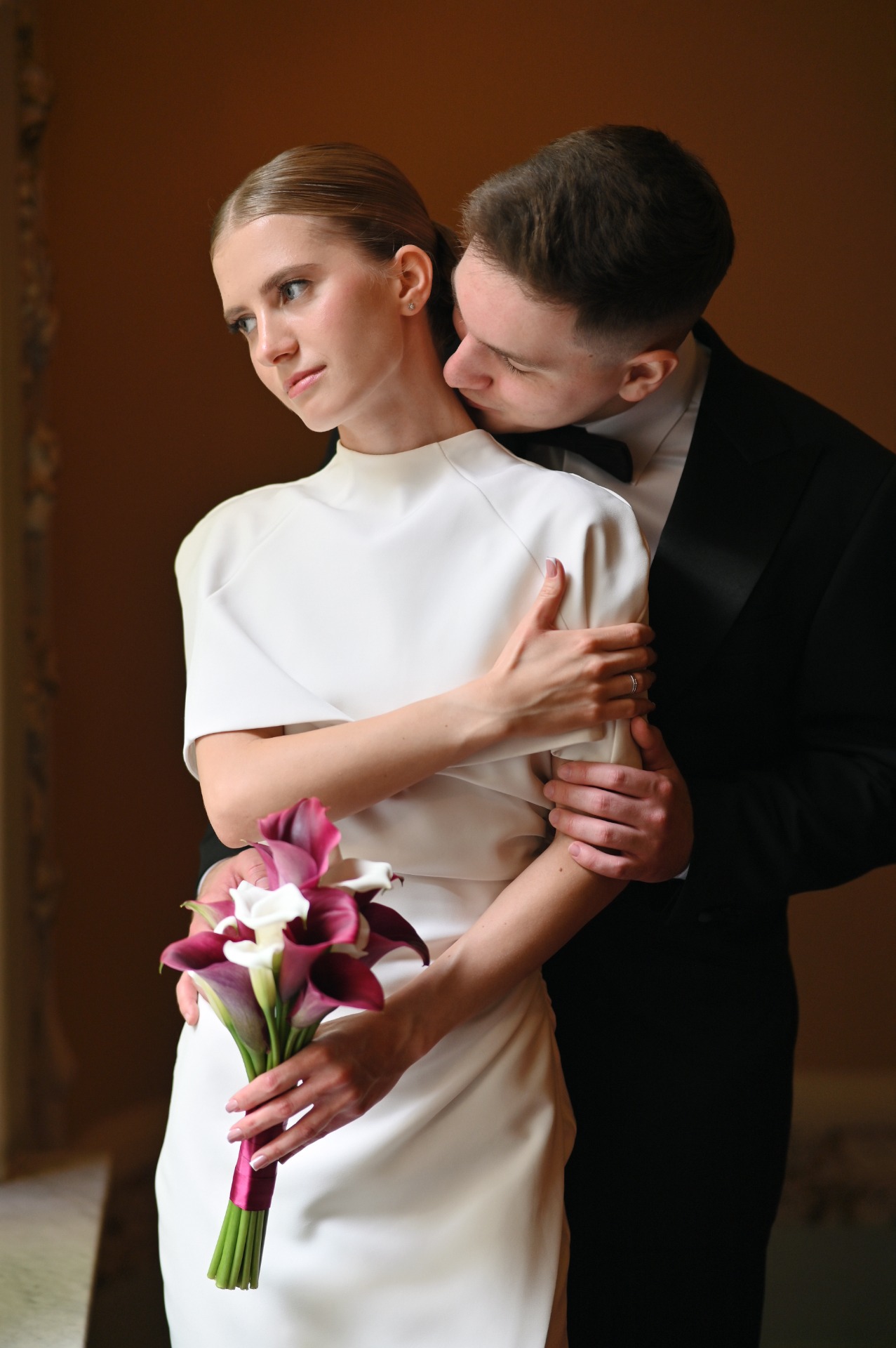 Наша роспись проходила в отеле «Националь», и мне хотелось подобрать для себя что-то утончённое и элегантное. Я выбрала платье молочного оттенка с кейпом и босоножки с открытым мысом. Акцентом стал букет из белых и тёмно-розовых калл.