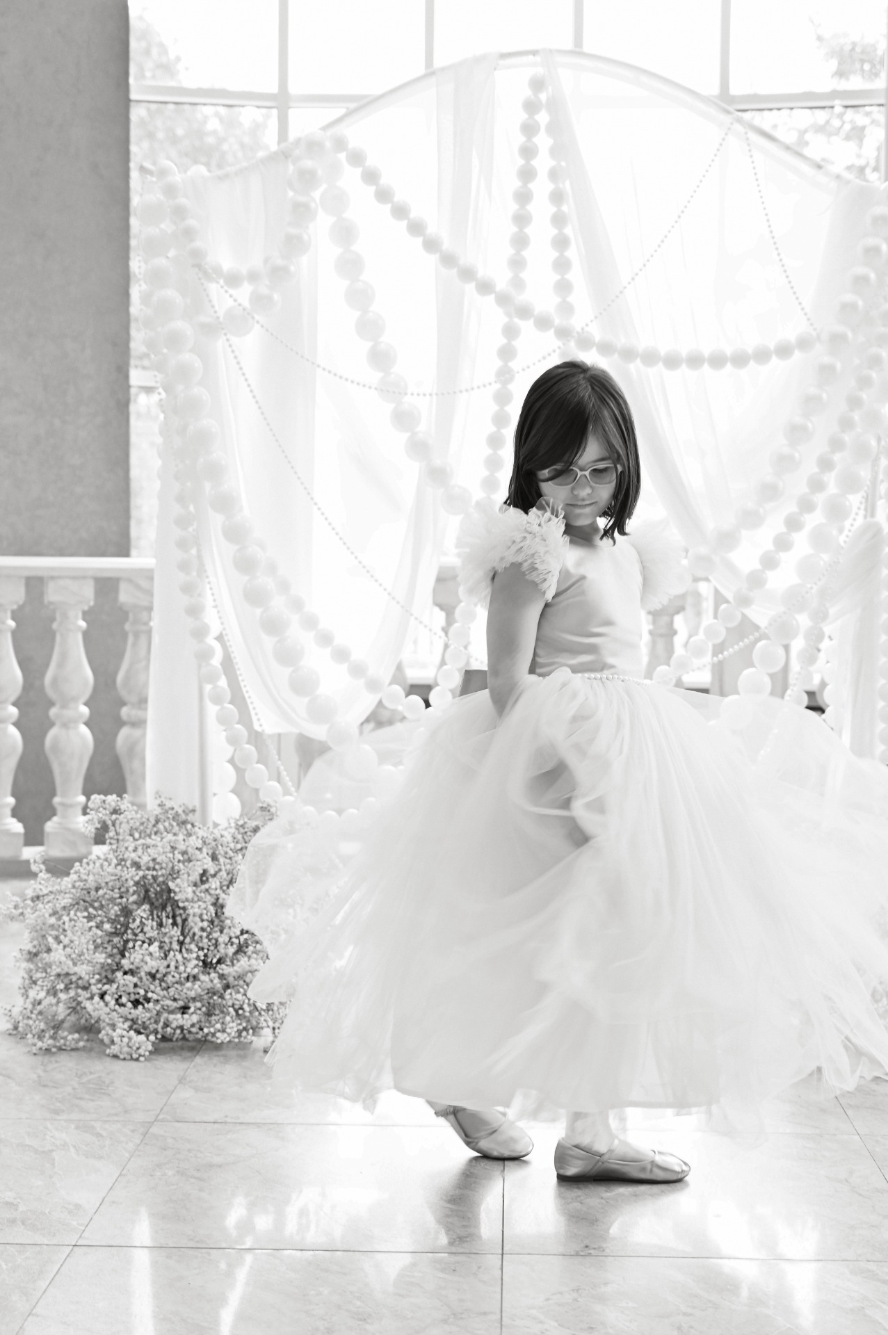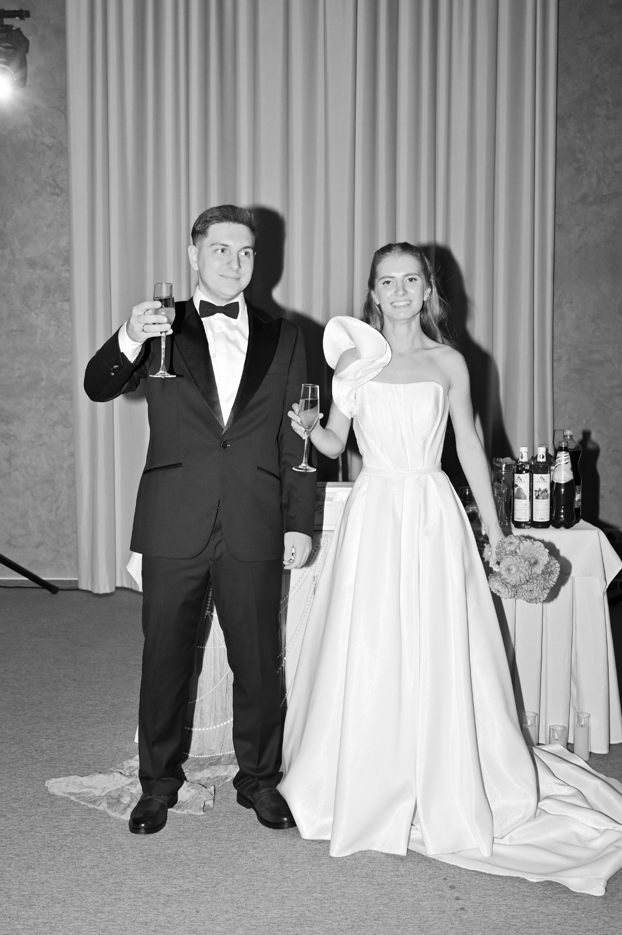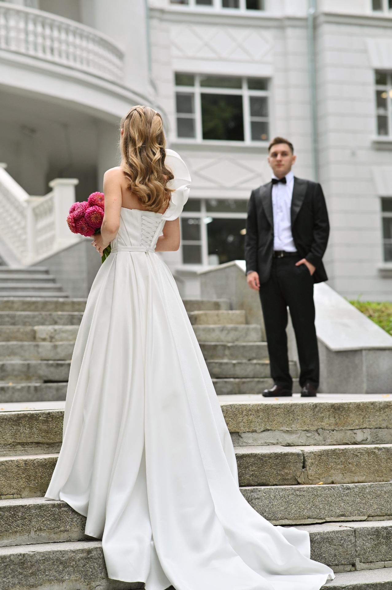 Для банкета я выбрала пышное платье с акцентной съёмной деталью на плече. Букет состоял из ярко-розовых георгинов. Причёску для праздника мы сменили на «мальвинку», а макияж повторили.