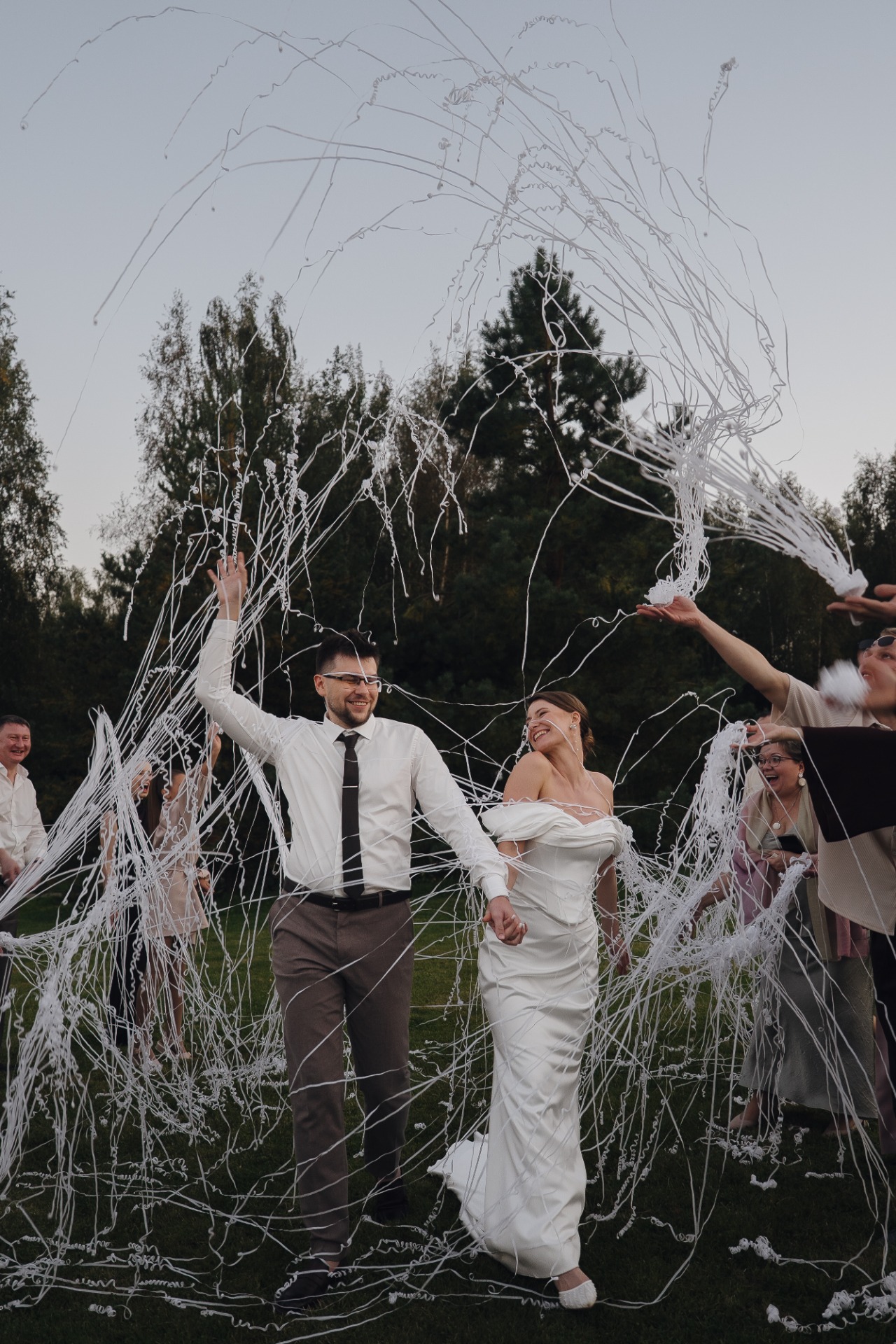 Выездная регистрация проходила в загородном клубе, и наша арка выглядела словно в сериале. В завершение вечера у нас был торт, красивый серпантин, книга пожеланий от гостей и фотографии на полароид.