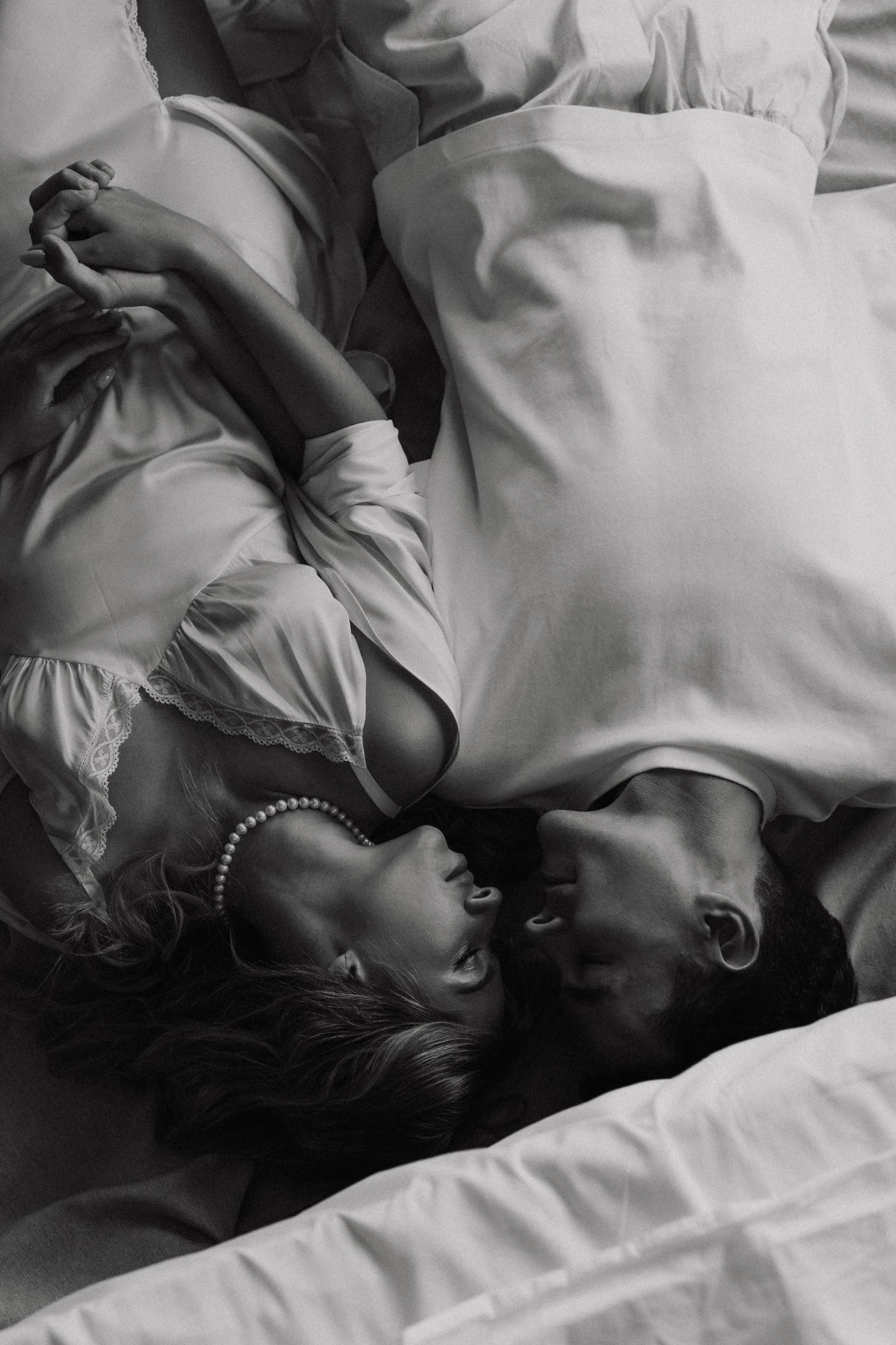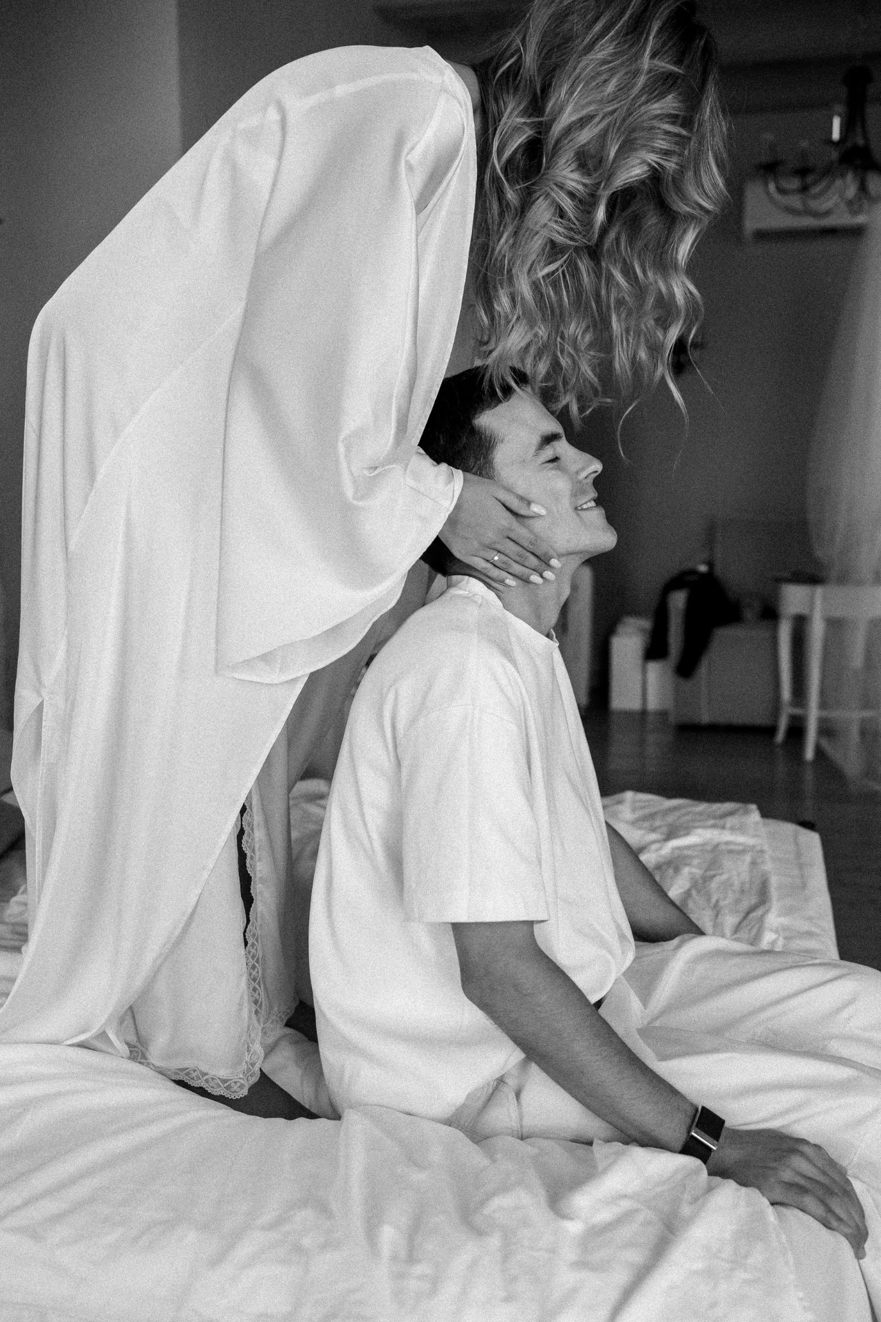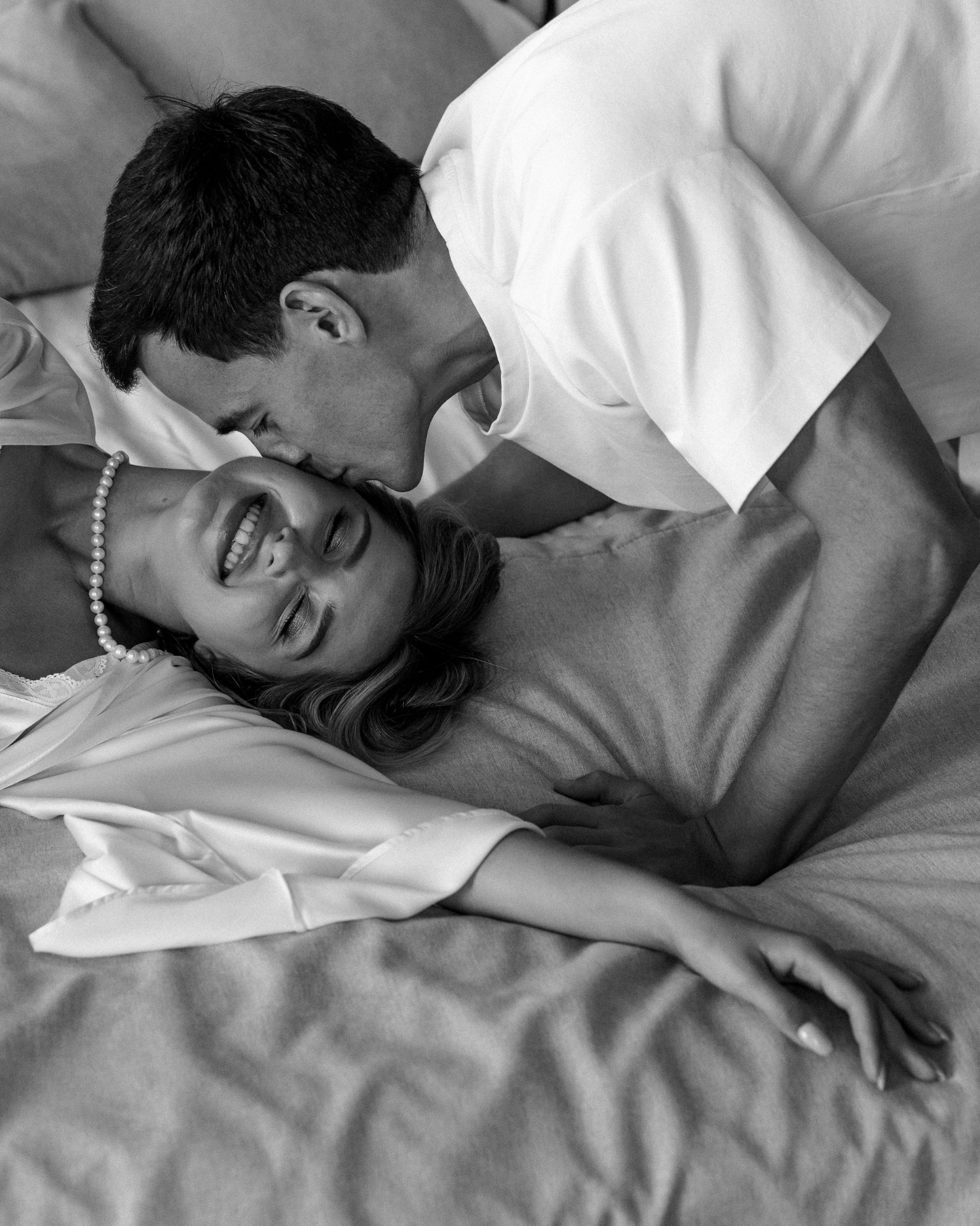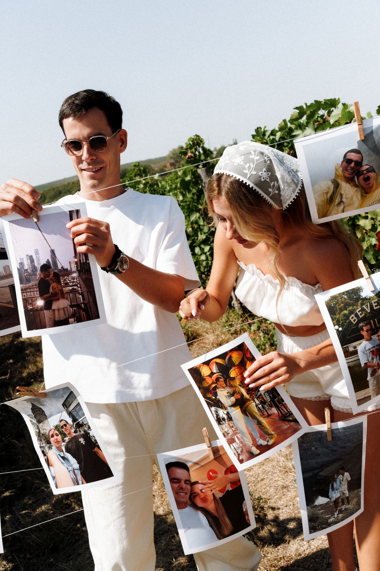 Первым образом для утренней съёмки стало будуарное платье, а после я сменила его на шорты и бандану. Вова выбрал для себя футболку и льняные брюки.