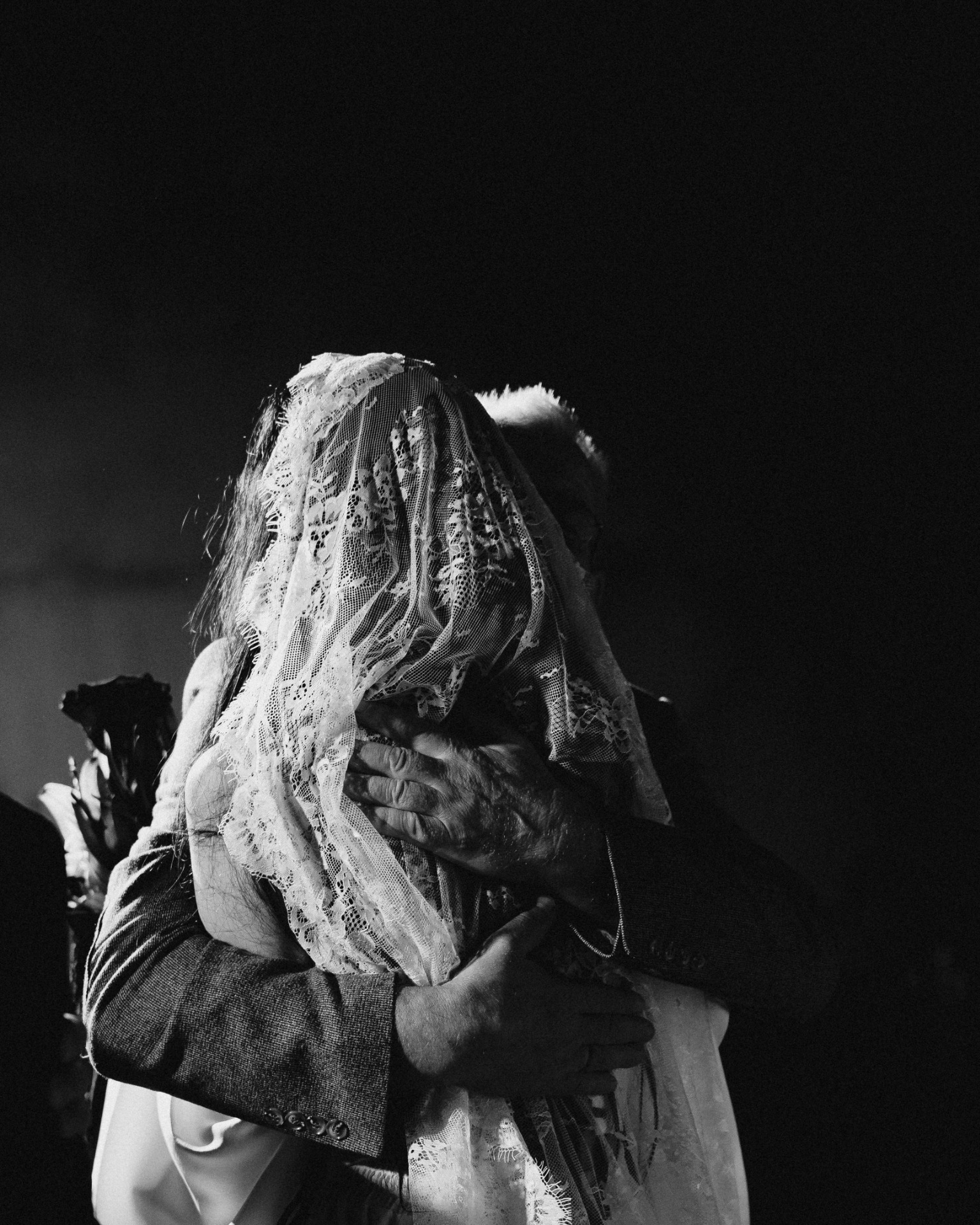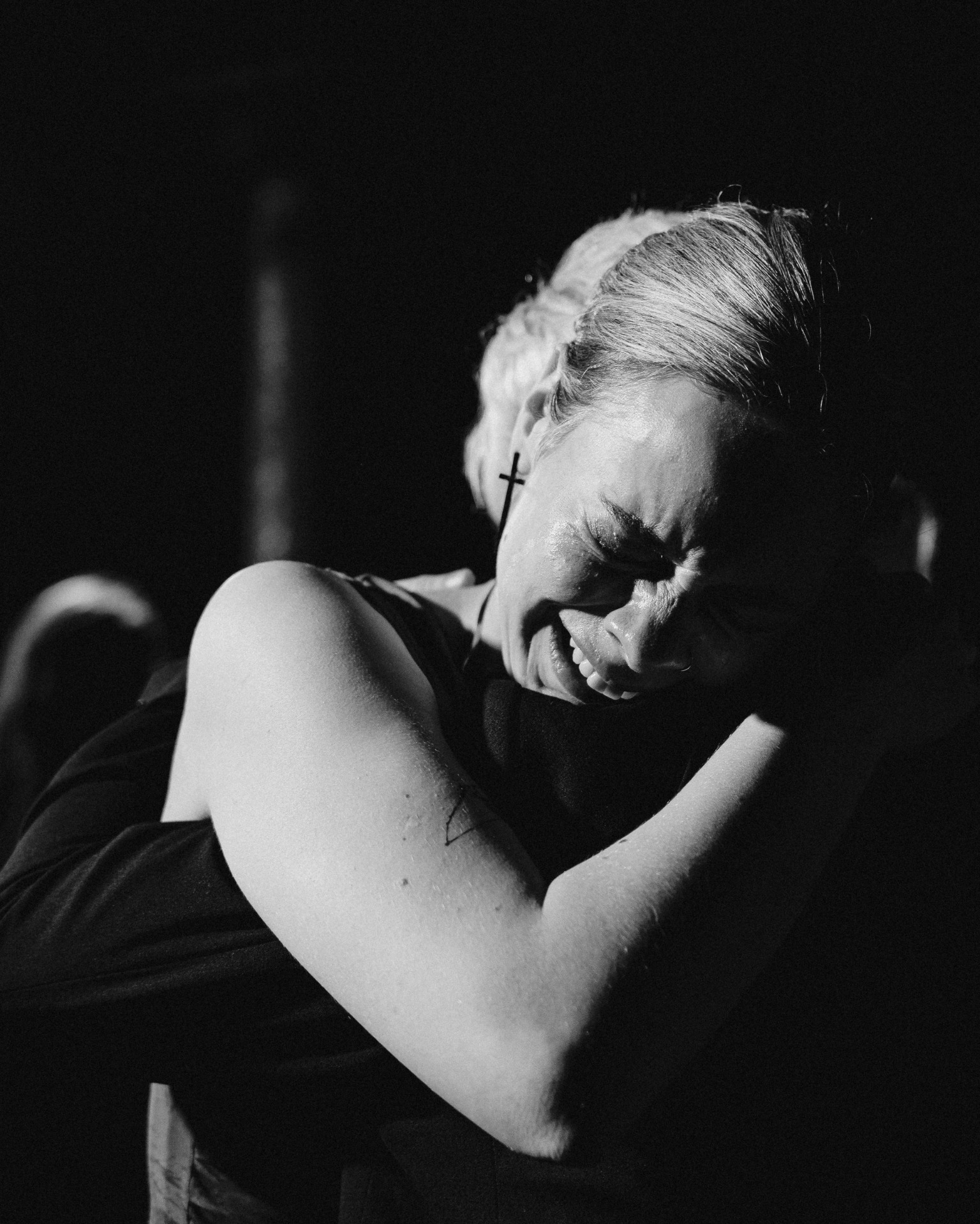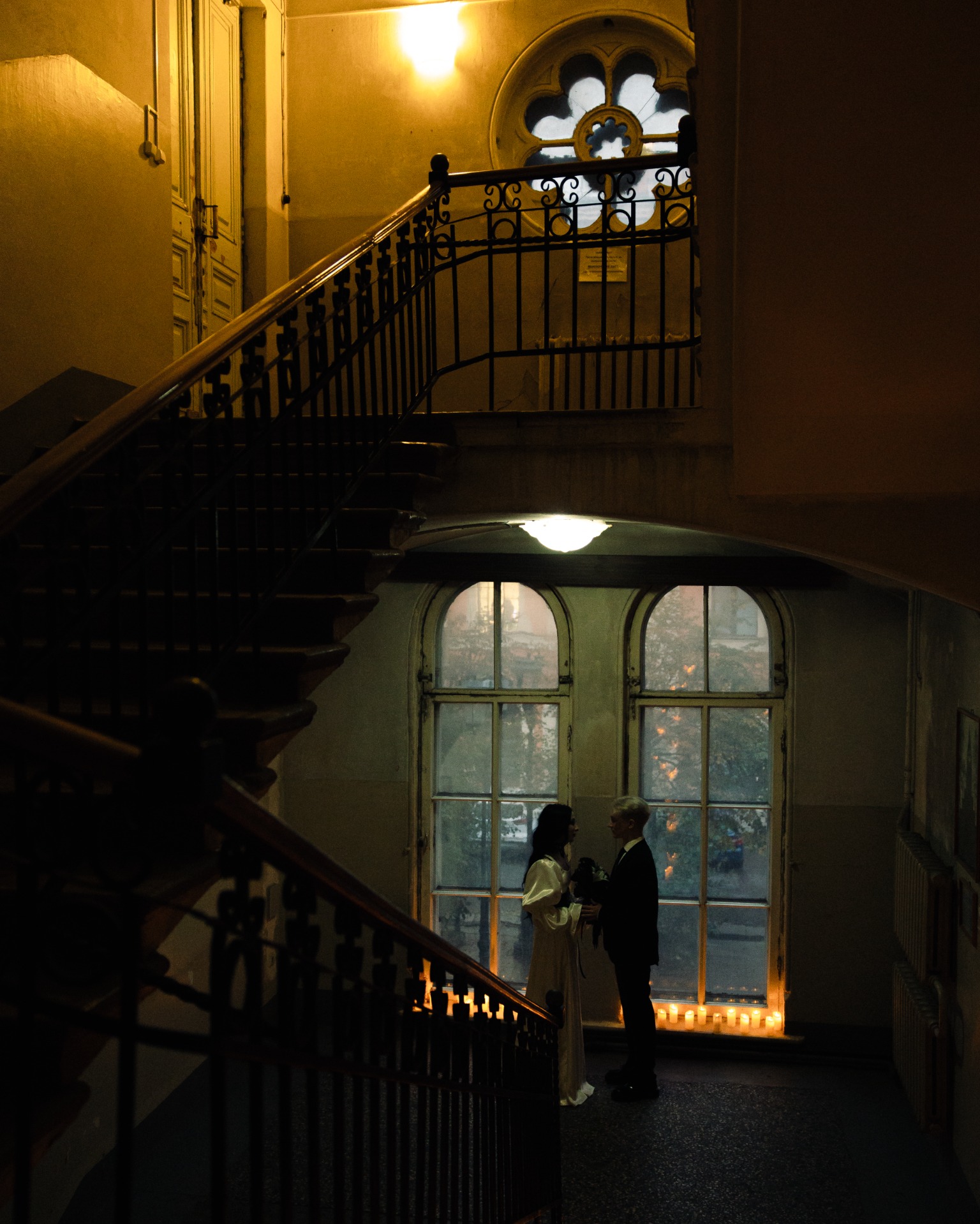Сперва был welcome для гостей, после чего началась церемония. Под лучом света в тёмном зале я, жених, вышел к алтарю. Затем ко мне со спины подошла невеста, и я впервые увидел её в свадебном платье. С трясущимися руками мы произнесли друг другу трогательные слова клятвы, обменялись кольцами и поцеловались.