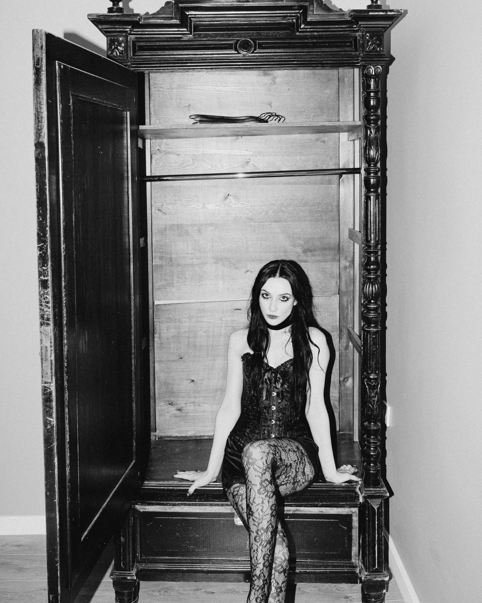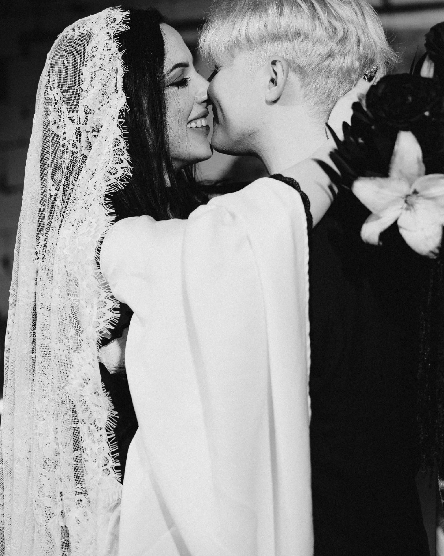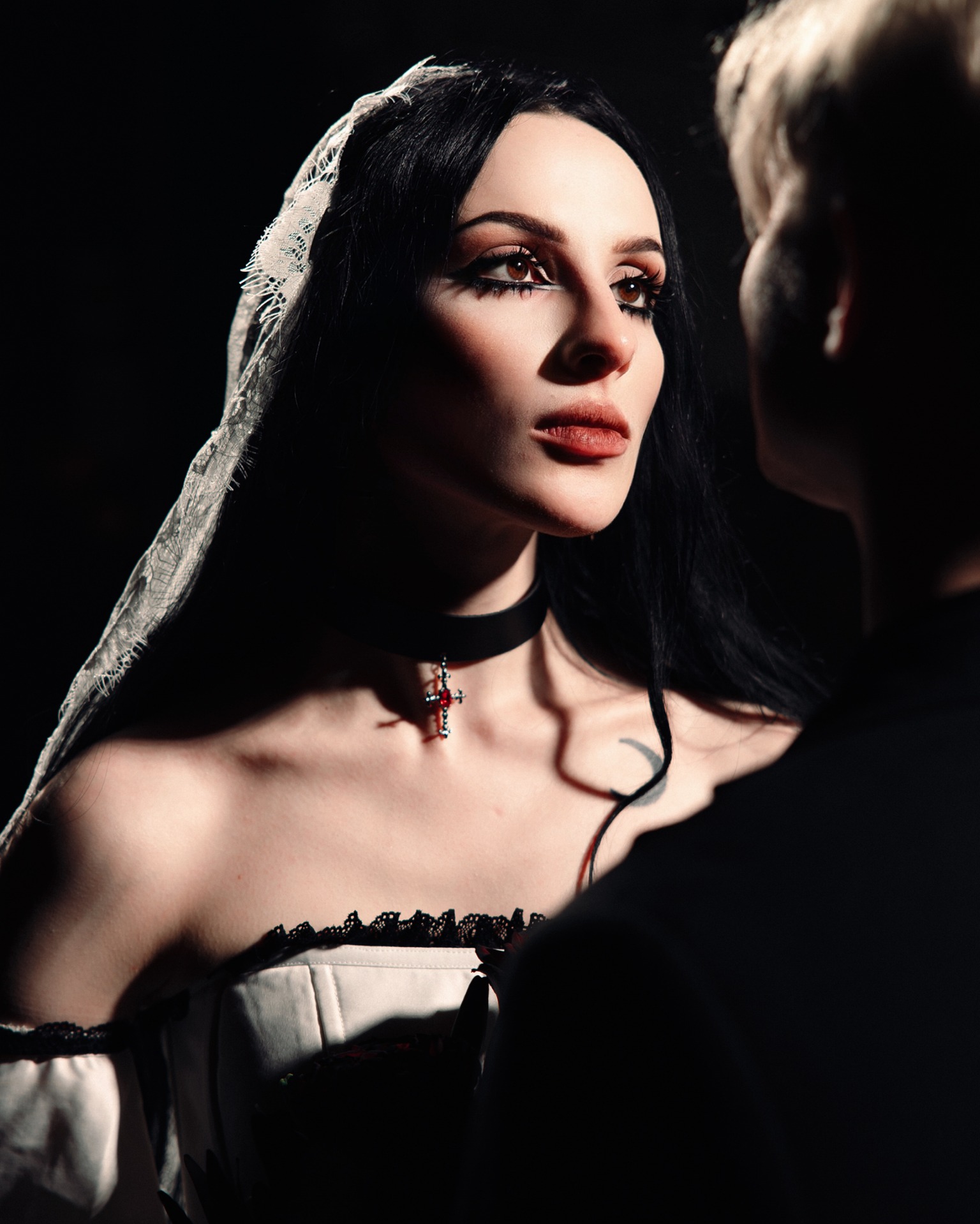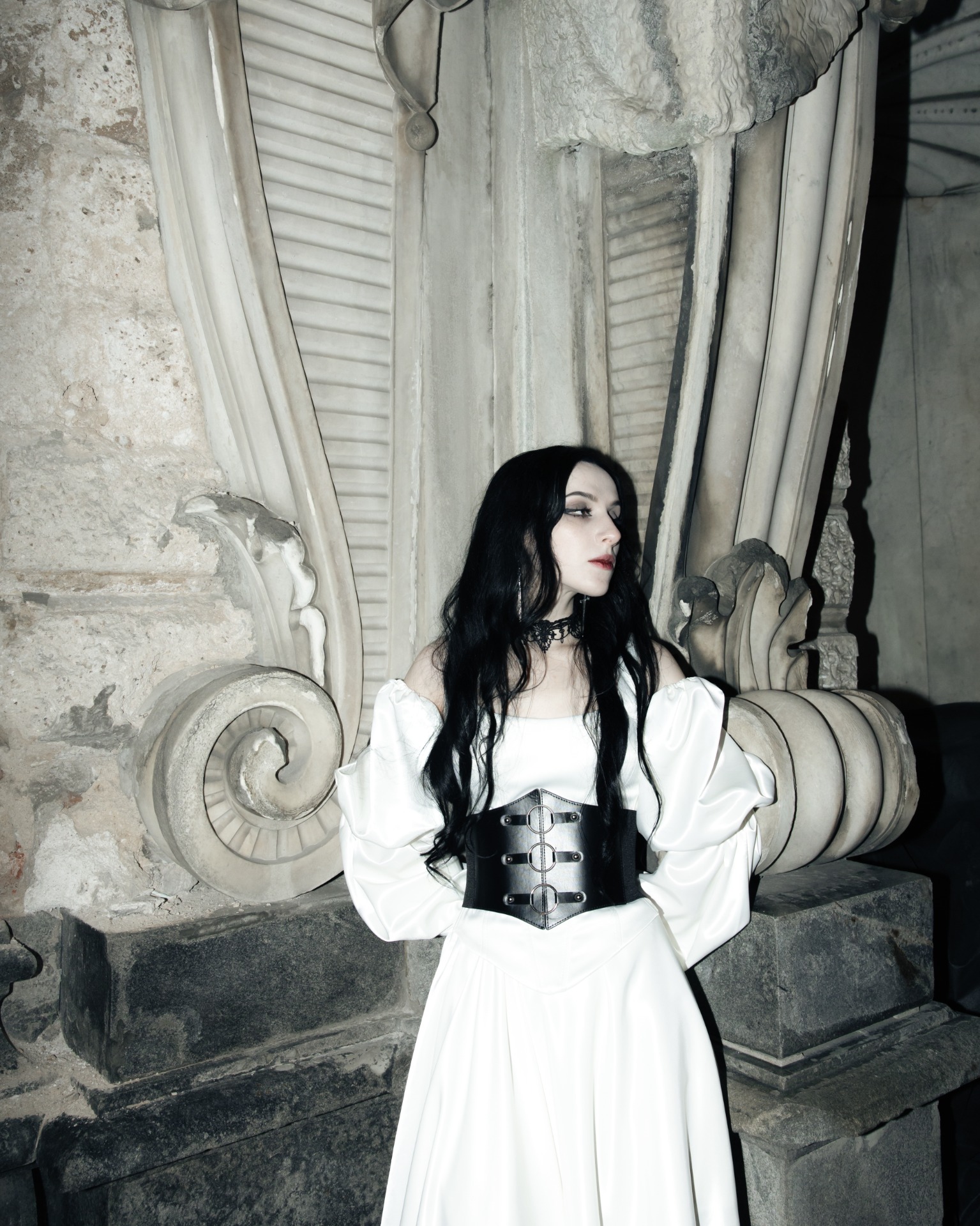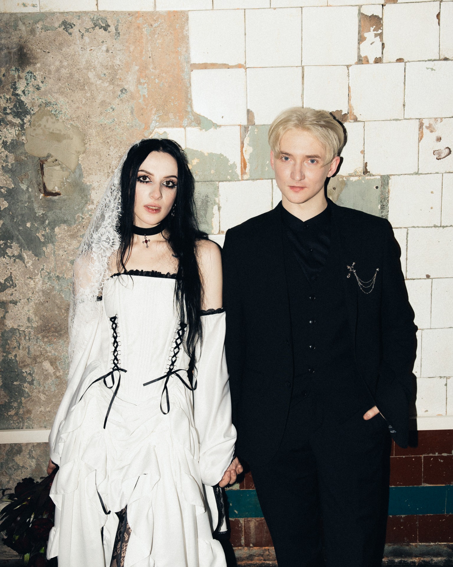 Образ невесты должен был стать воплощением её готической эстетики. В свадебных салонах такое платье найти не удалось, поэтому его делали на заказ. В образ входили: белая юбка с рюшами, которая спереди была короче, а сзади длиннее, широкие длинные белые рукава с элементами чёрного кружева, чёрные кружевные колготки, чёрные детали на корсете и юбке, белая кружевная фата, туфли с крестом на каблуке и украшение.
