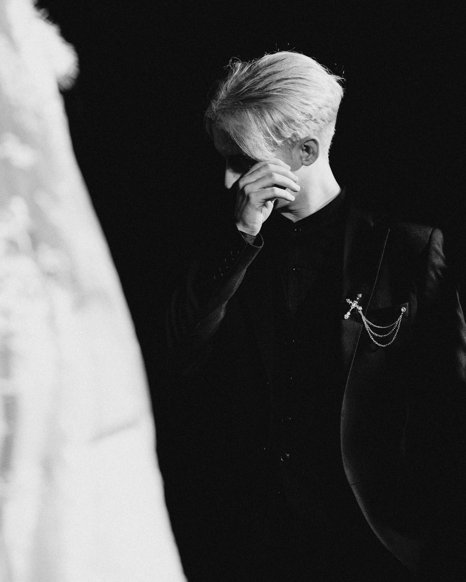 Мой образ был в стиле total black: костюм-тройка, туфли на массивной подошве, рубашка с воротником-стойкой. Из аксессуаров была брошь с крестом. Я осветлил свои тёмно-русые волосы и стал блондином ради этого дня. Когда мы только начинали встречаться, у меня тоже был блонд, и таким образом я сделал отсылку к началу наших отношений. И просто порадовал невесту, потому что ей этот образ нравится.