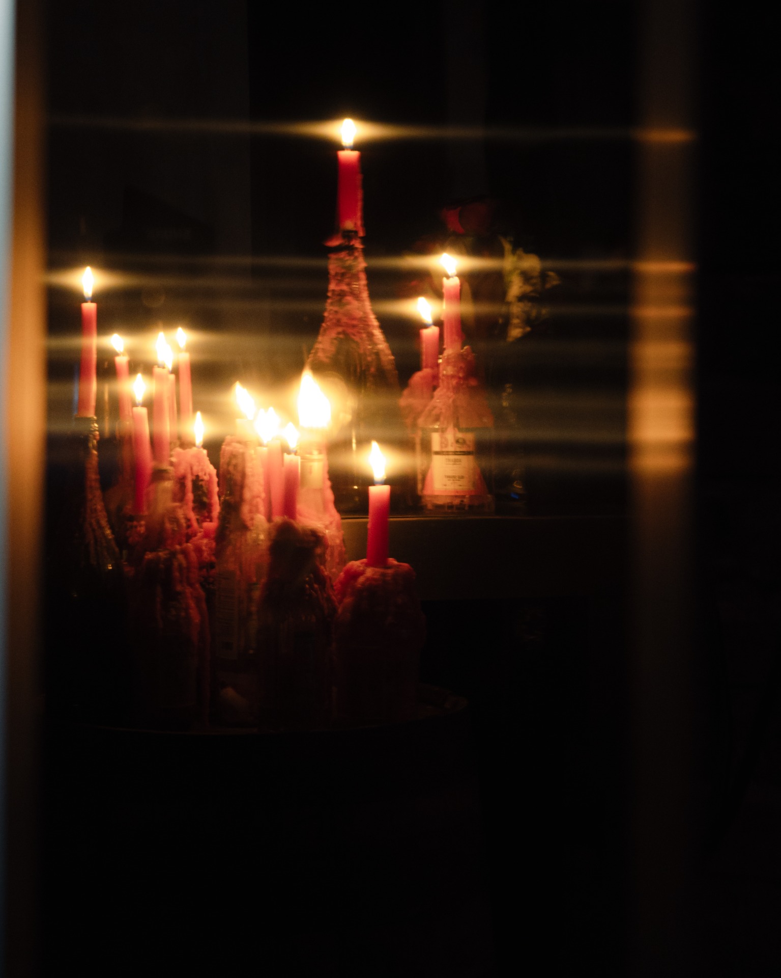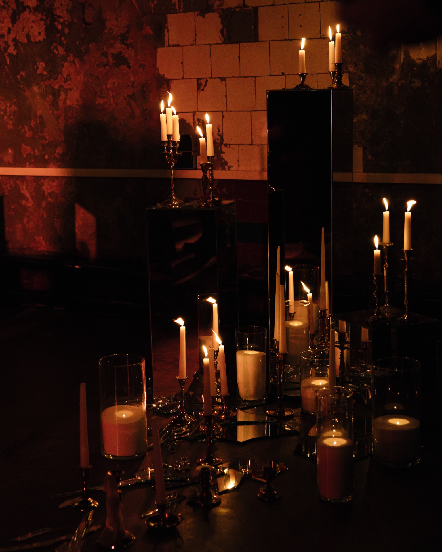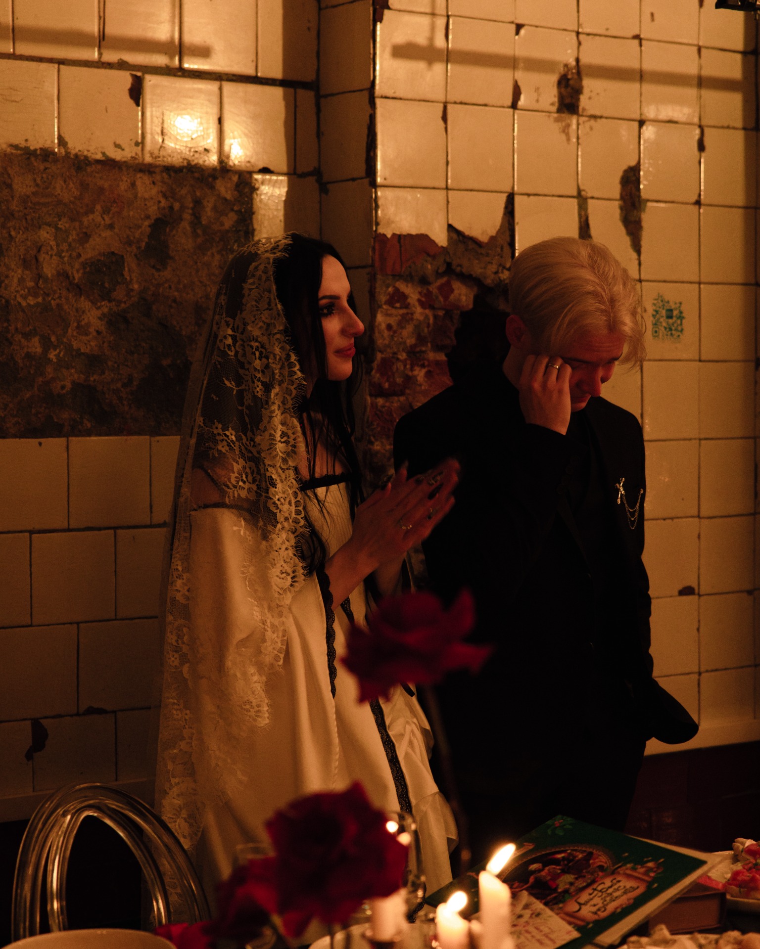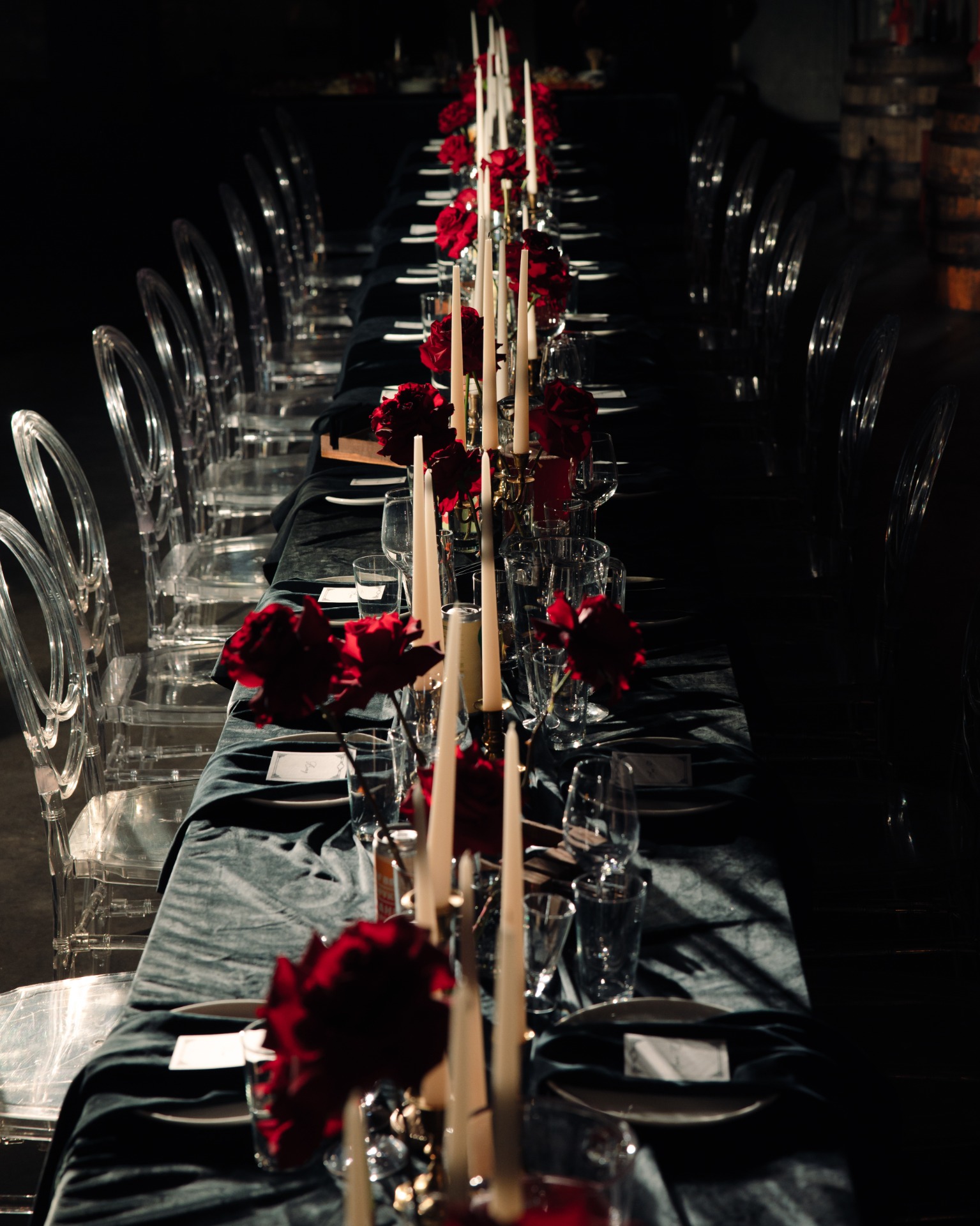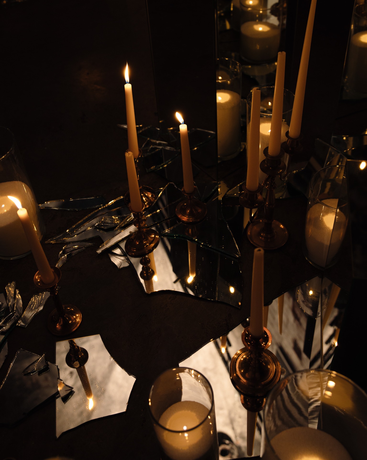 С декоратором мы занялись созданием нужного антуража. Придумали, как будет выглядеть зона выездной церемонии: вместо арки с цветами выбрали импровизированный алтарь с большим количеством горящих свечей и осколков зеркала, которые отражали свет и создавали нужную картину. На столах были чёрные скатерти и свечи, а акцентами служили красные розы.