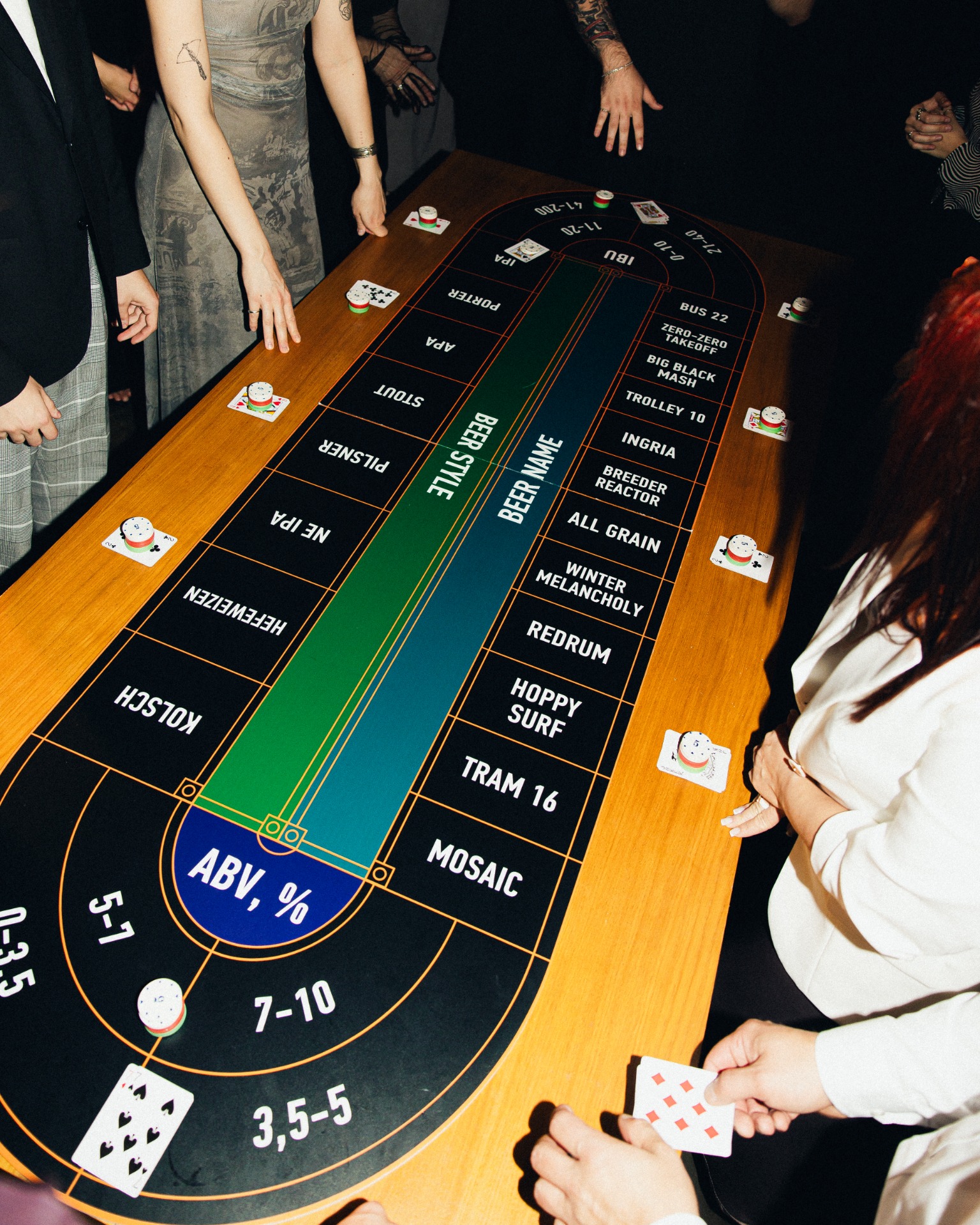 После церемонии все сели за стол. Начались поздравления от друзей и родственников, интерактивы и танцы. Среди развлечений было пивное казино с угадыванием напитков и алкогольный конкурс с тематикой карт Таро. В Таро мы не верим, но обыграли это с юмором. Ещё был коллаж с различными фотографиями, мемами и ассоциациями о нас, который гости клеили сами.