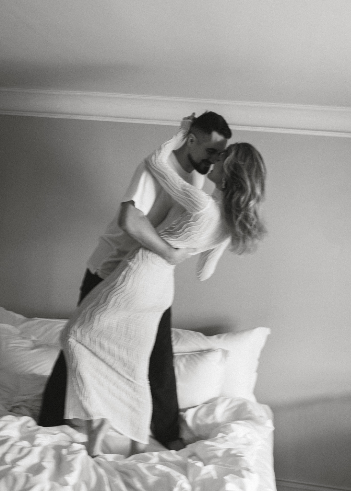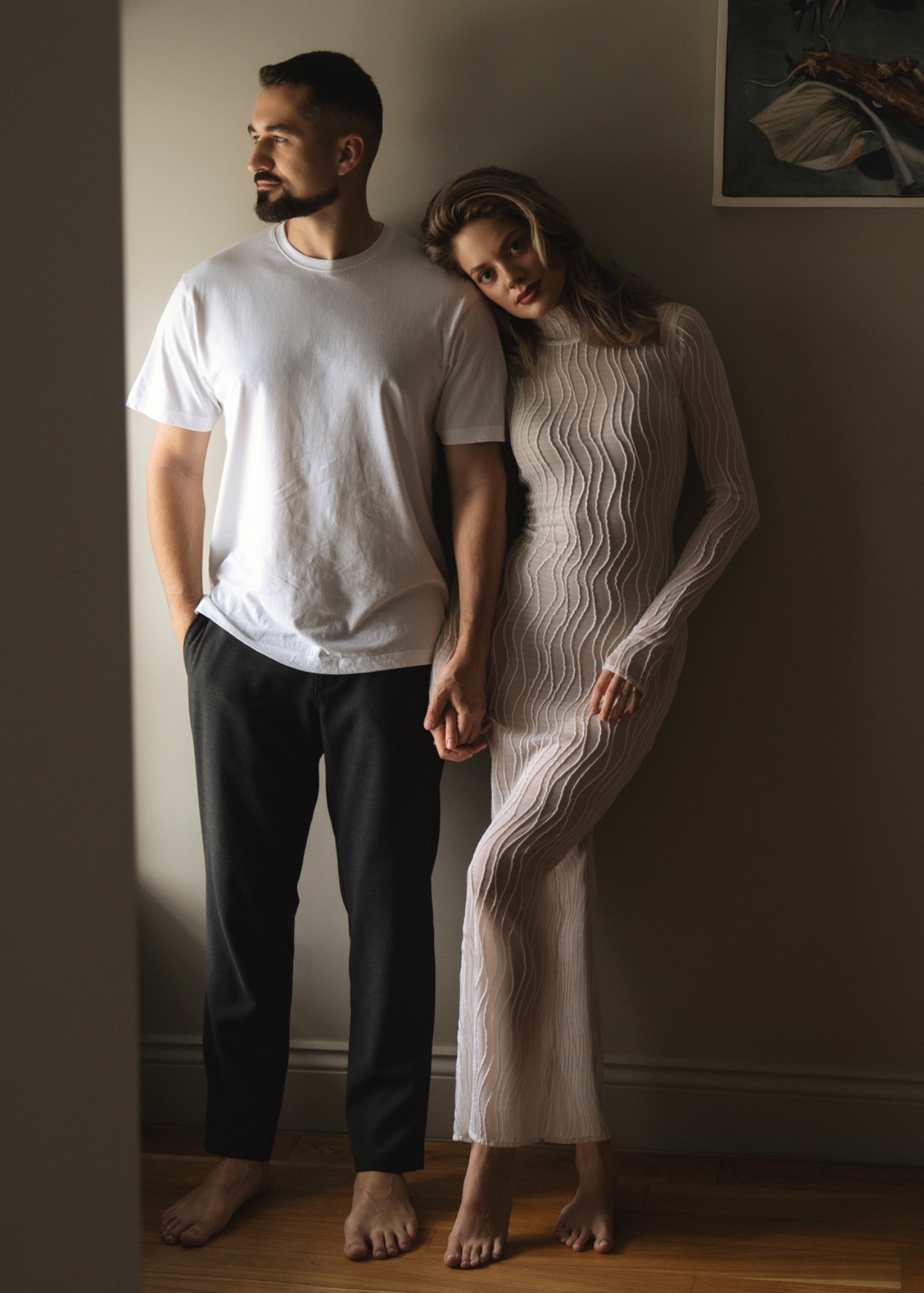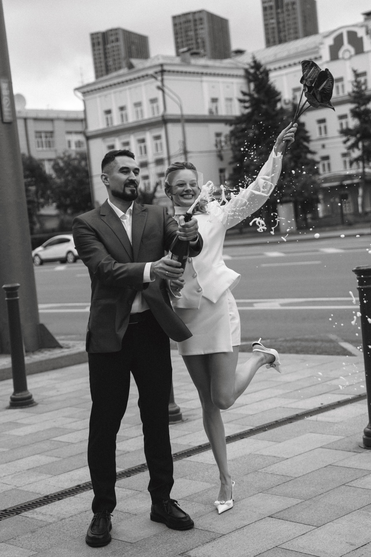 С образом жениха всё было проще: в чёрном он планировал быть на свадьбе, поэтому для росписи мы выбрали нарядный коричневый пиджак и классические чёрные брюки.