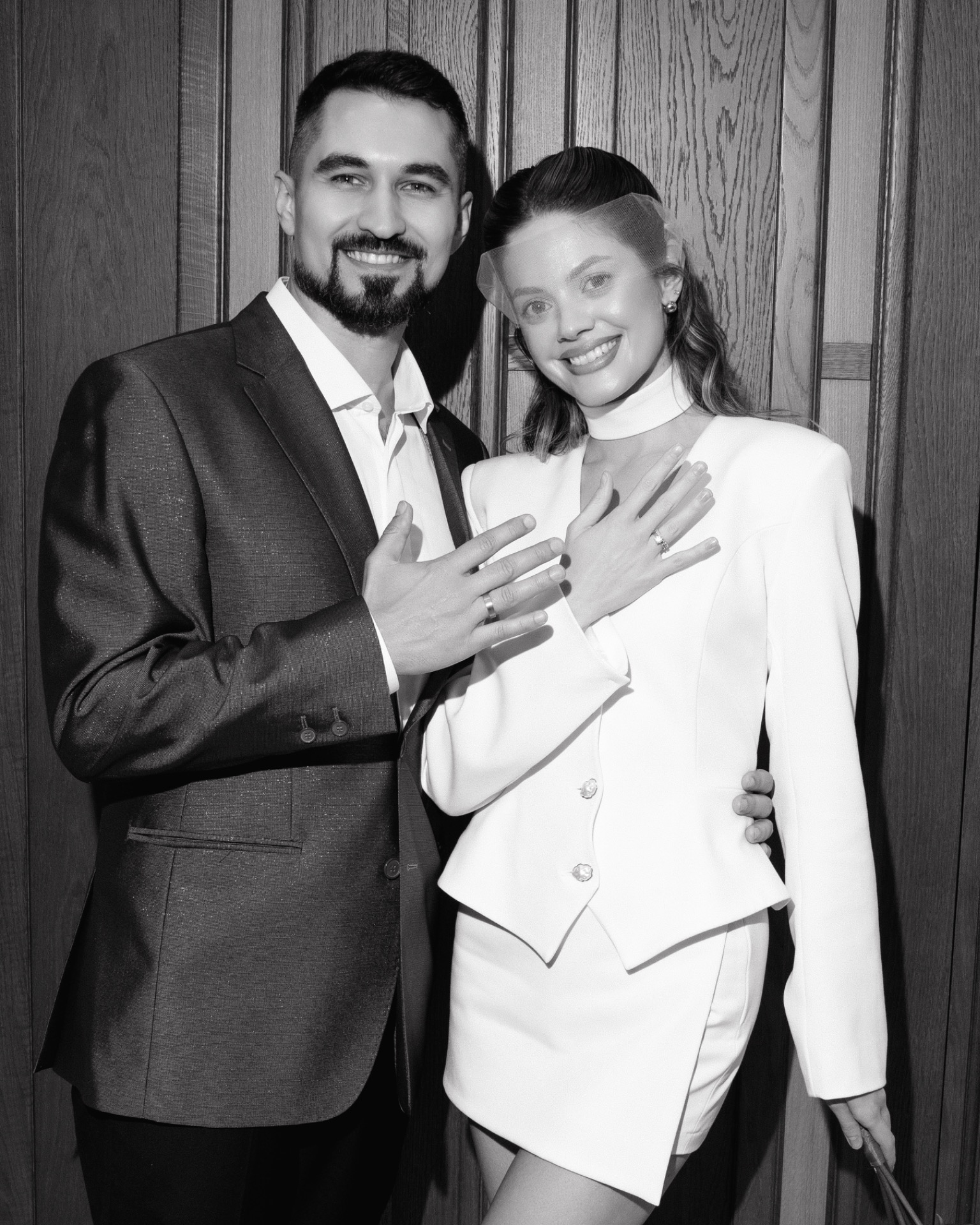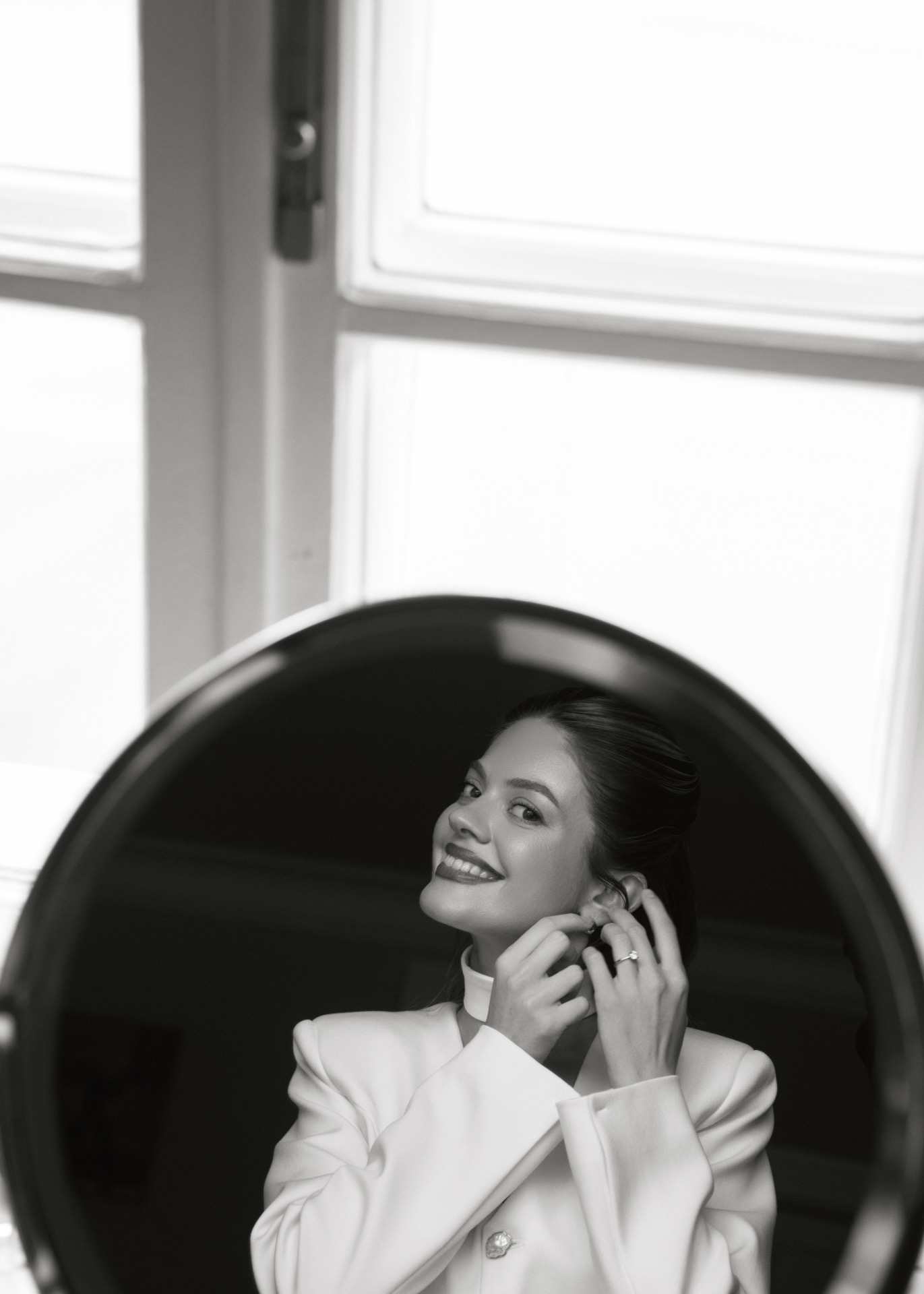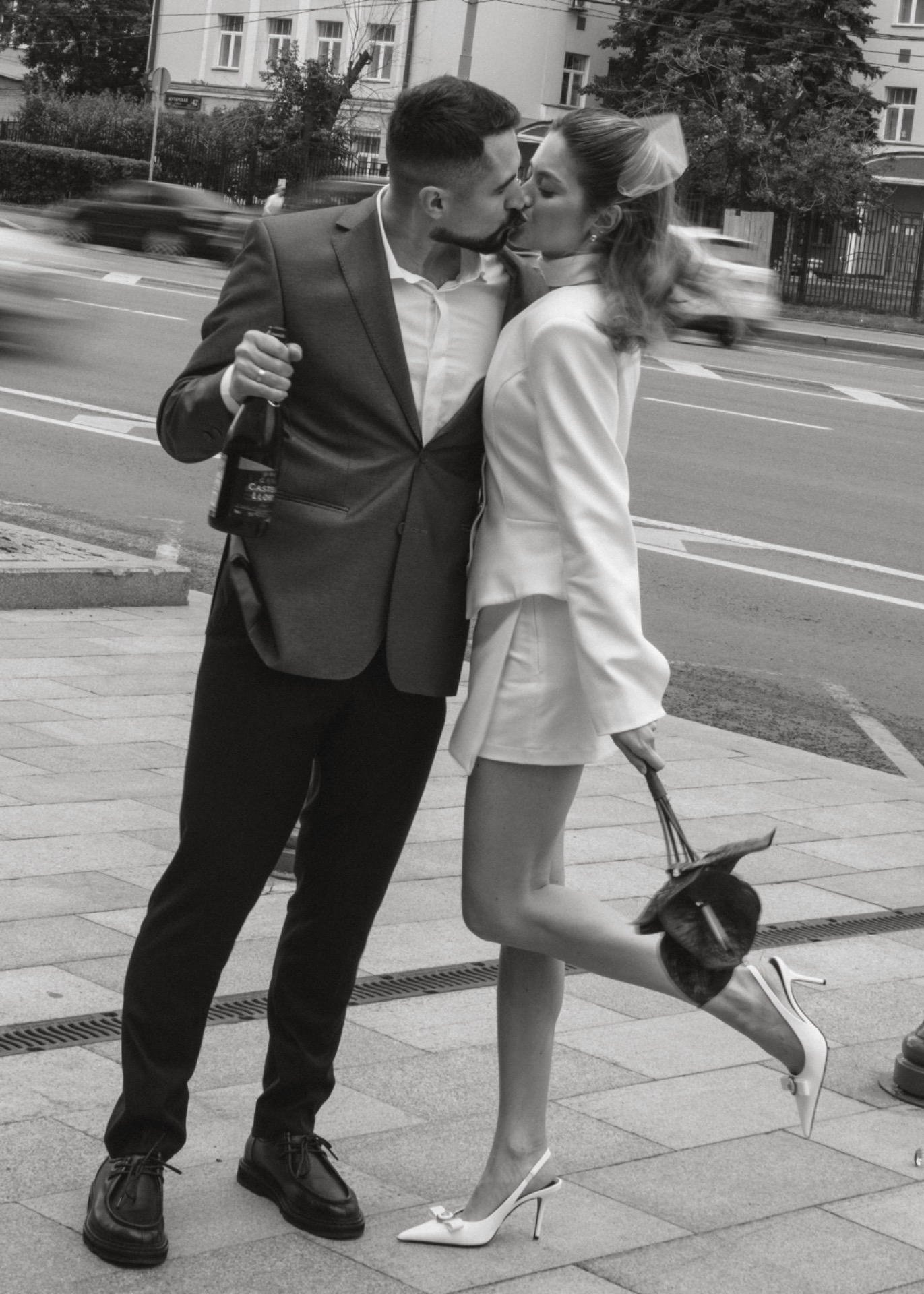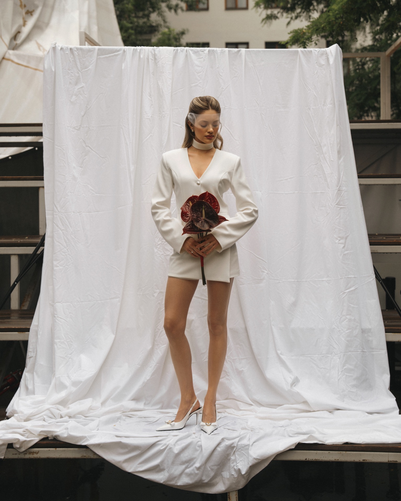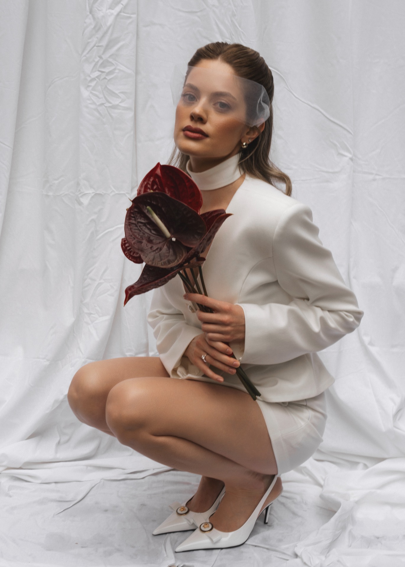 Для ЗАГСа я выбрала костюм с приталенным жакетом и юбкой-шортами от бренда Insomnia.clths. Образ дополнили туфли Versace и невесомая вуаль — лёгкий акцент, но очень эффектный.