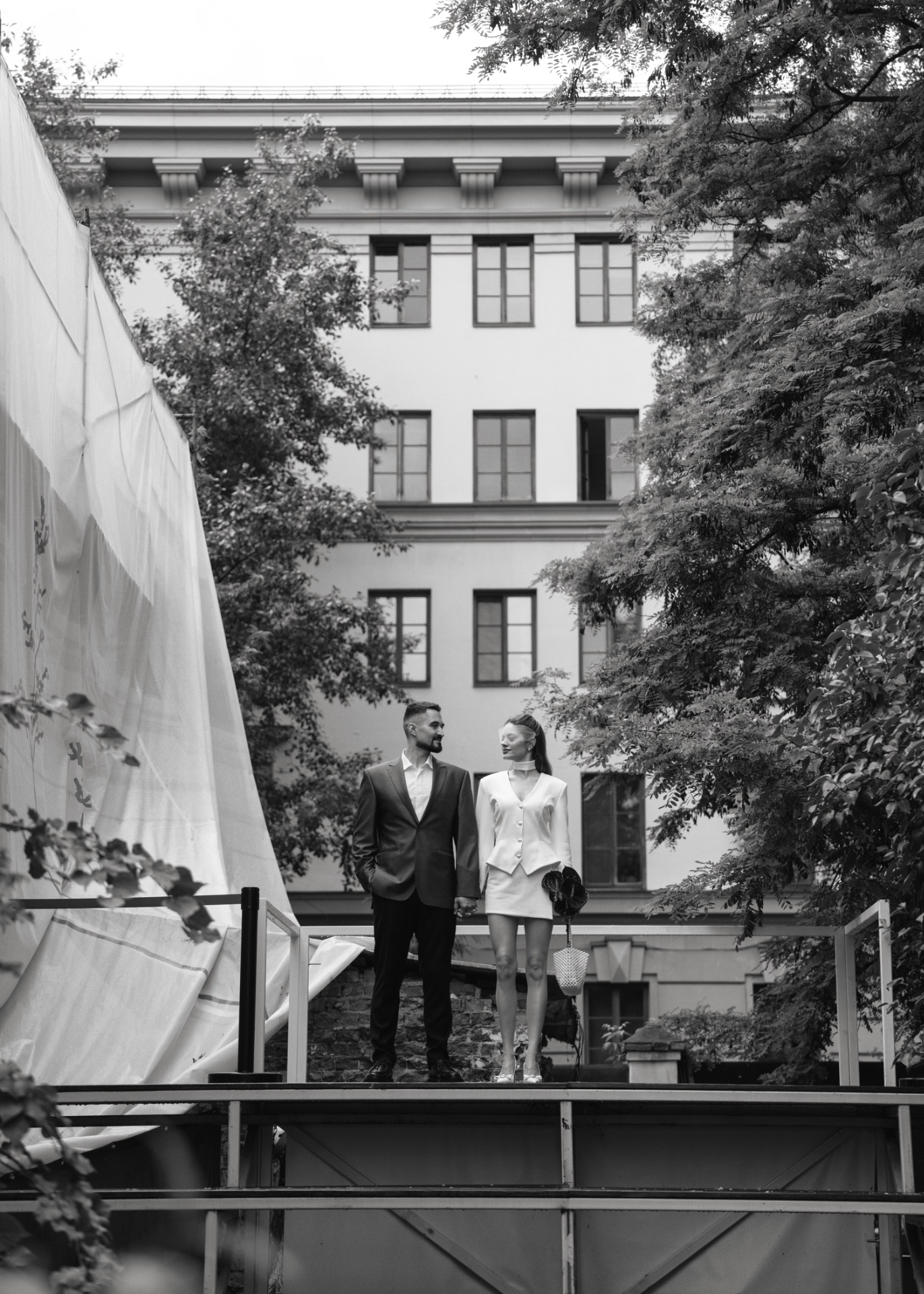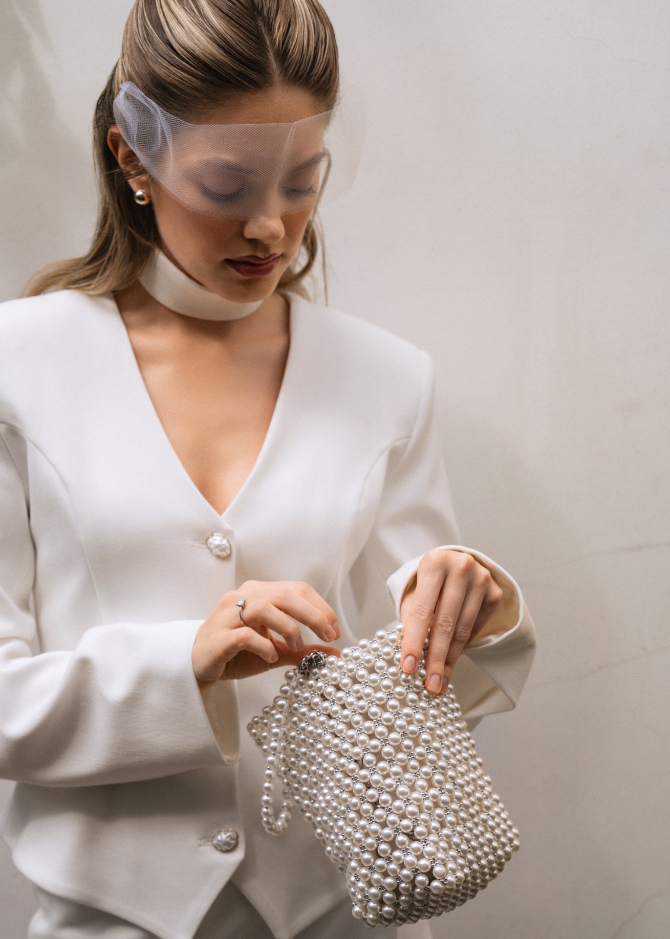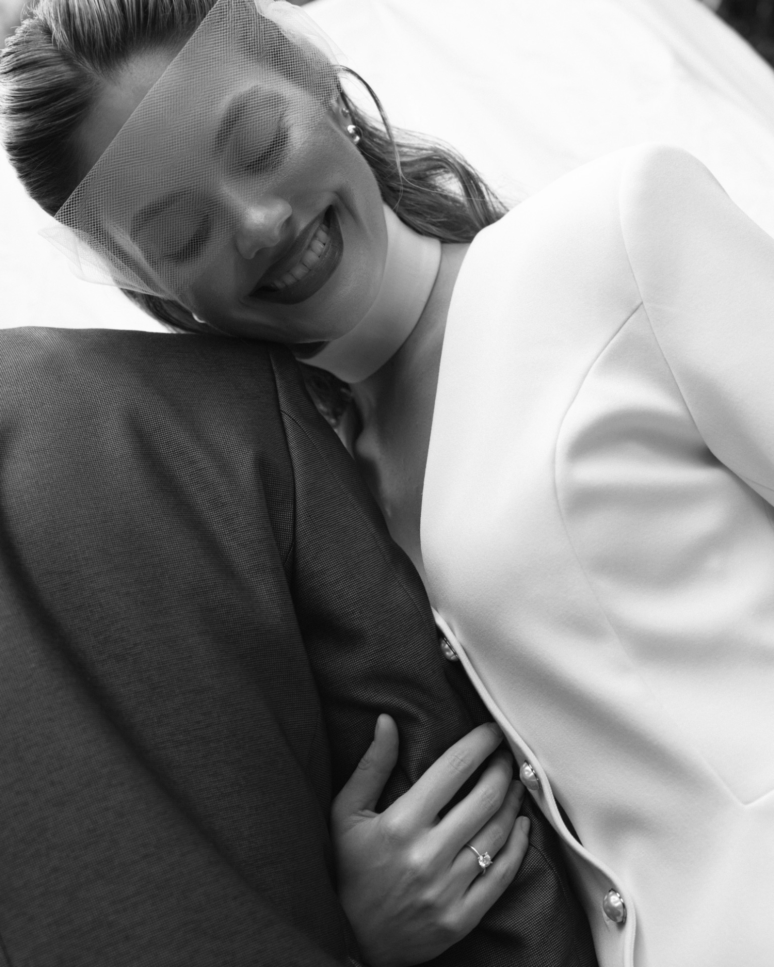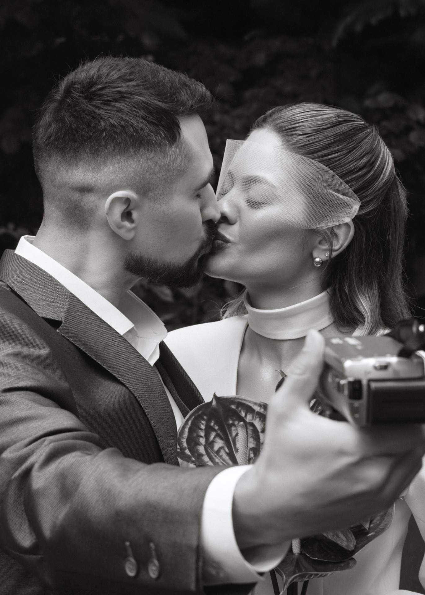 Для ЗАГСа я выбрала костюм с приталенным жакетом и юбкой-шортами от бренда Insomnia.clths. Образ дополнили туфли Versace и невесомая вуаль — лёгкий акцент, но очень эффектный.