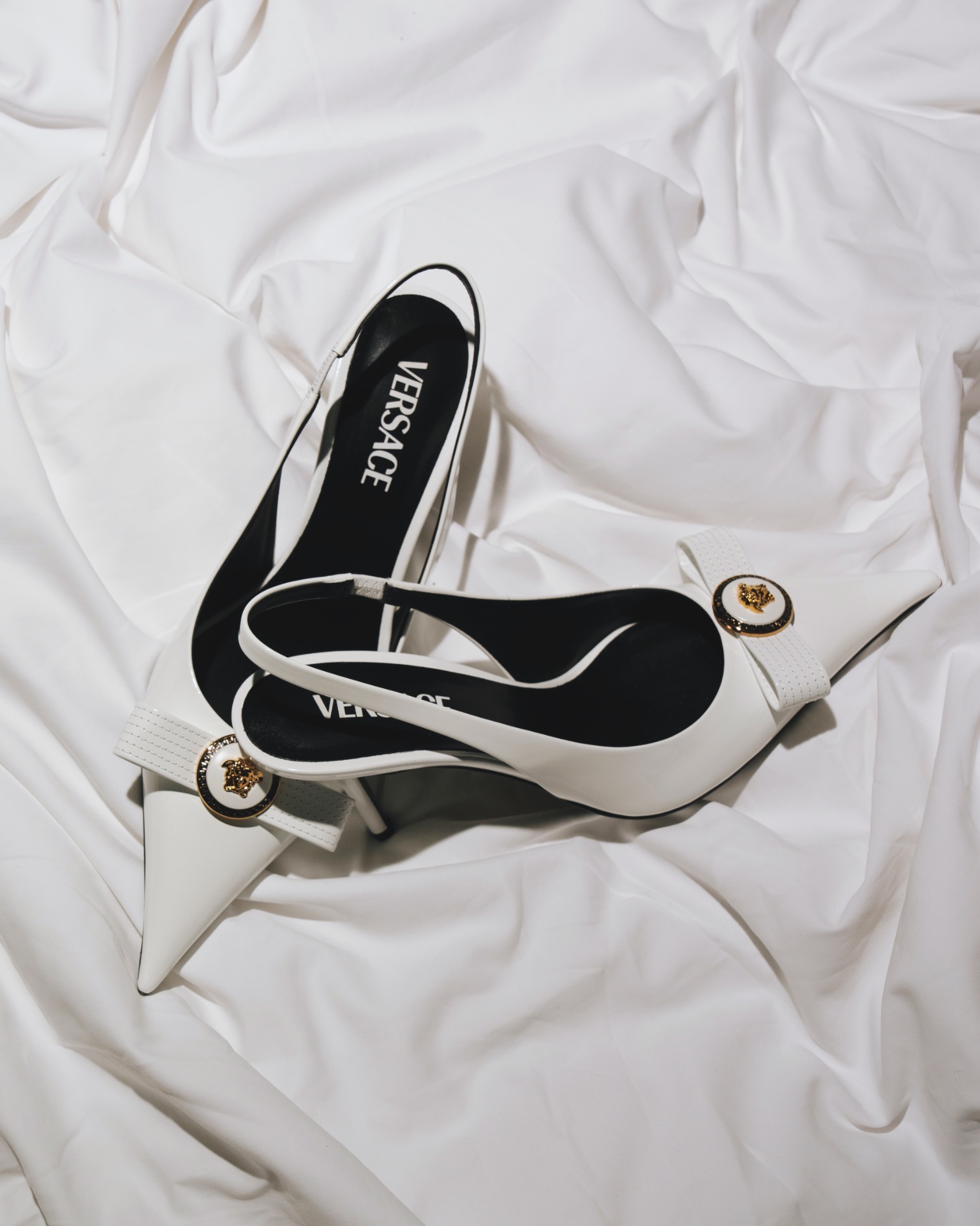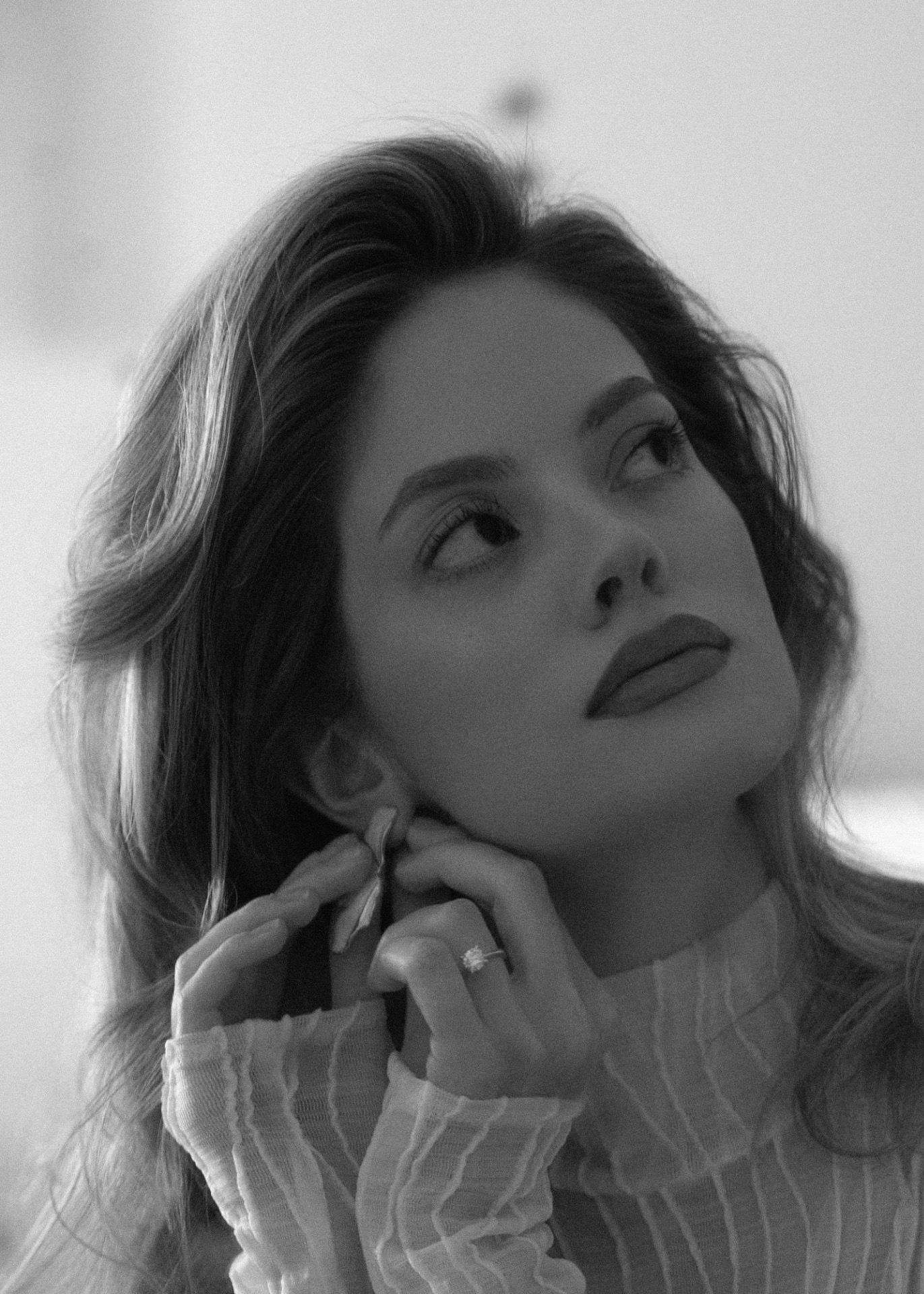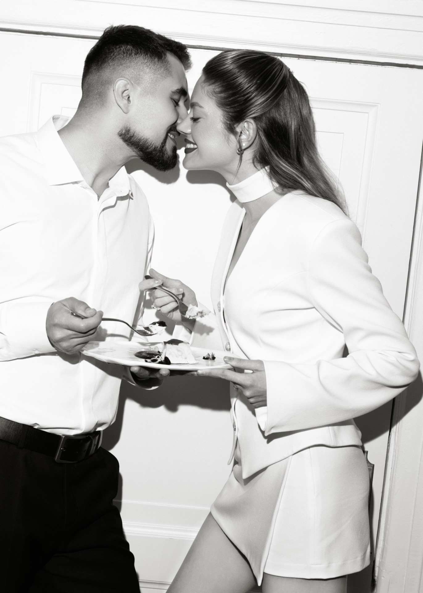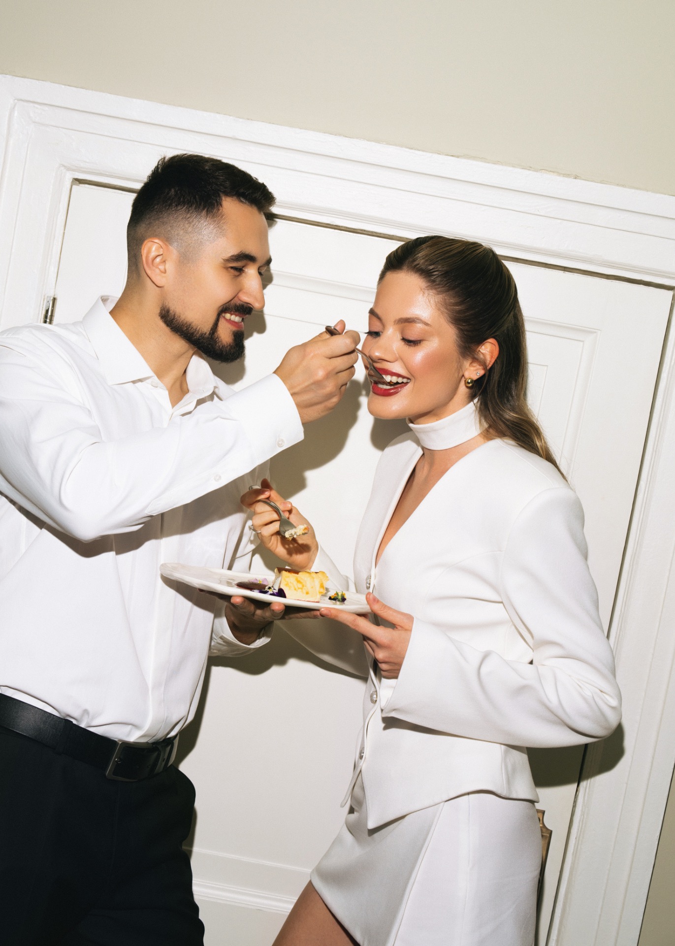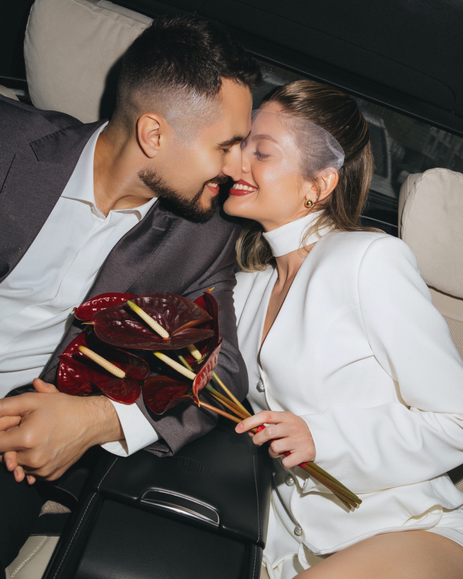 Для ЗАГСа я выбрала костюм с приталенным жакетом и юбкой-шортами от бренда Insomnia.clths. Образ дополнили туфли Versace и невесомая вуаль — лёгкий акцент, но очень эффектный.