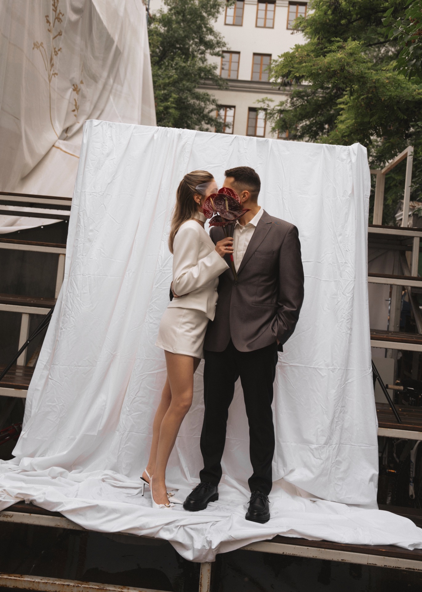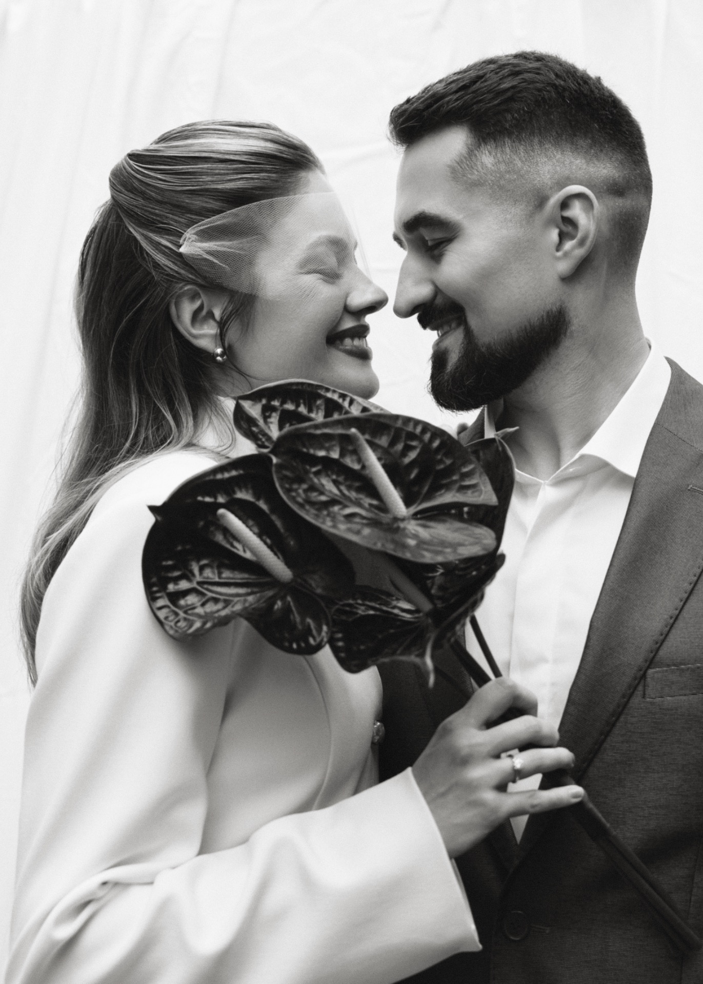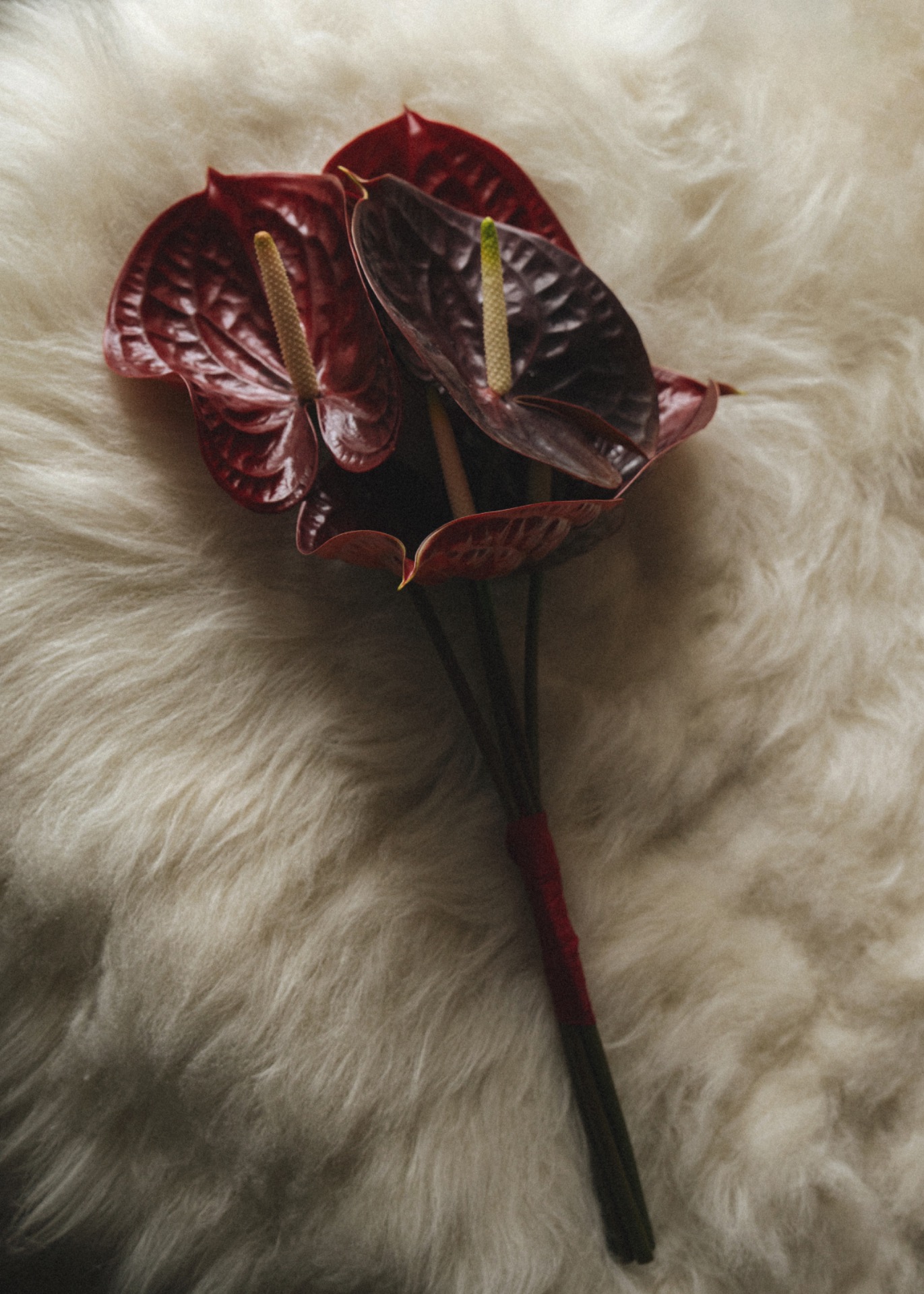Я точно знала, что у меня не будет классического букета, поэтому выбрала бордовые антуриумы. Они идеально дополняли мой образ.