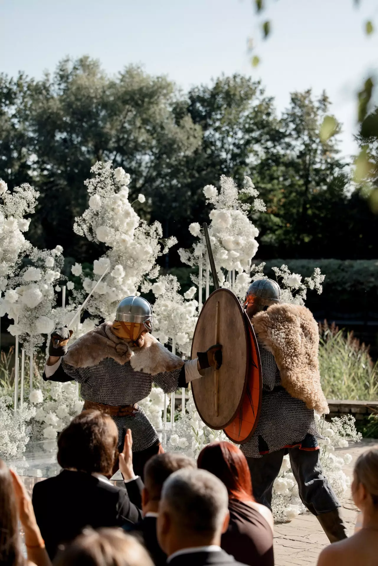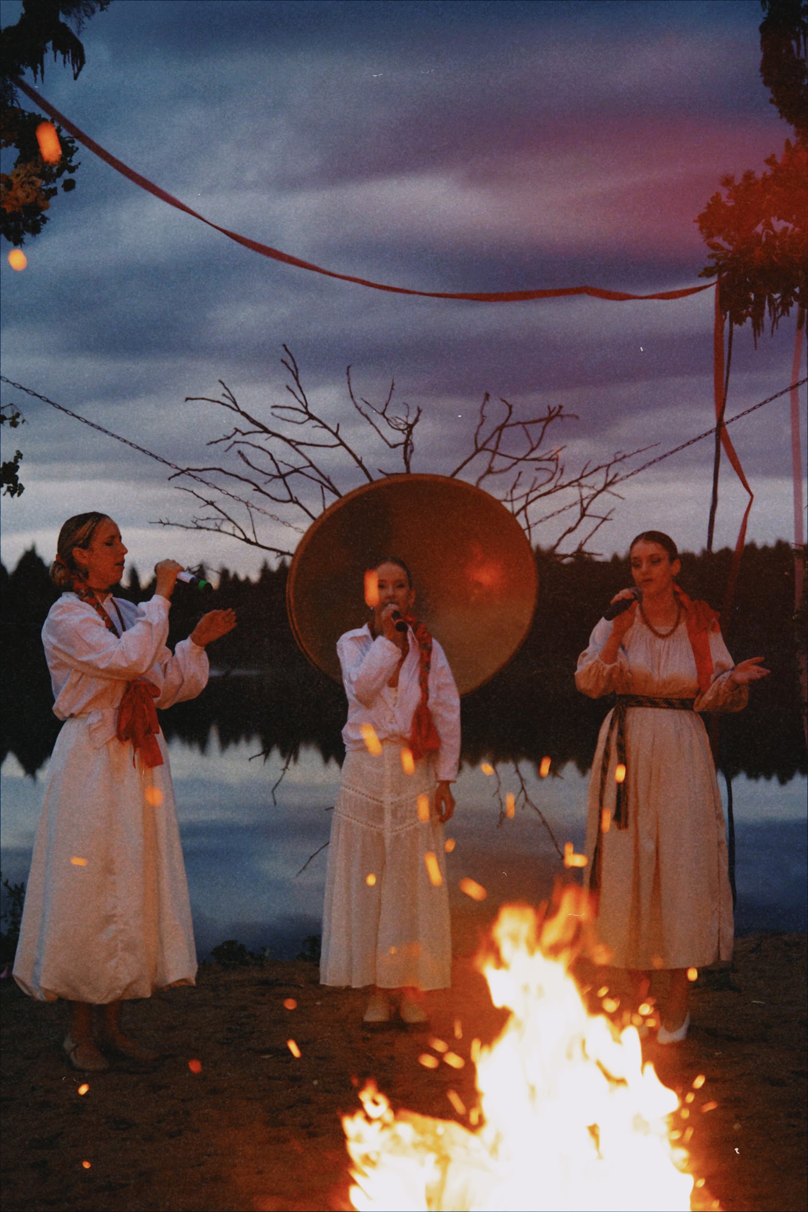 Тематика свадьбы тоже задаёт формат: на празднике в духе Ивана Купалы гости пели с фолк-ансамблем, водили хороводы у костра и запускали венки со свечами в озеро.