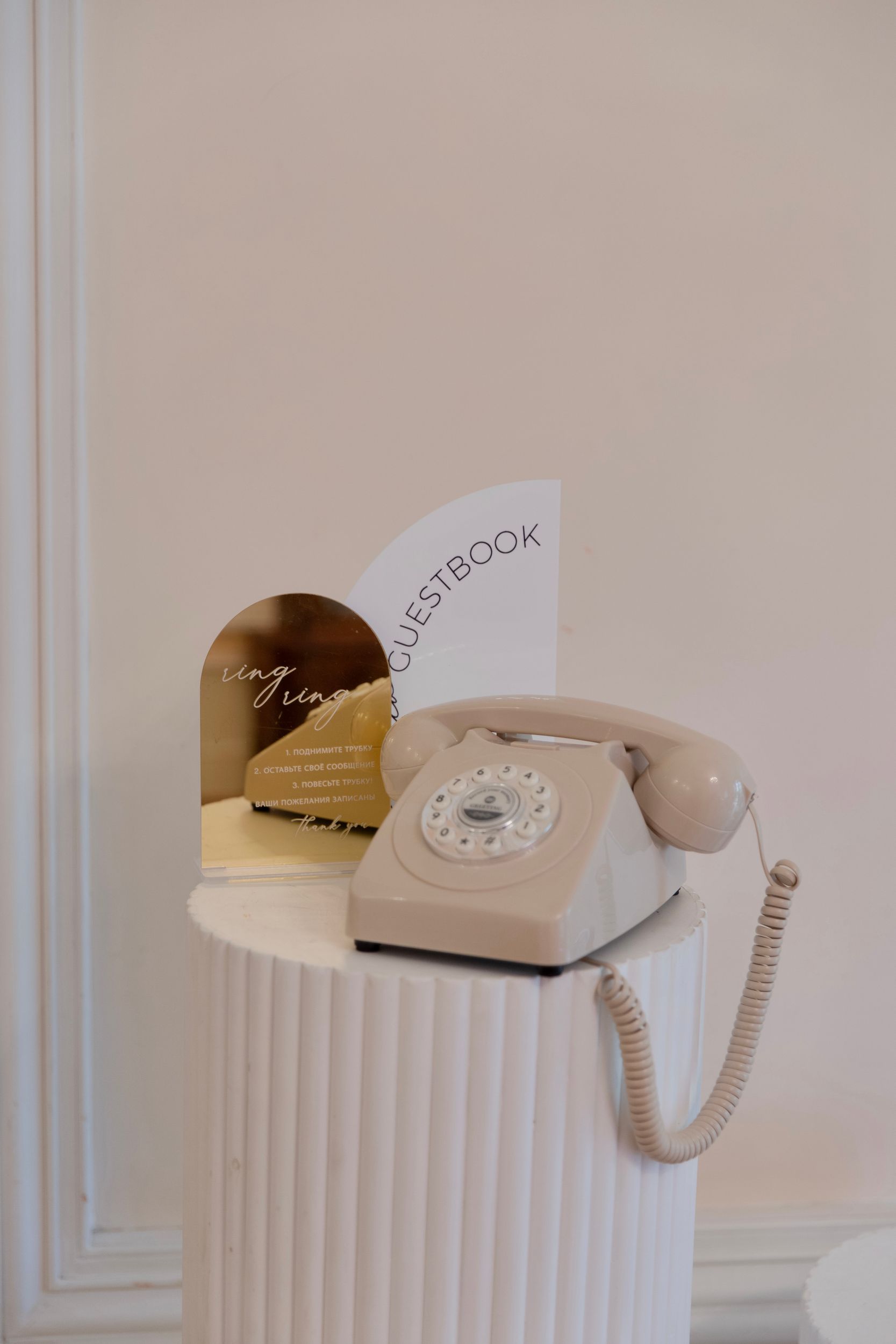 Телефон пожеланий: гости снимают ретро-трубку и оставляют голосовые сообщения на автоответчик пары: поздравления, смех, впечатления от дня. Переслушивать их после — отдельное удовольствие.