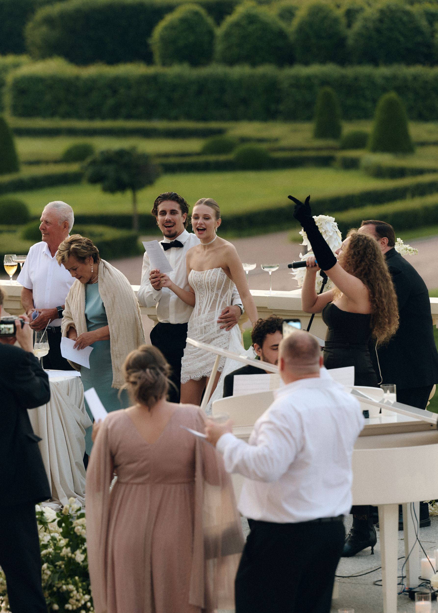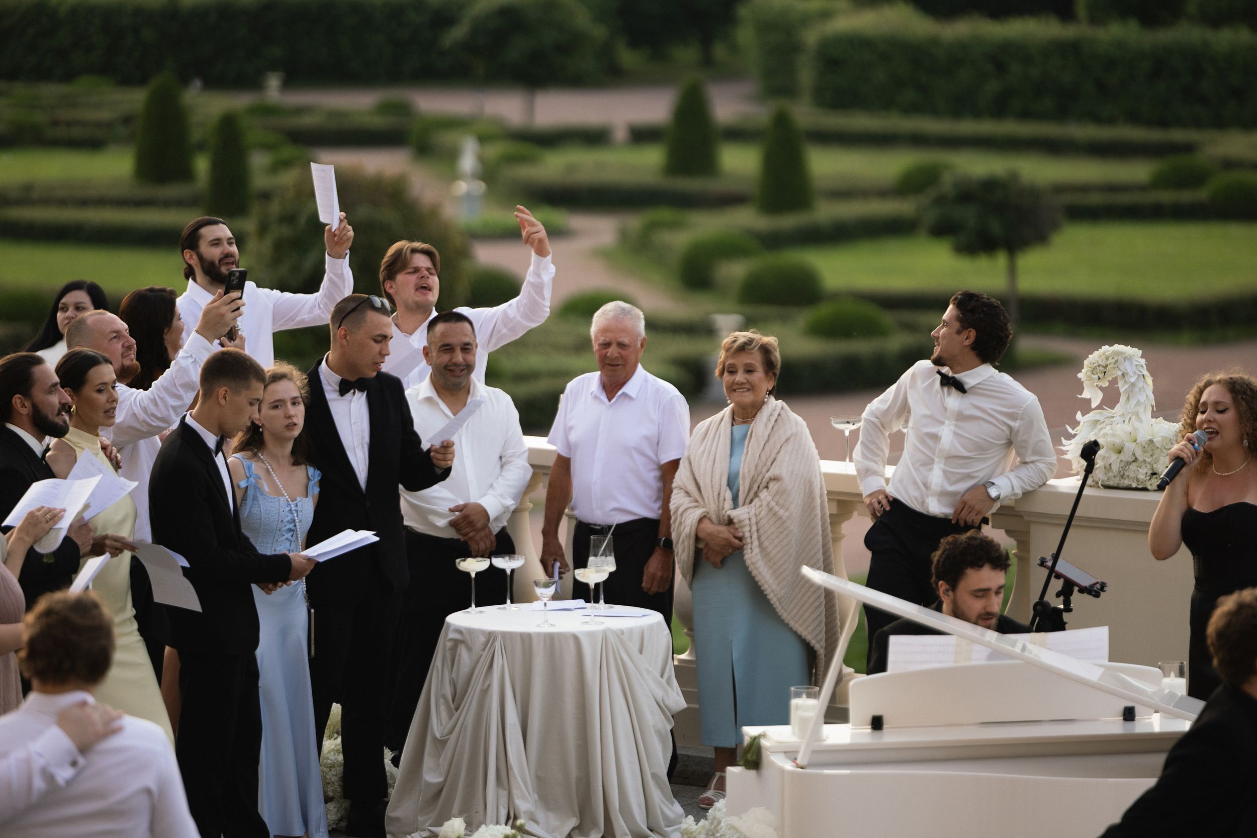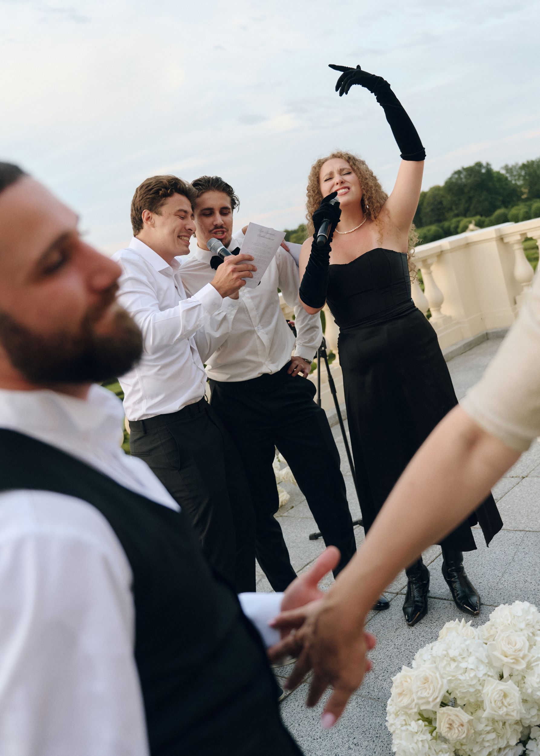 Пианино-караоке с текстами любимых песен пары — один из самых объединяющих форматов вечера. Гости поют вместе с музыкантом, атмосфера мгновенно становится камерной.