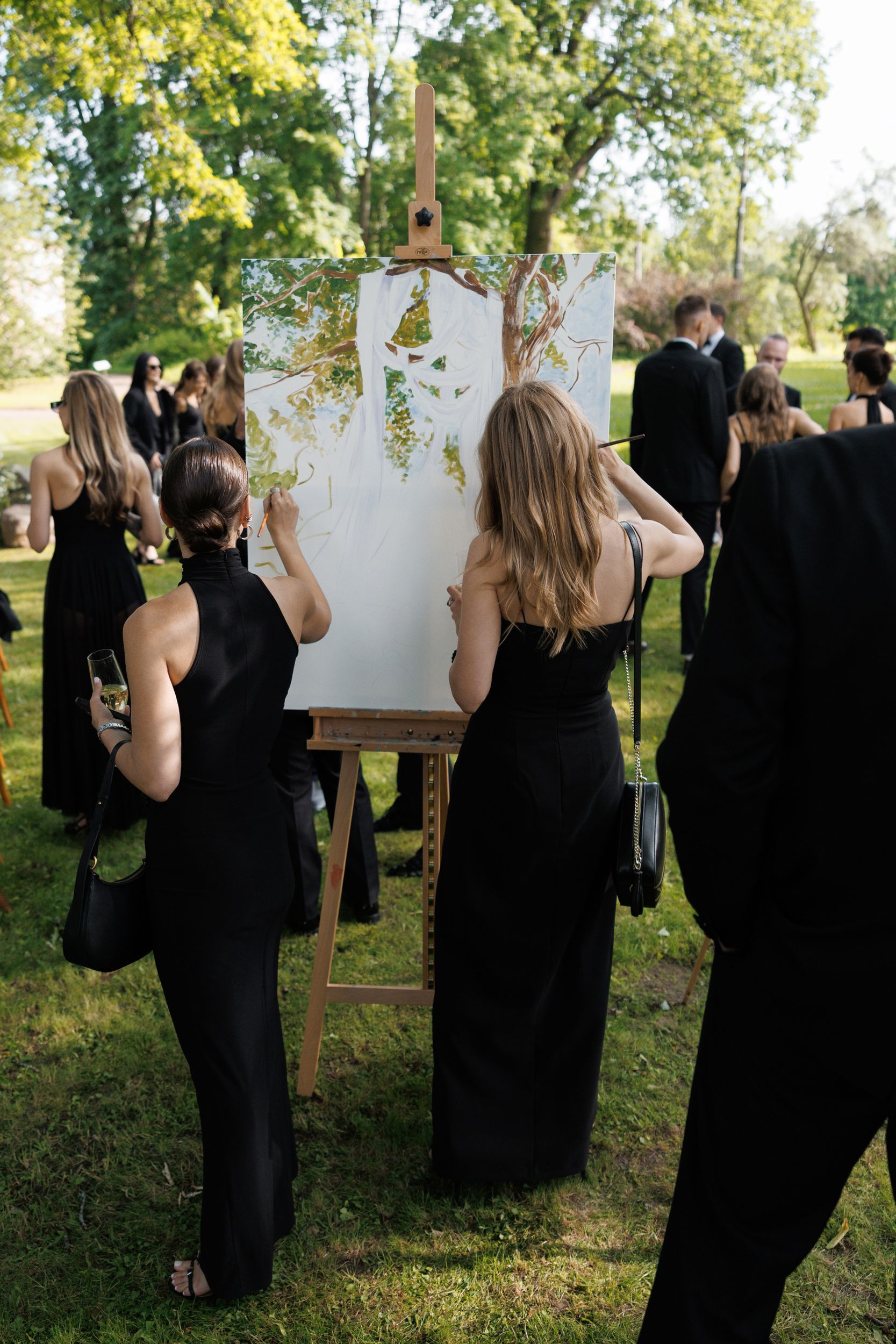 Картина со свадьбы в реальном времени — для художественных свадеб: художник пишет картину ключевого момента в течение дня, гости могут добавить свои мазки, а вечером полотно торжественно презентуется паре.