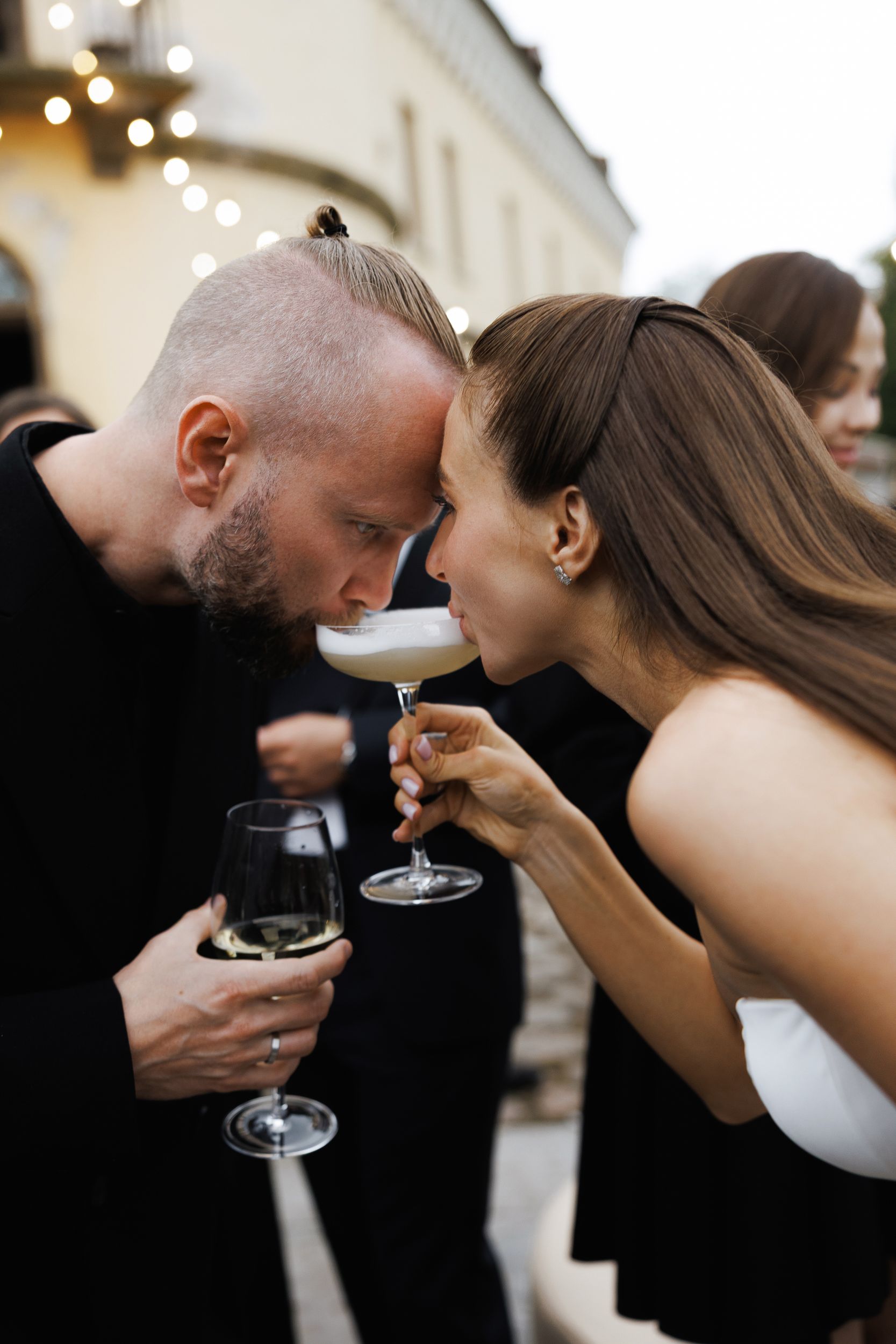 Ещё одна классная идея — коктейльный бар с авторскими напитками, особенно когда пара сама готовит для гостей фирменный коктейль. Такой формат создаёт атмосферу живого общения и неизменно вызывает вау-эффект.