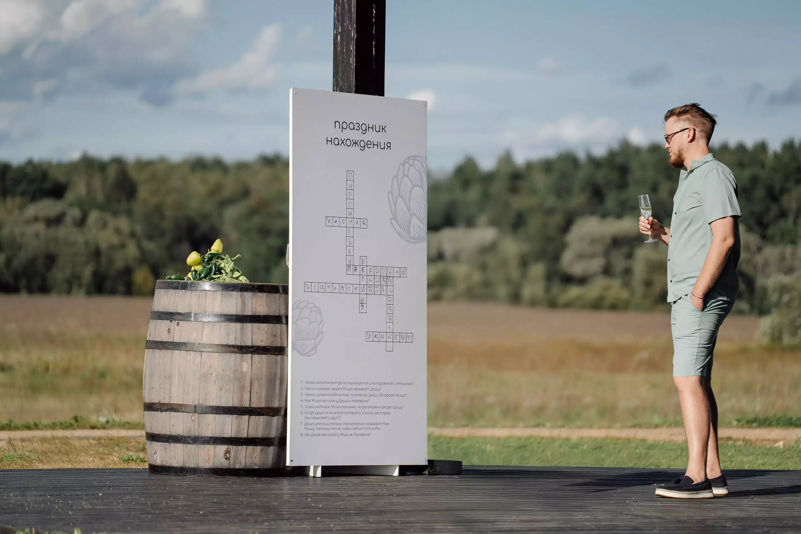 - Гигантский кроссворд про пару — один из беспроигрышных форматов на велкоме. Масштаб сам привлекает внимание, вопросы составляются на основе анкеты молодожёнов: факты, смешные моменты, внутренние шутки. Гости вовлекаются органично, без ведущего и без сцены.