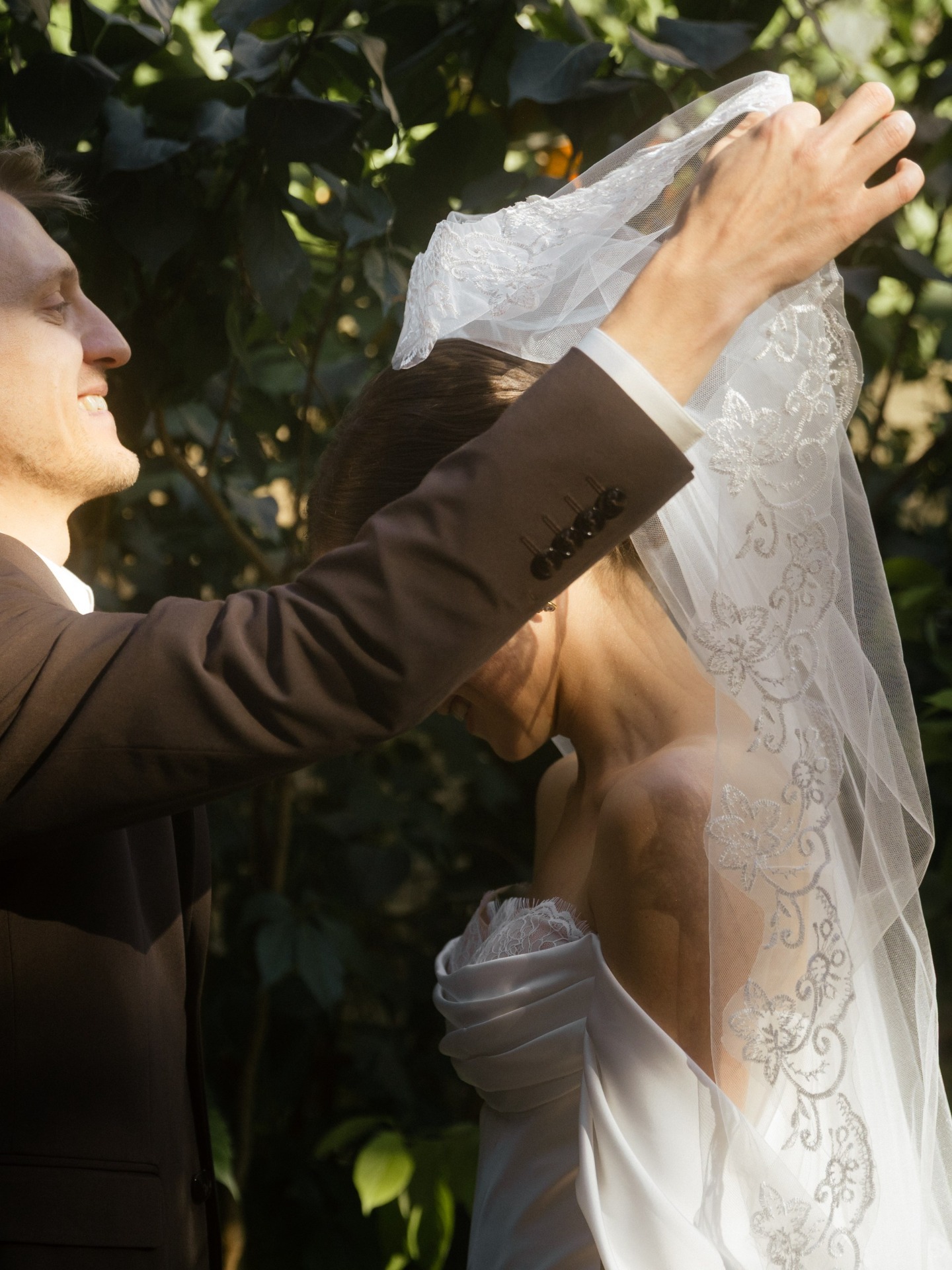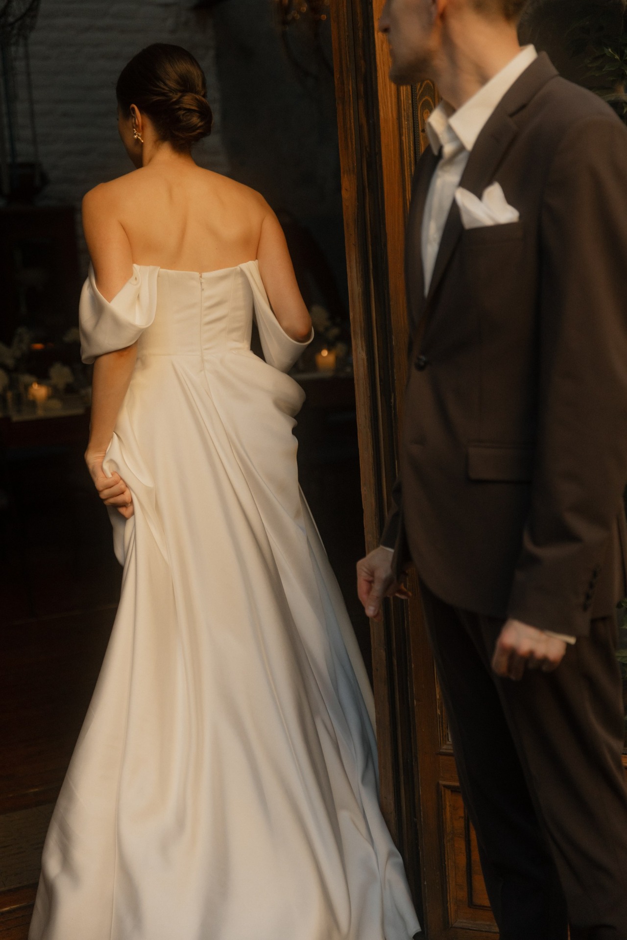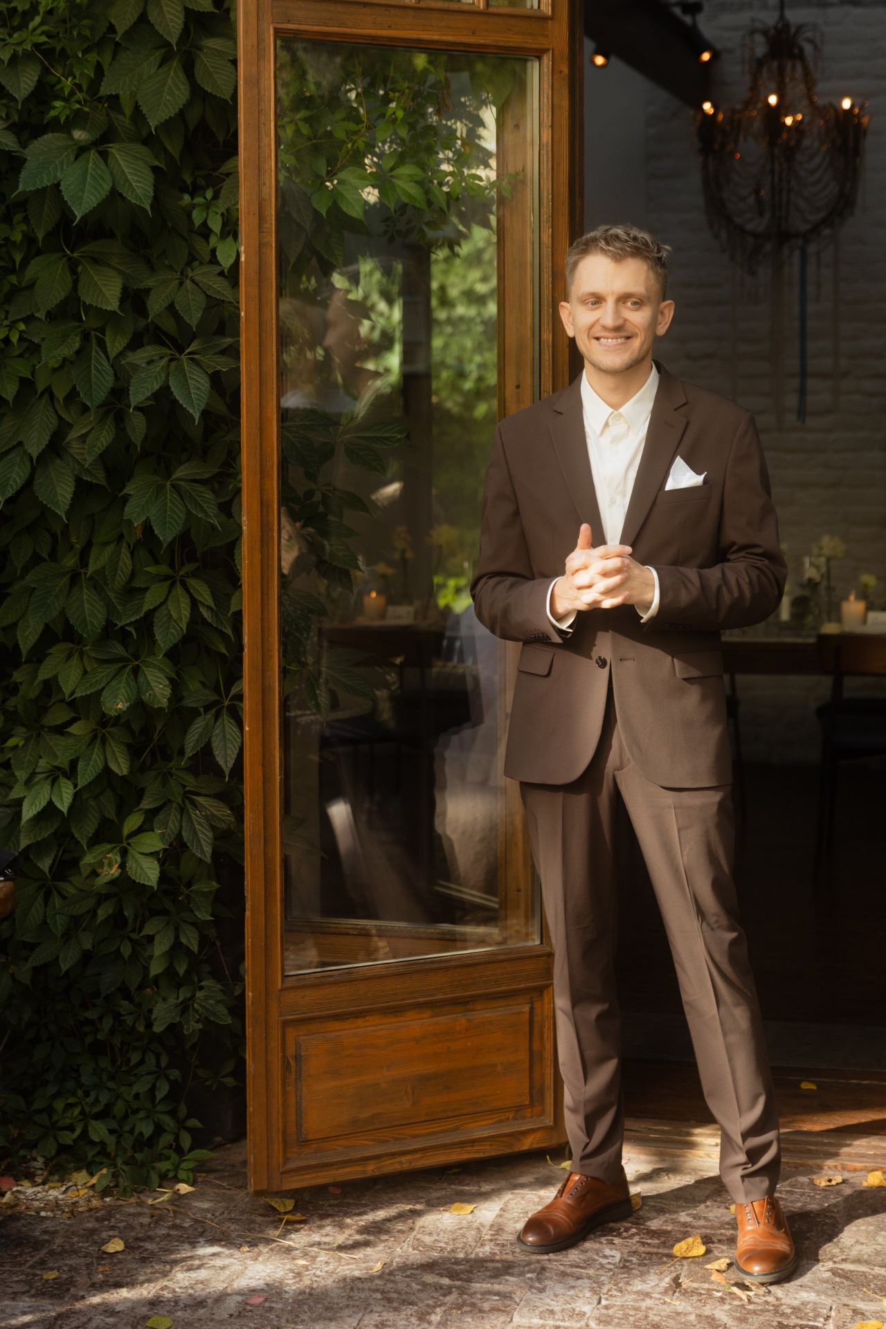 С образом Ильи было всё проще и спокойнее. Мы не заморачивались с моделями и брендами. Главным и единственным критерием был цвет костюма — чтобы он гармонично сочетался с палитрой праздника. В итоге мы нашли идеальный шоколадный оттенок, который и стал прекрасным фоном и поддержкой для моего образа.
