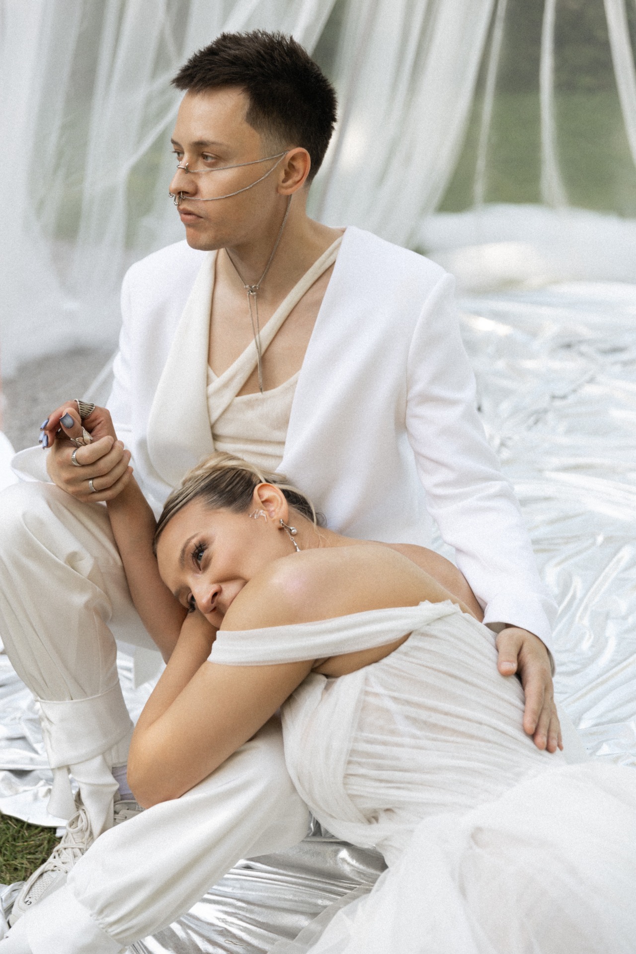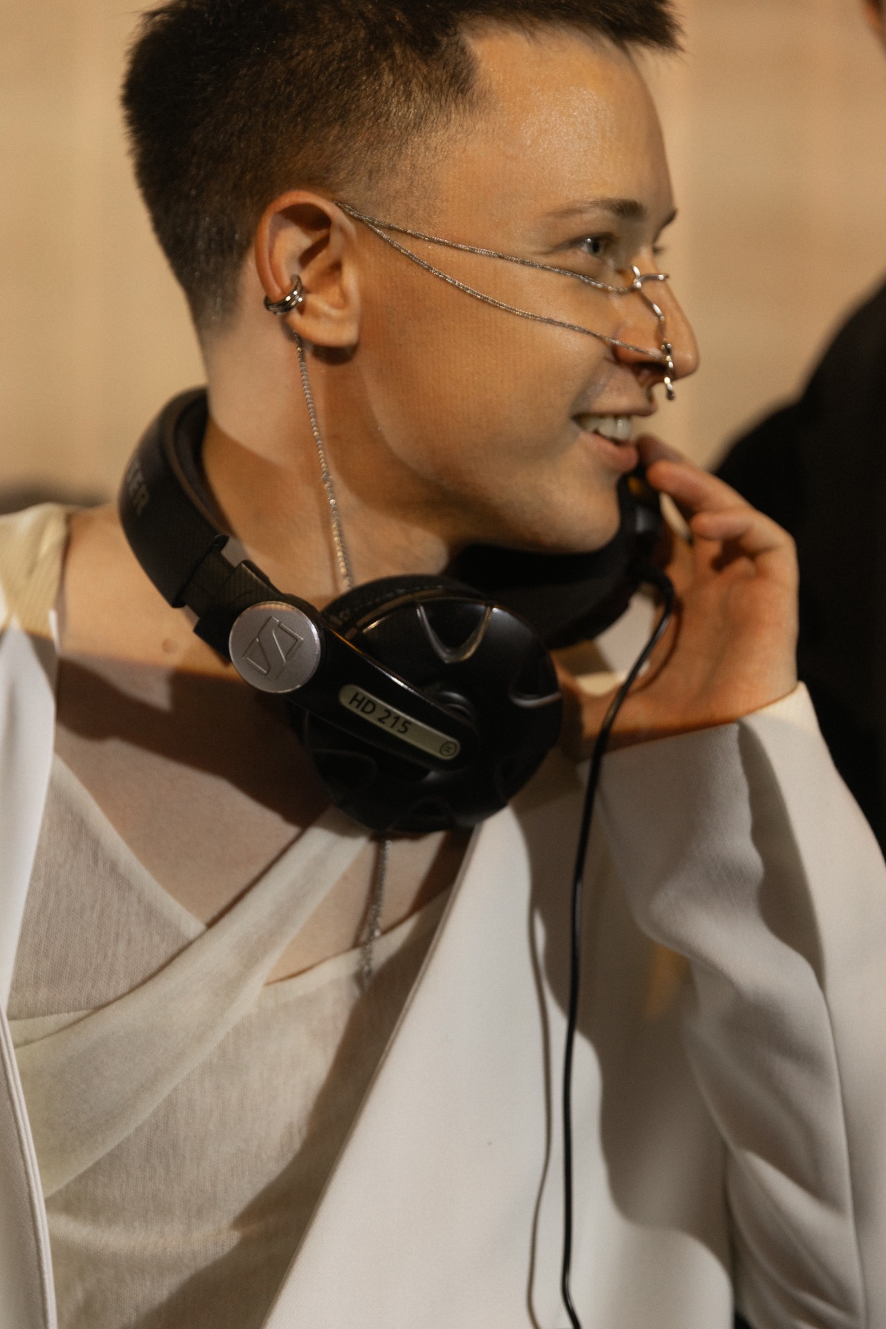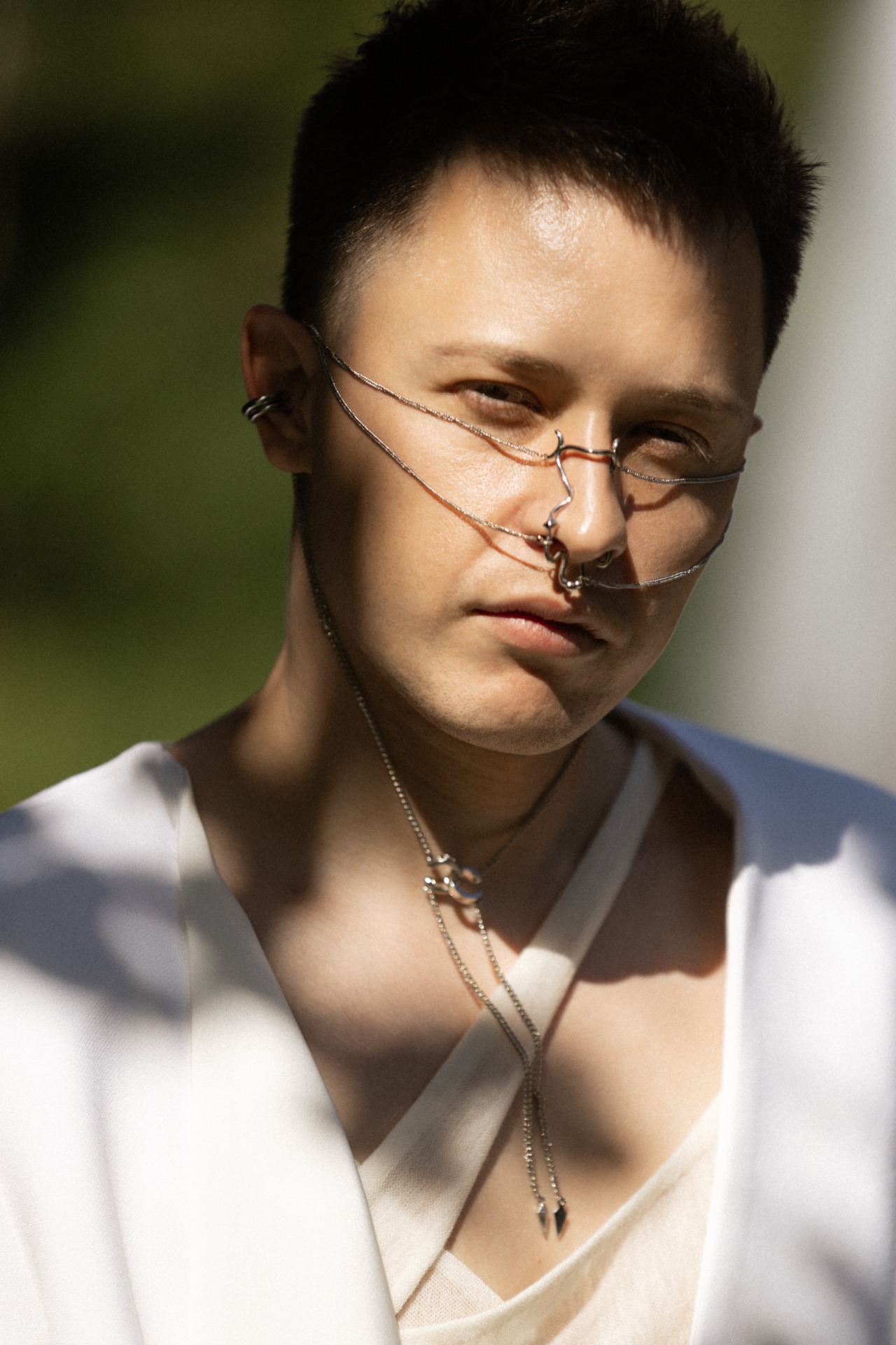 Образ Вани был максимально далёк от классики: белый асимметричный костюм, сшитый вручную, полупрозрачный лонгслив и массивная, нарочито несоразмерная обувь. Финальным штрихом стало необычное металлическое украшение, крепившееся прямо на переносицу и щёки — это добавило лицу инопланетности и идеально вписалось в наш «галактический» концепт.