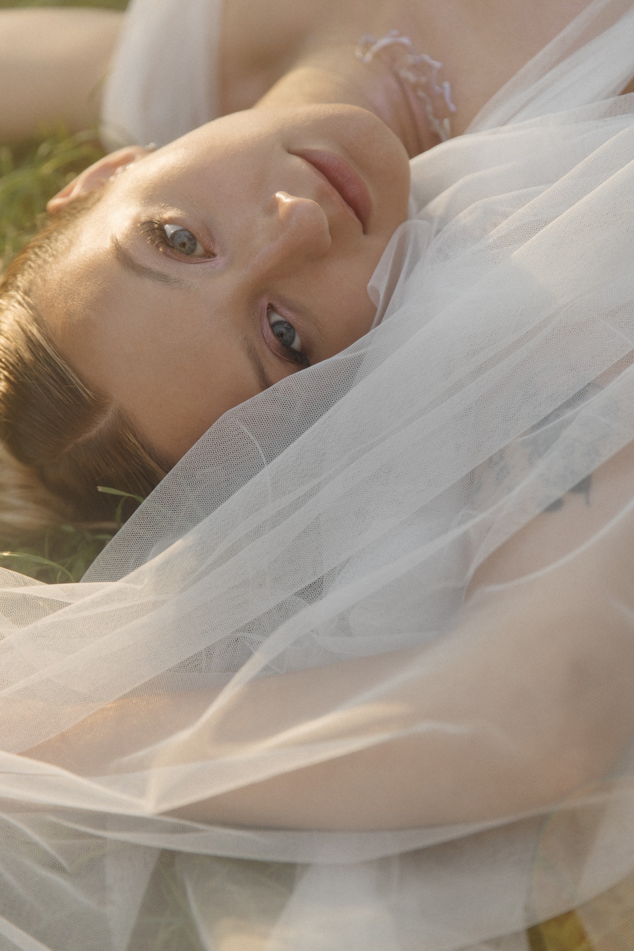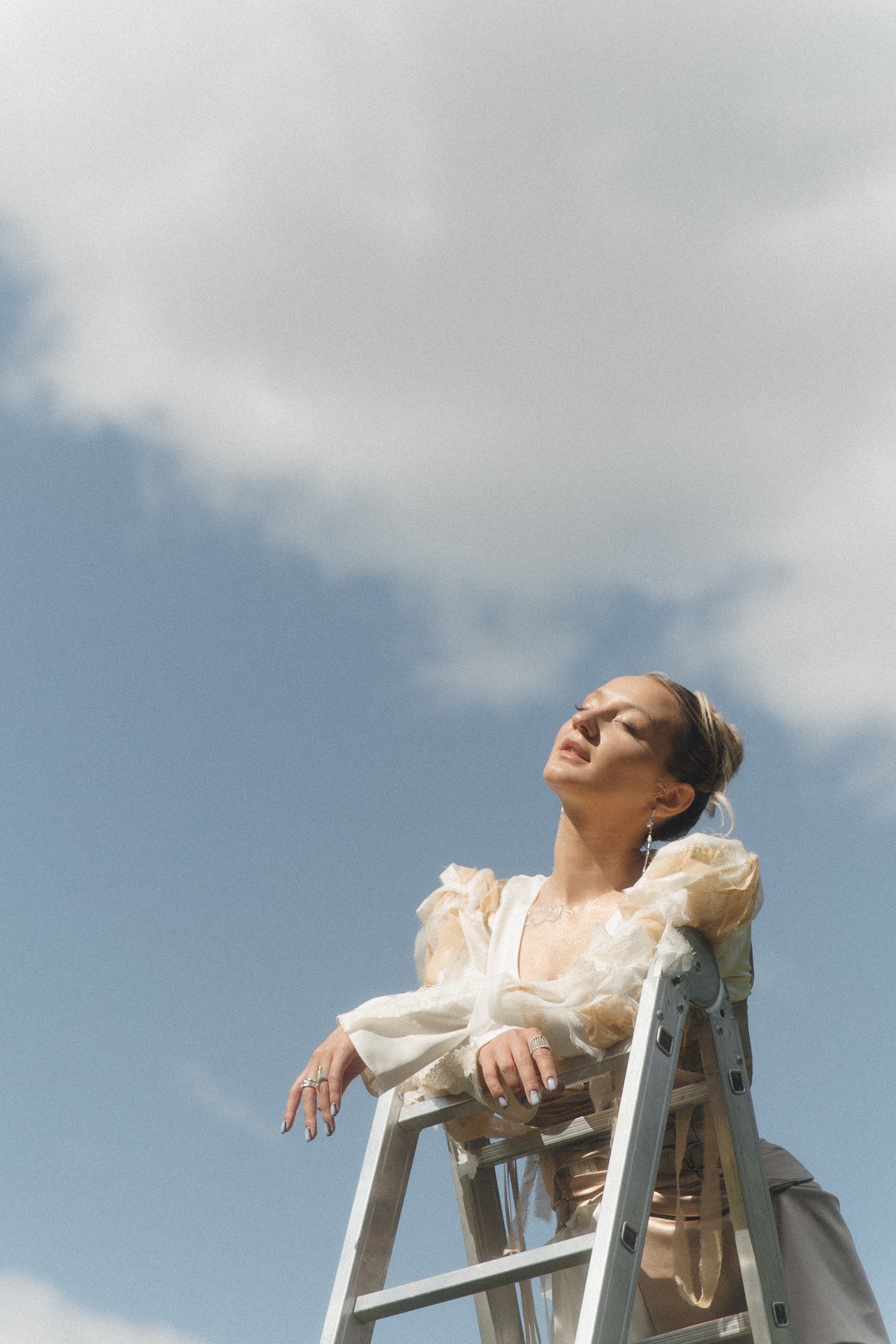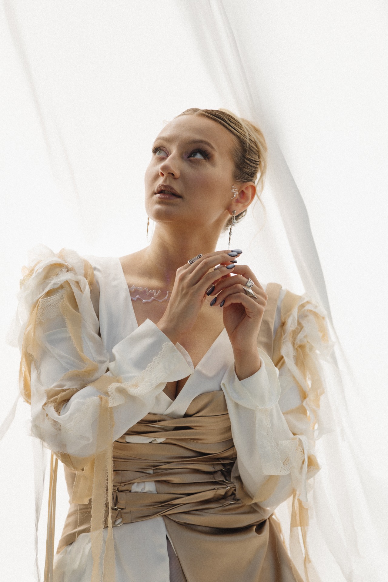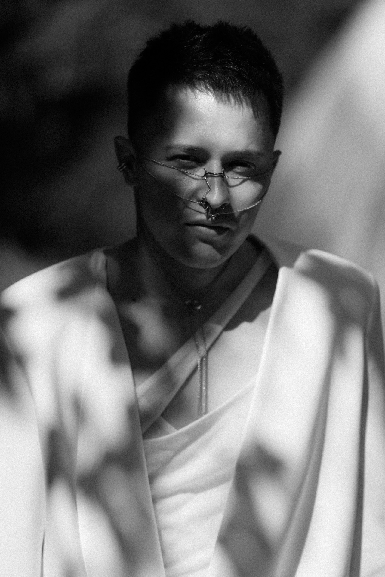 Образ Вани был максимально далёк от классики: белый асимметричный костюм, сшитый вручную, полупрозрачный лонгслив и массивная, нарочито несоразмерная обувь. Финальным штрихом стало необычное металлическое украшение, крепившееся прямо на переносицу и щёки — это добавило лицу инопланетности и идеально вписалось в наш «галактический» концепт.