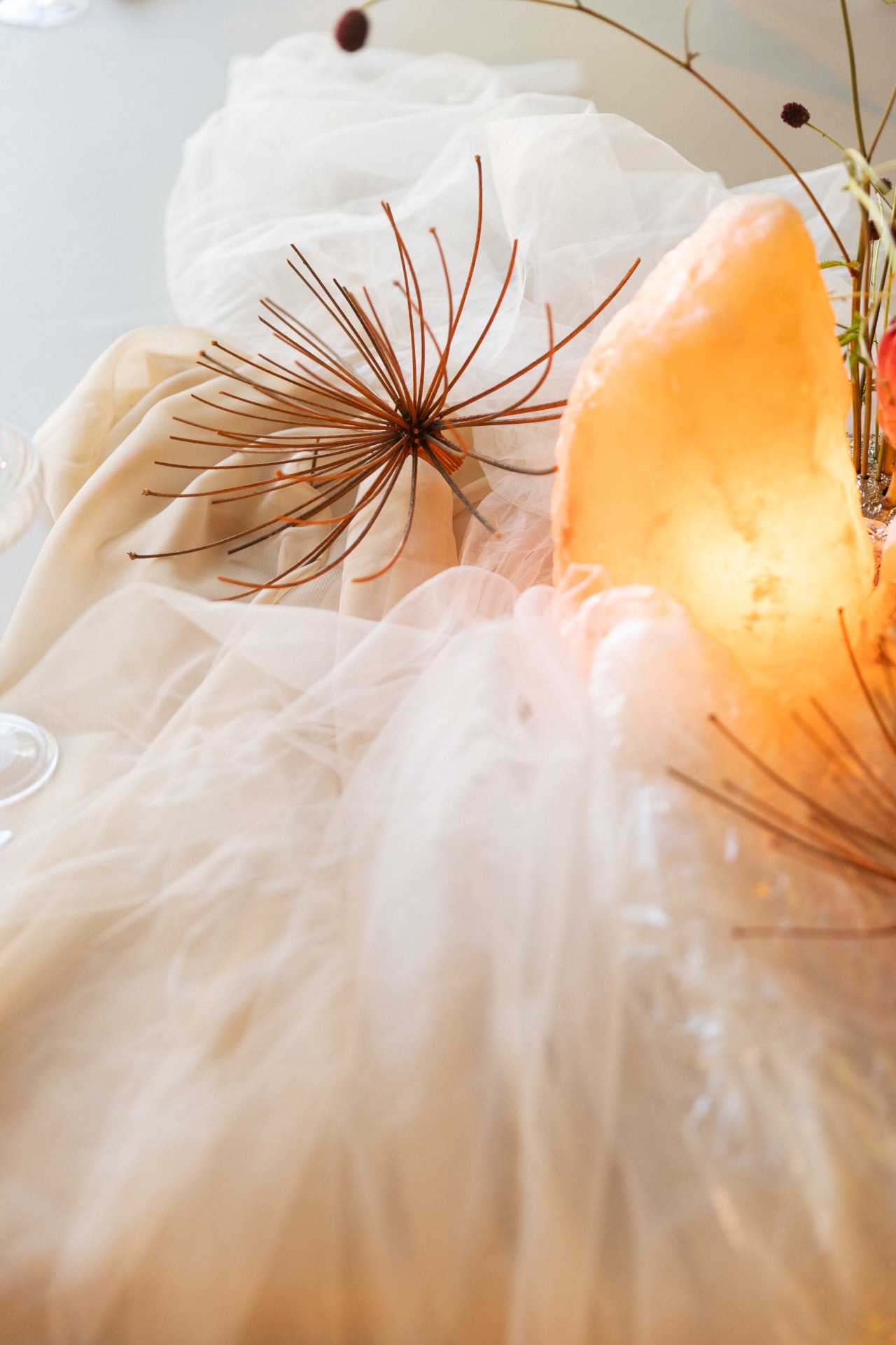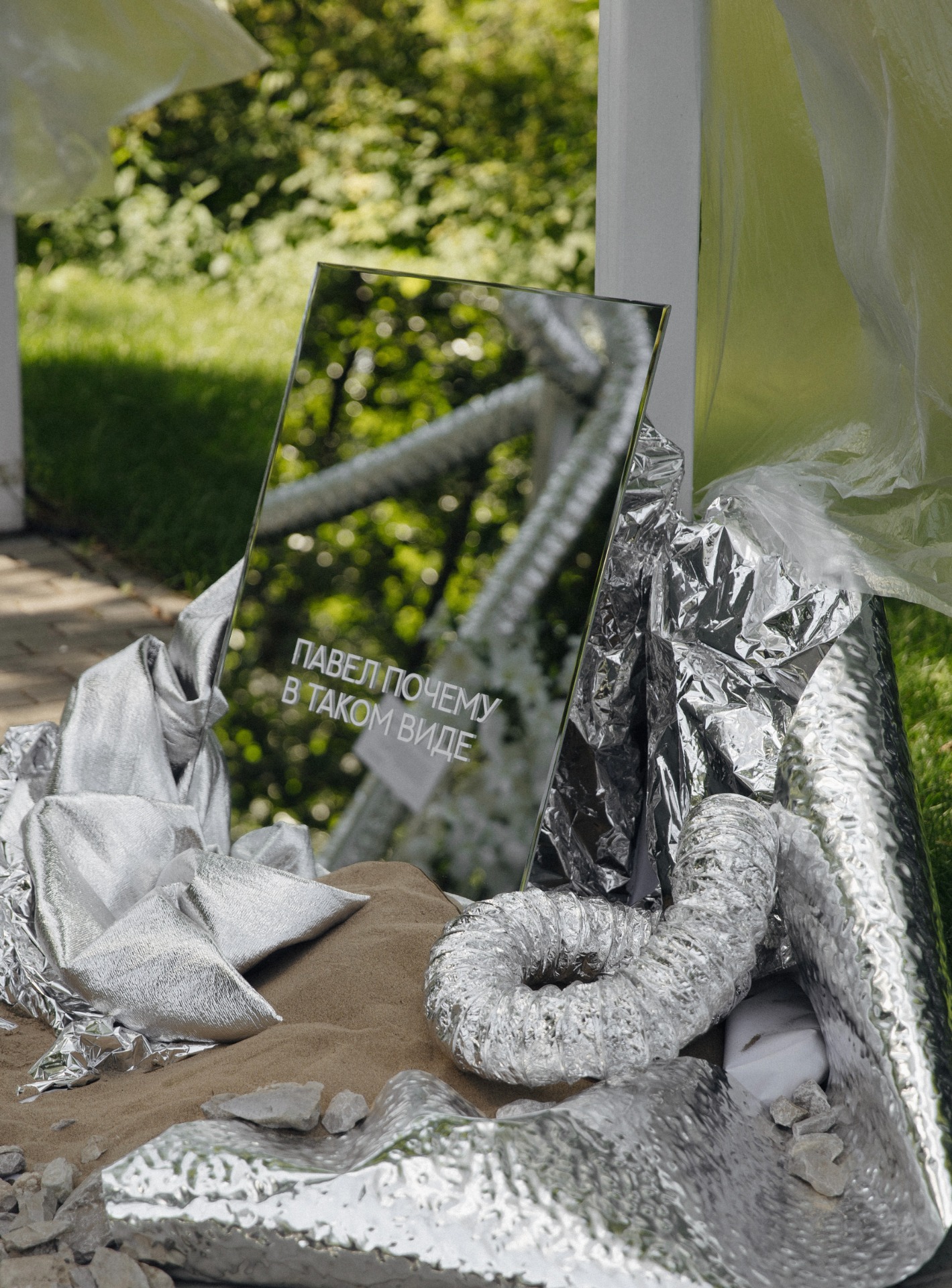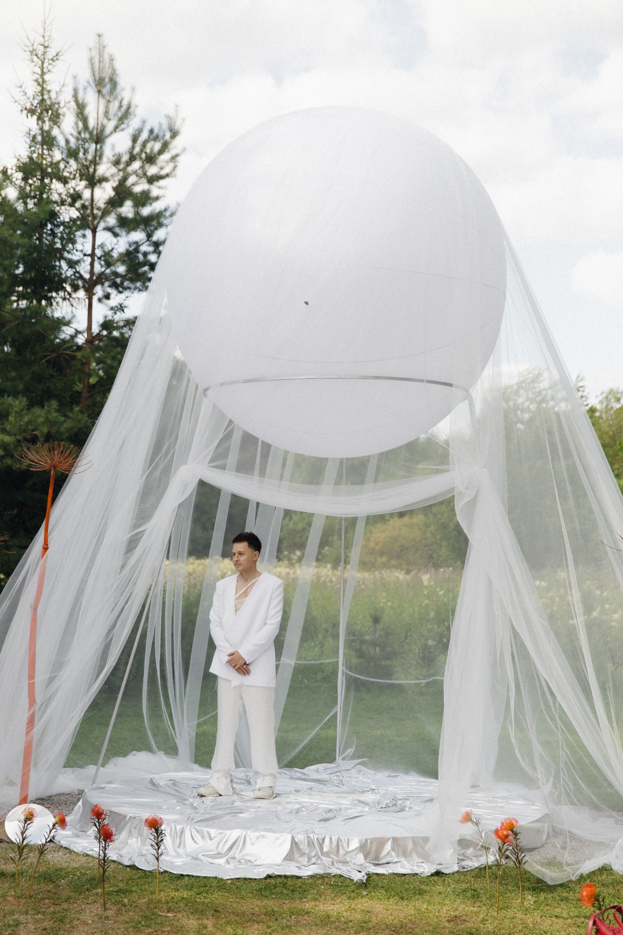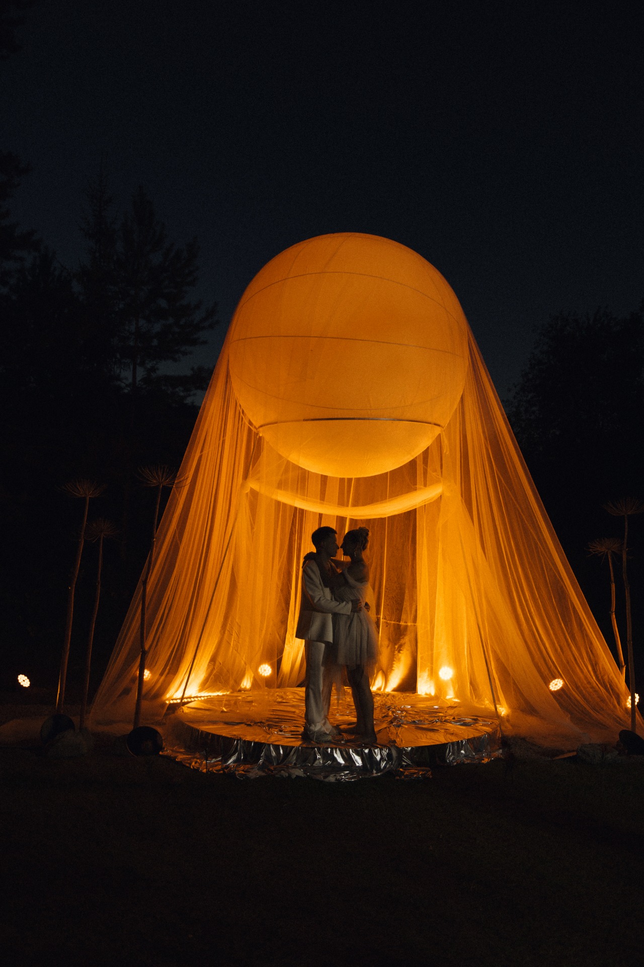 В визуале мы смешали металл, асимметрию, песок и галактические оттенки с оранжевым светом. Главным элементом стала арка — мы вдохновились корейским чайным домиком, который выглядел как почти прозрачный шар под вуалью.
