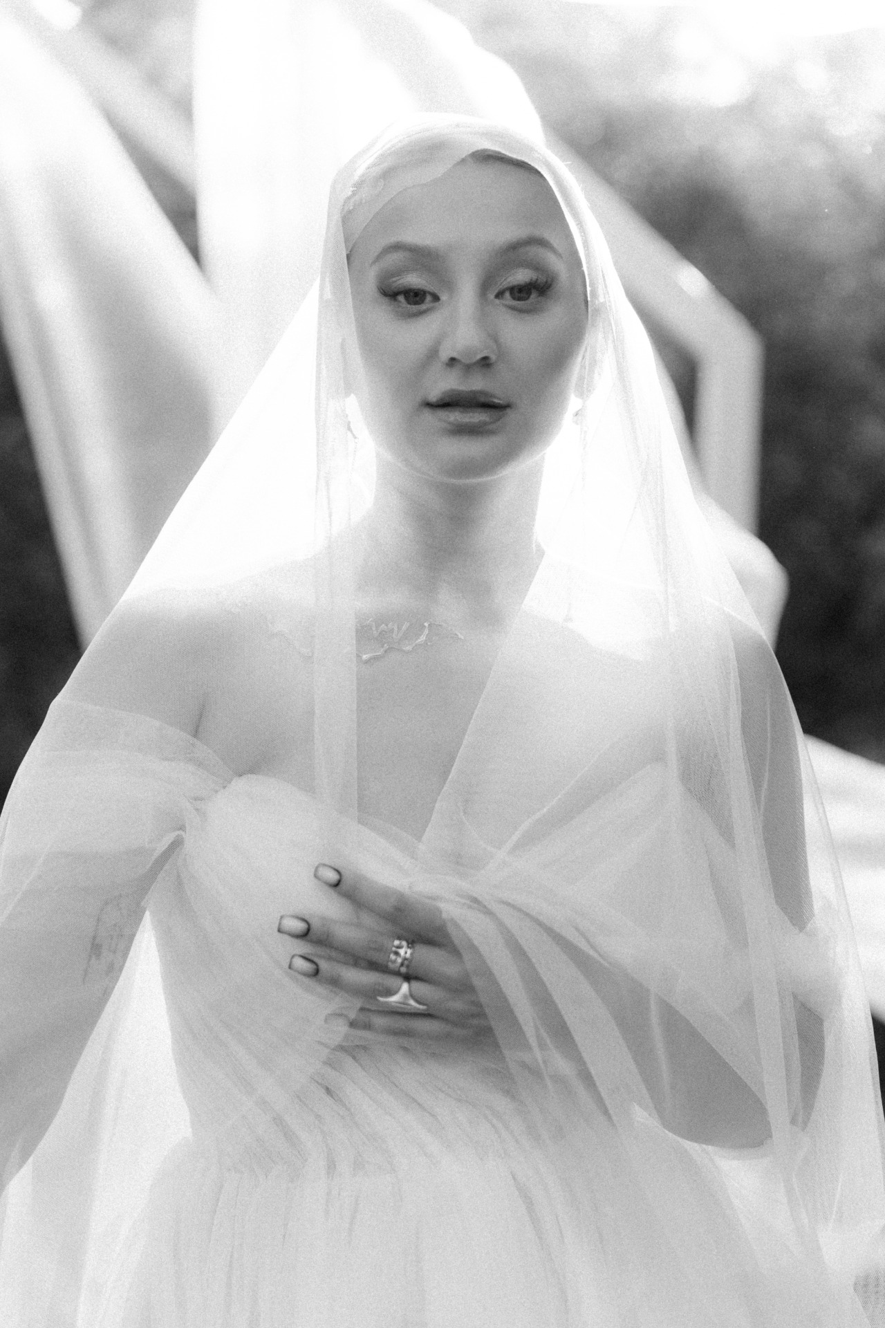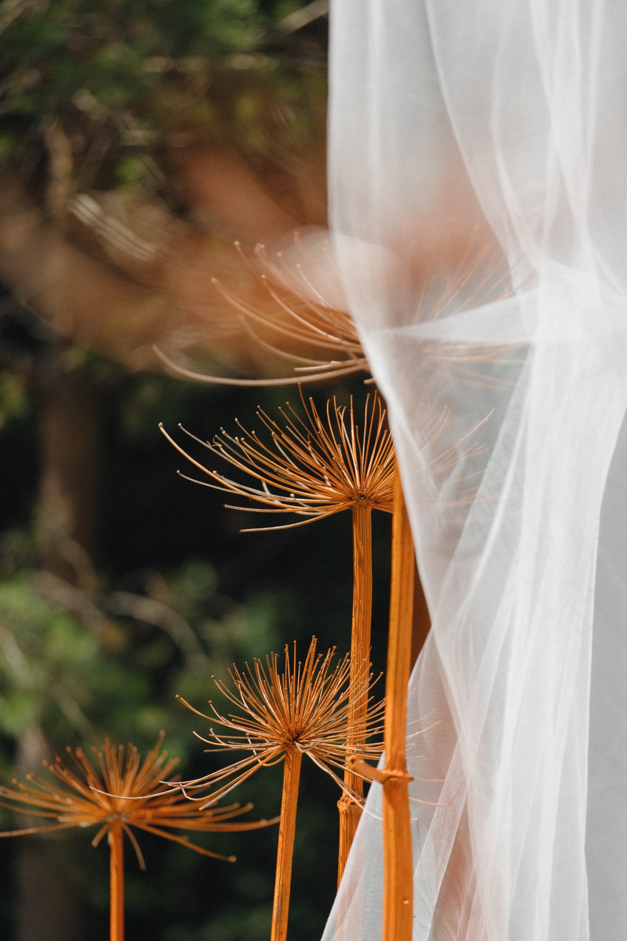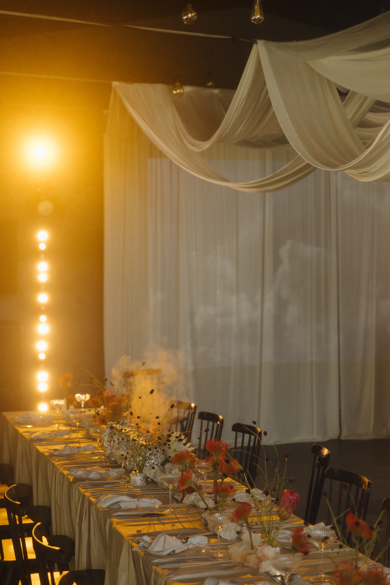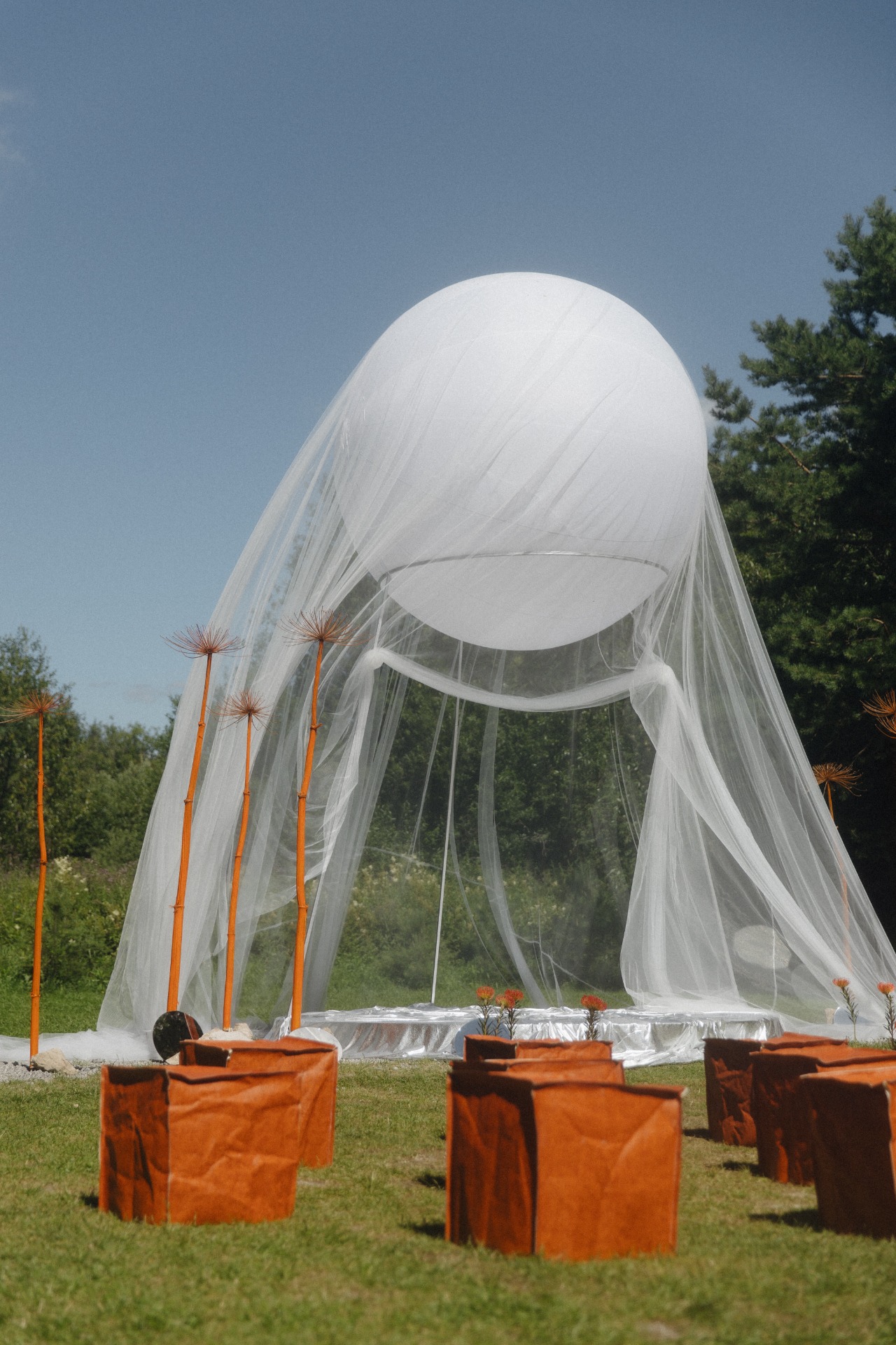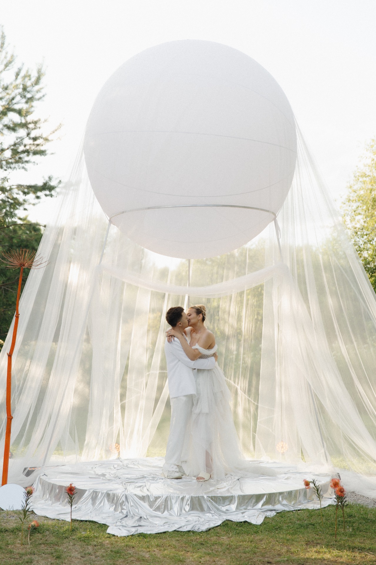 В визуале мы смешали металл, асимметрию, песок и галактические оттенки с оранжевым светом. Главным элементом стала арка — мы вдохновились корейским чайным домиком, который выглядел как почти прозрачный шар под вуалью.