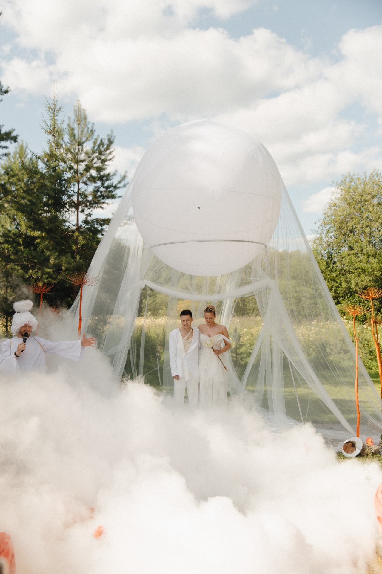 Финальным штрихом стала церемония «над облаками» дыма. Чтобы поддержать идею о том, что союзы заключаются на небесах, наш ведущий вышел в образе купидона.