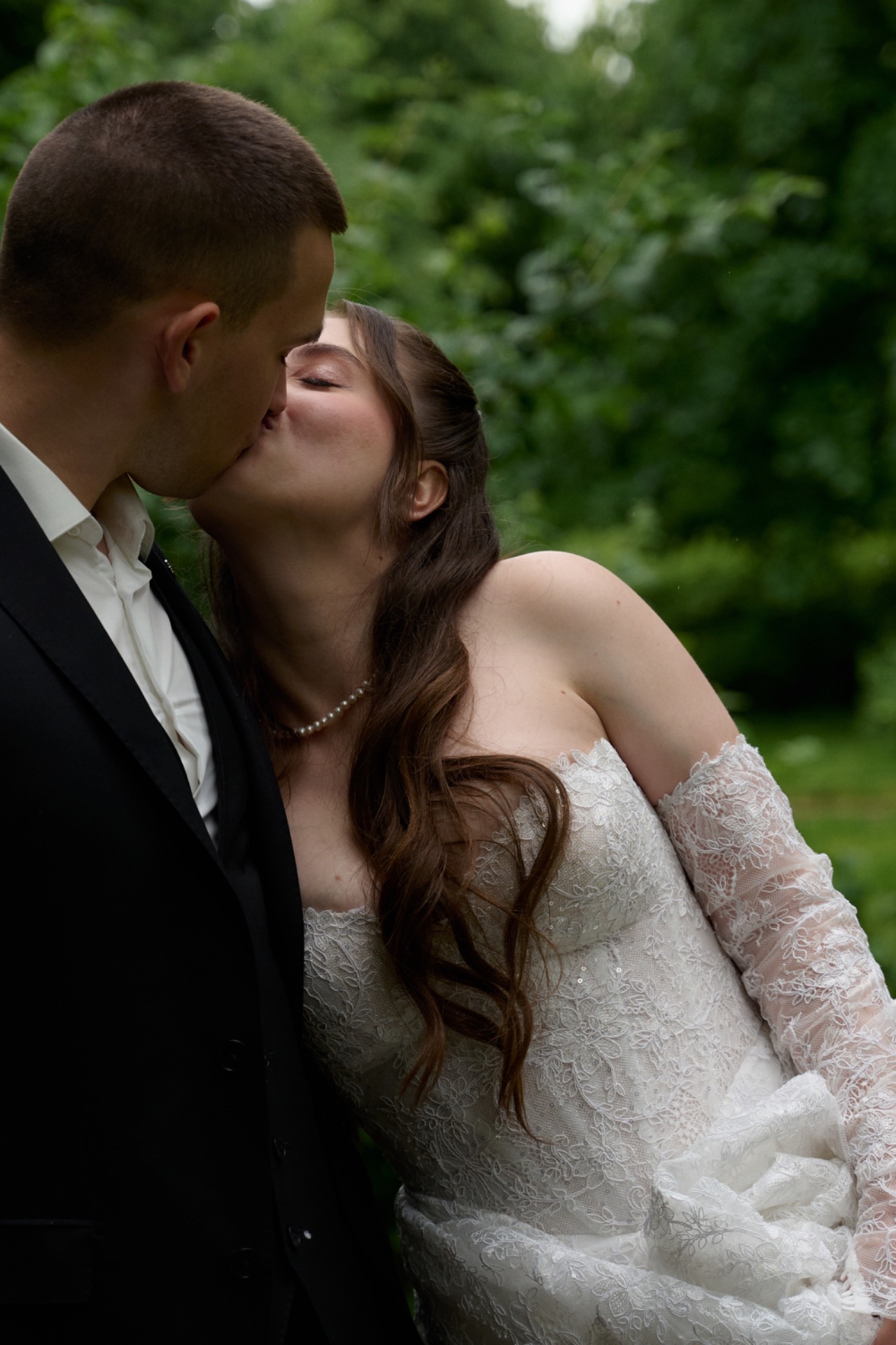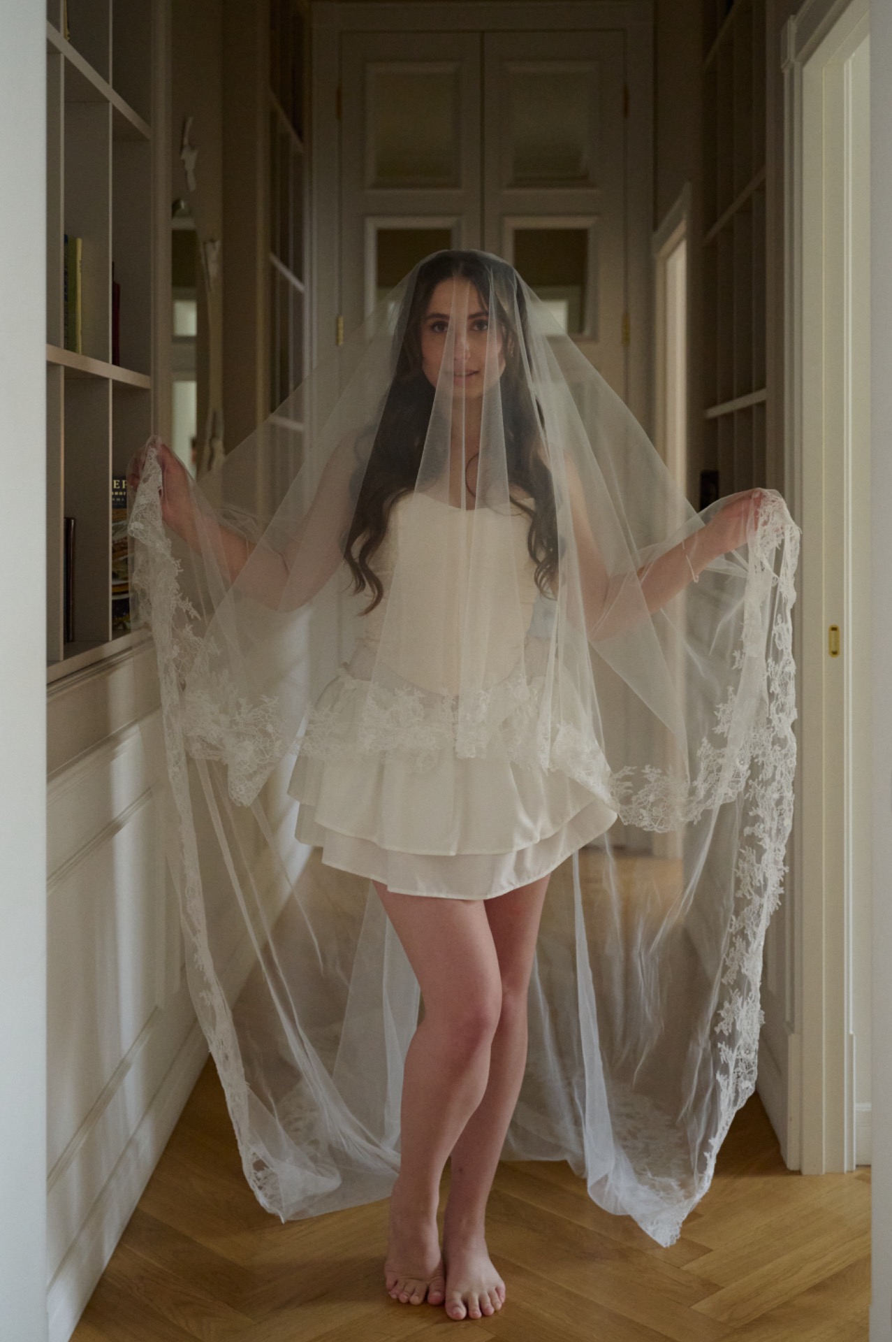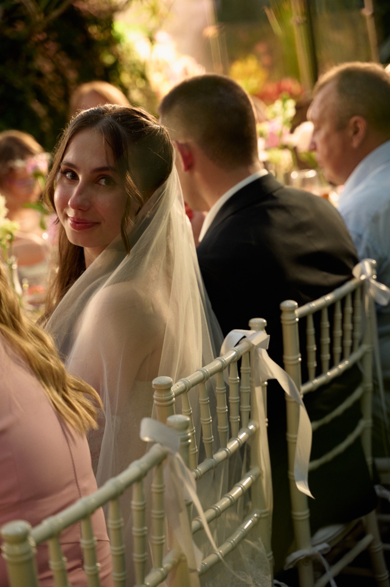 Для моего основного было выбрано платье, полностью украшенное кружевом — лёгкое, утончённое и наполненное деталями. Распущенные волосы с мягко выпущенными прядями подчёркивали мою естественную красоту, а длинная фата с кружевной отделкой по краям добавляла особой воздушности и романтики. Завершающими штрихами стали жемчужные серьги и ожерелье, гармонично дополнившие образ. В качестве обуви я выбрала балетки, чтобы провести этот день максимально комфортно и наслаждаться каждым мгновением.