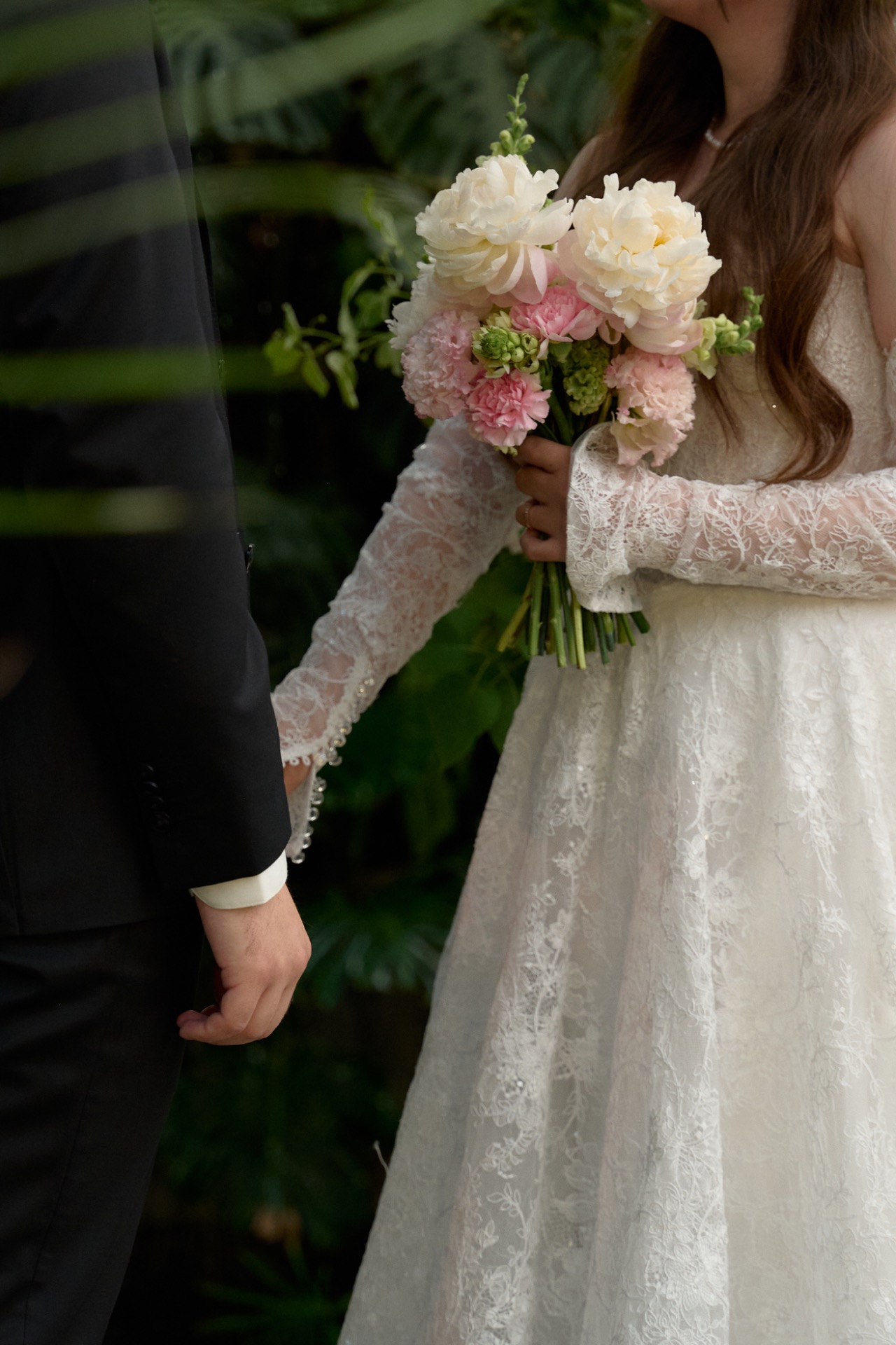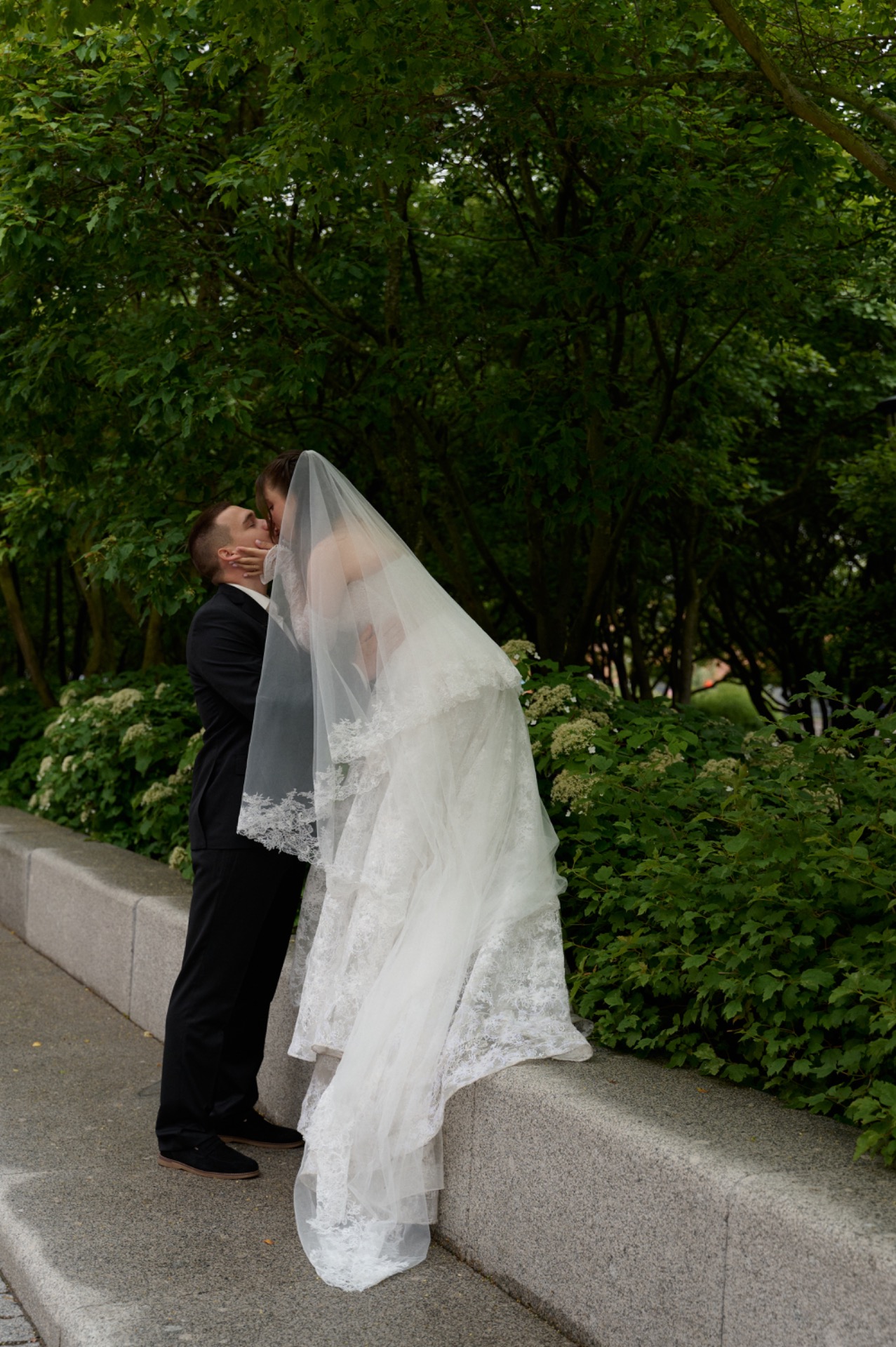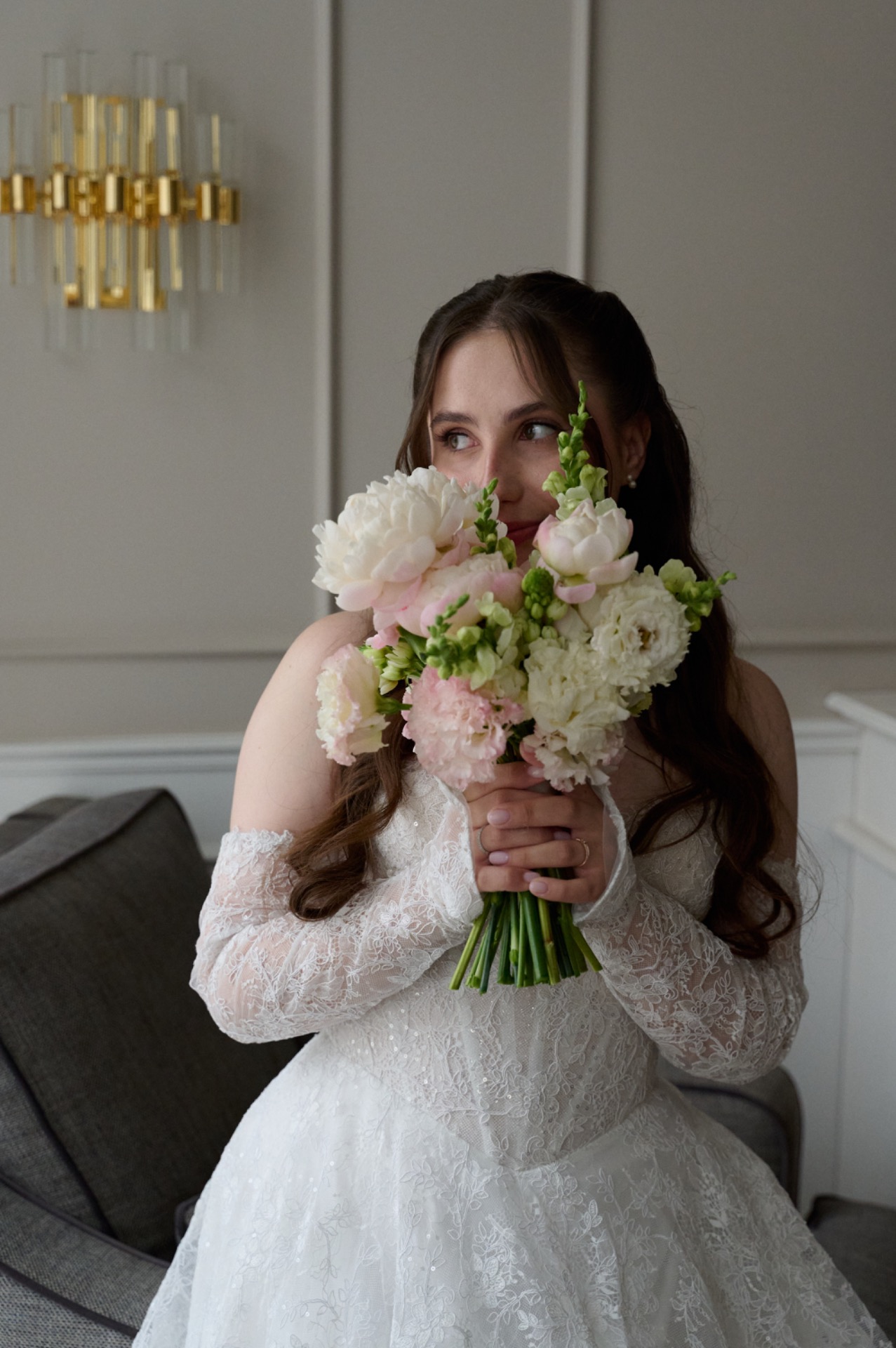 Для моего основного было выбрано платье, полностью украшенное кружевом — лёгкое, утончённое и наполненное деталями. Распущенные волосы с мягко выпущенными прядями подчёркивали мою естественную красоту, а длинная фата с кружевной отделкой по краям добавляла особой воздушности и романтики. Завершающими штрихами стали жемчужные серьги и ожерелье, гармонично дополнившие образ. В качестве обуви я выбрала балетки, чтобы провести этот день максимально комфортно и наслаждаться каждым мгновением.