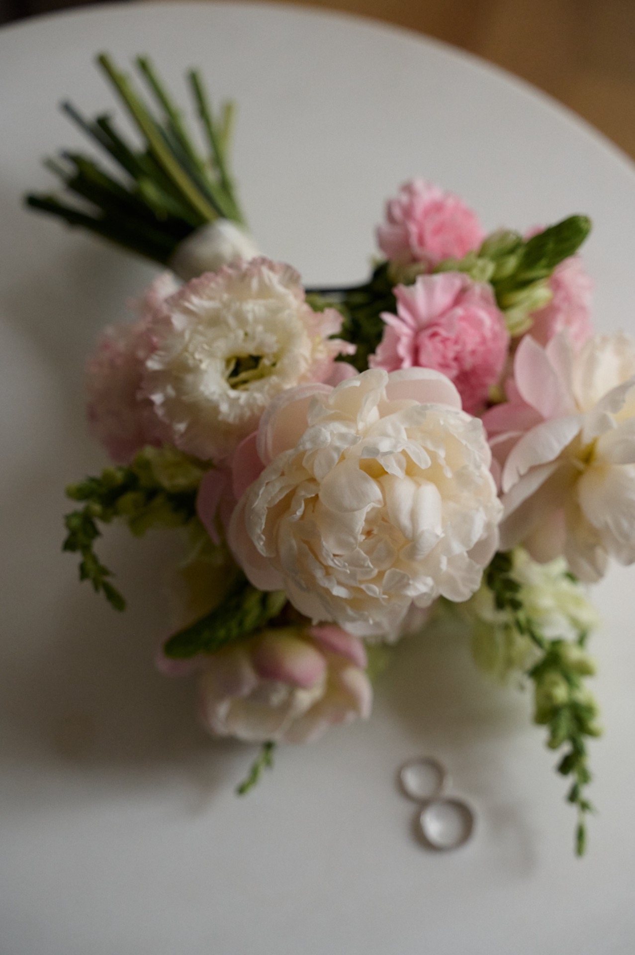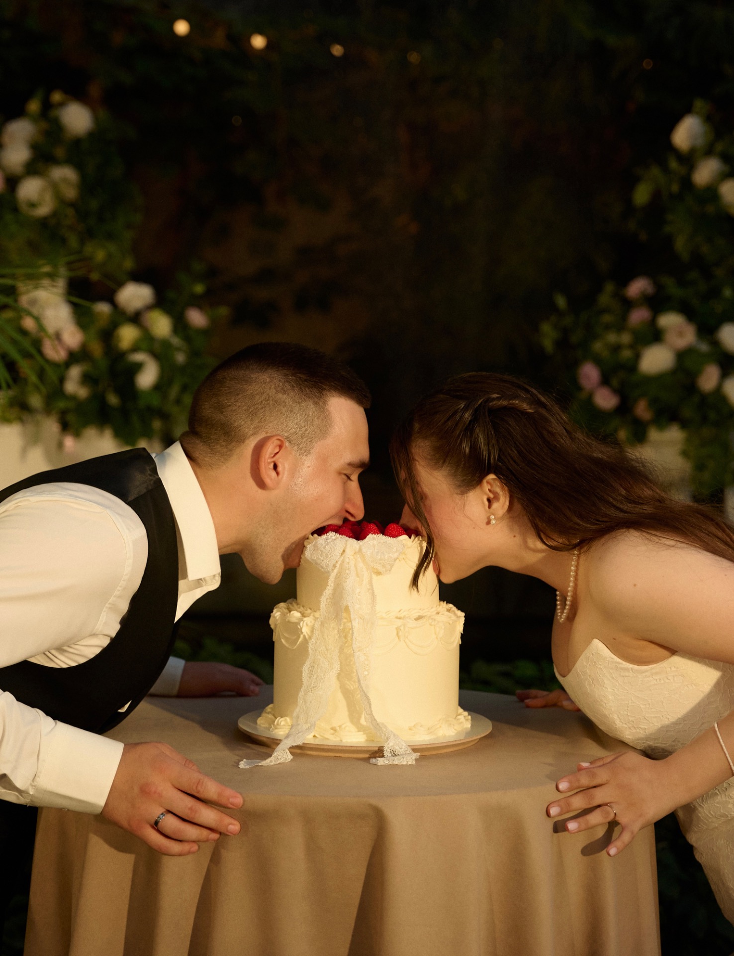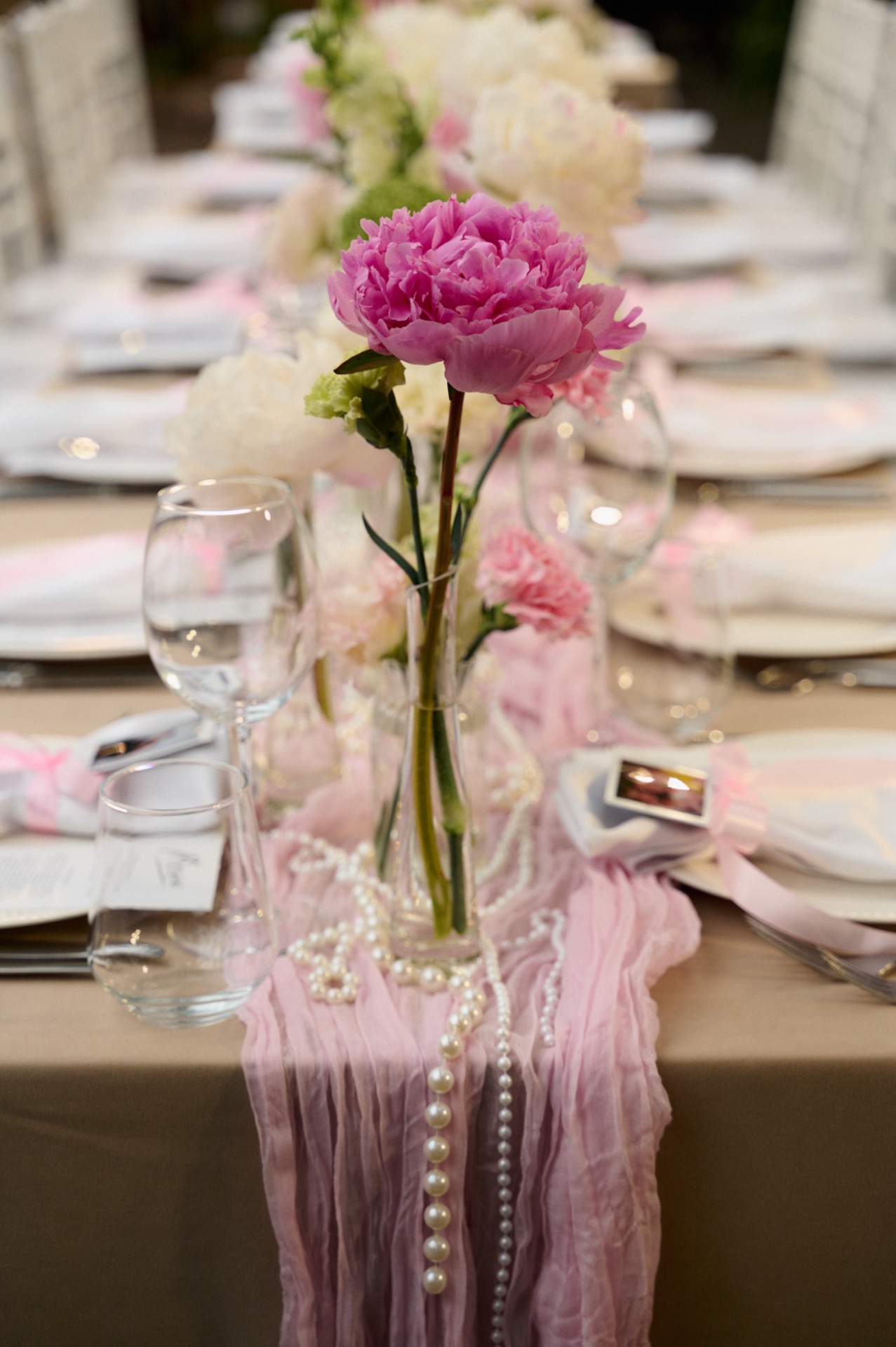 Мой любимый сериал — «Бриджертоны», и мне безумно хотелось прикоснуться к этой атмосфере в день свадьбы. На выездной регистрации нас окружали изящные античные вазоны с цветами. Стол был украшен любимыми розовыми пионами и жемчугом, а торт в стиле ламбет стал идеальным завершением этого дня.