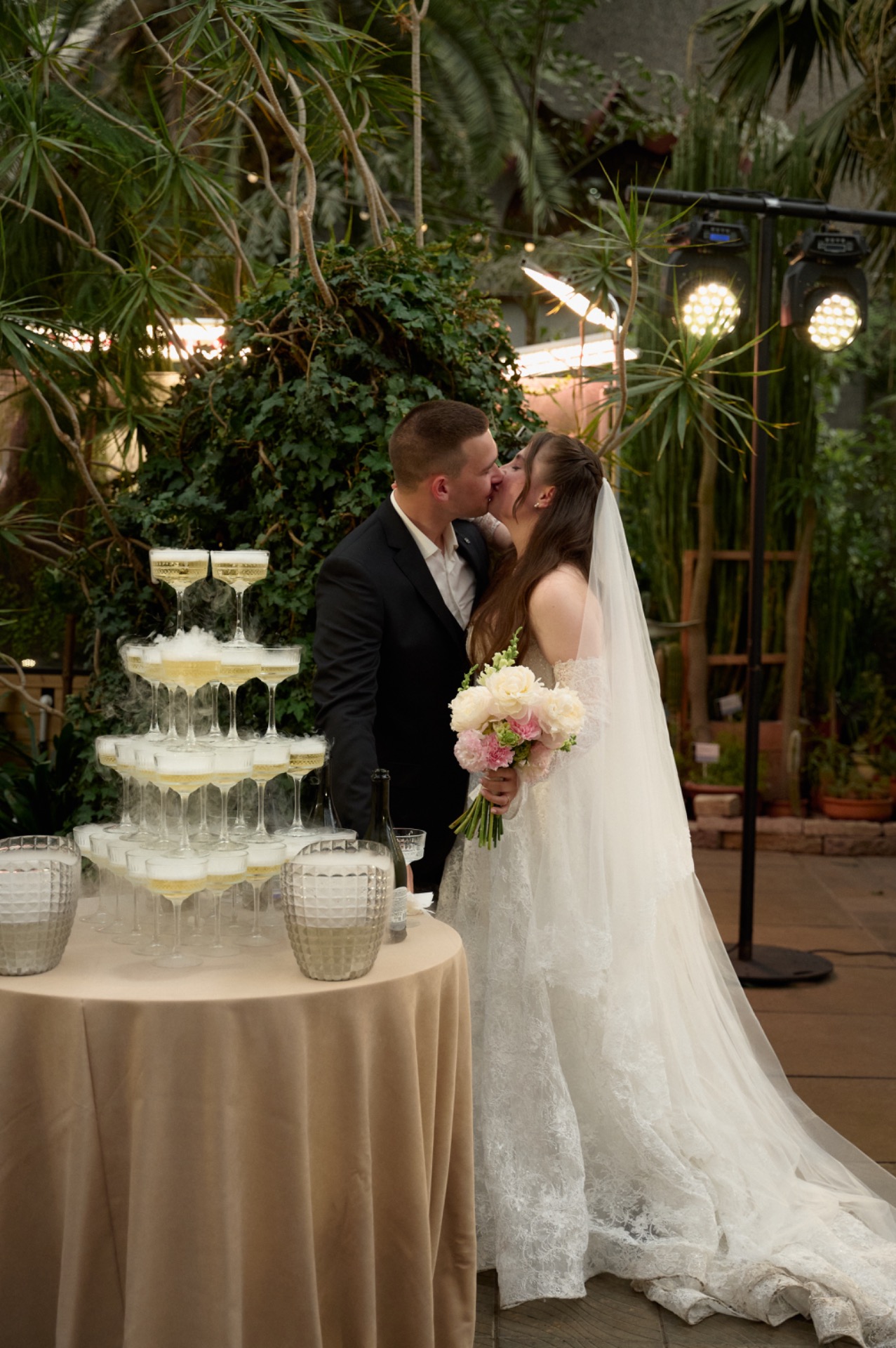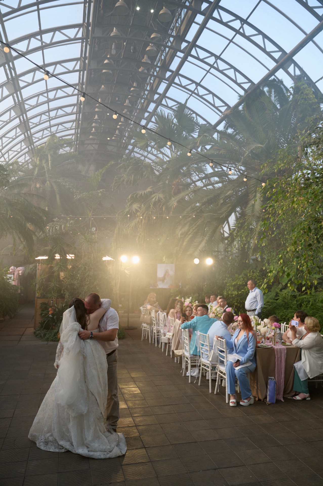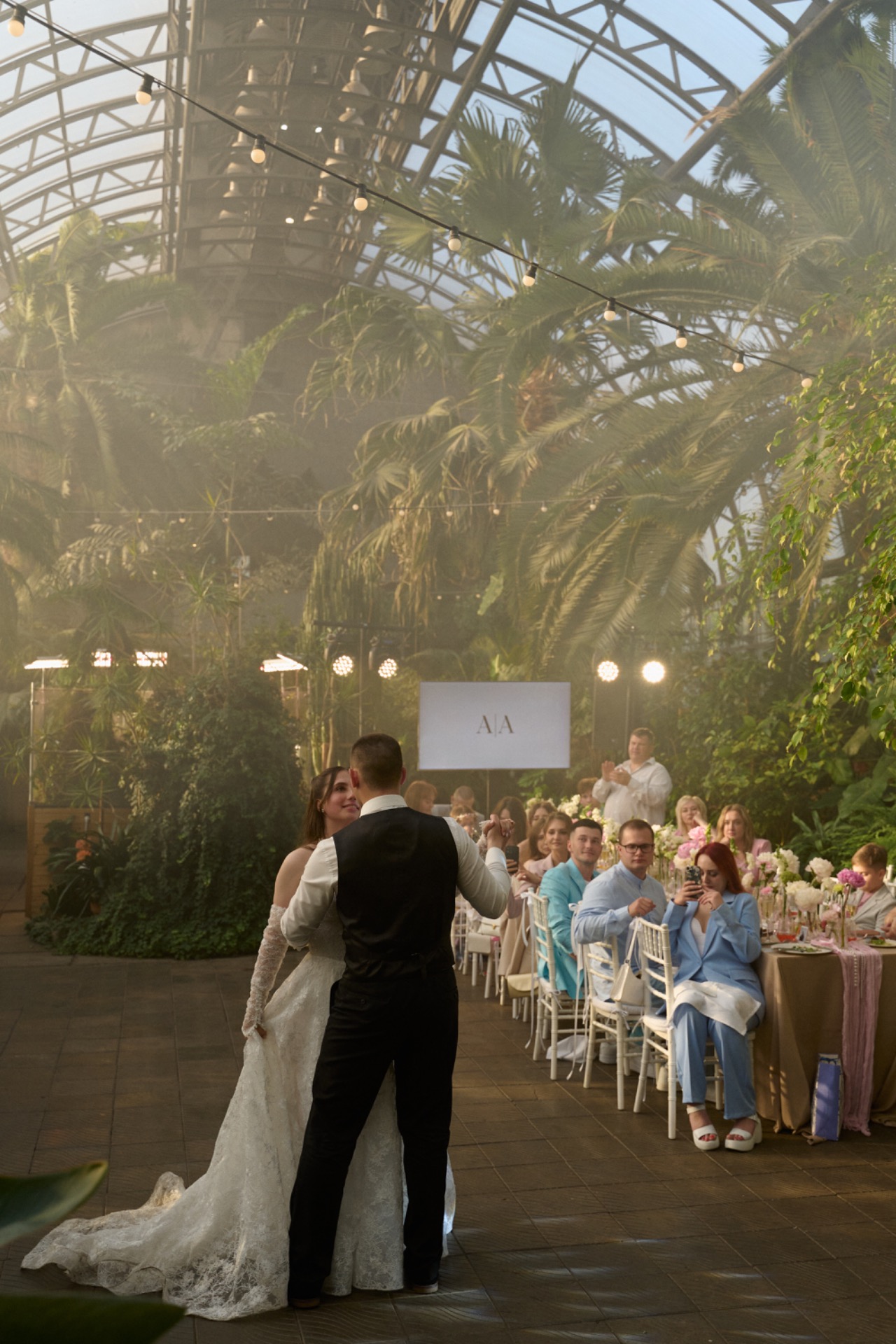 Перед началом вечера гостей ждала эффектная горка из шампанского с сухим льдом, а затем начался праздник, наполненный слезами счастья, громкими разговорами, смехом и бесконечными танцами.