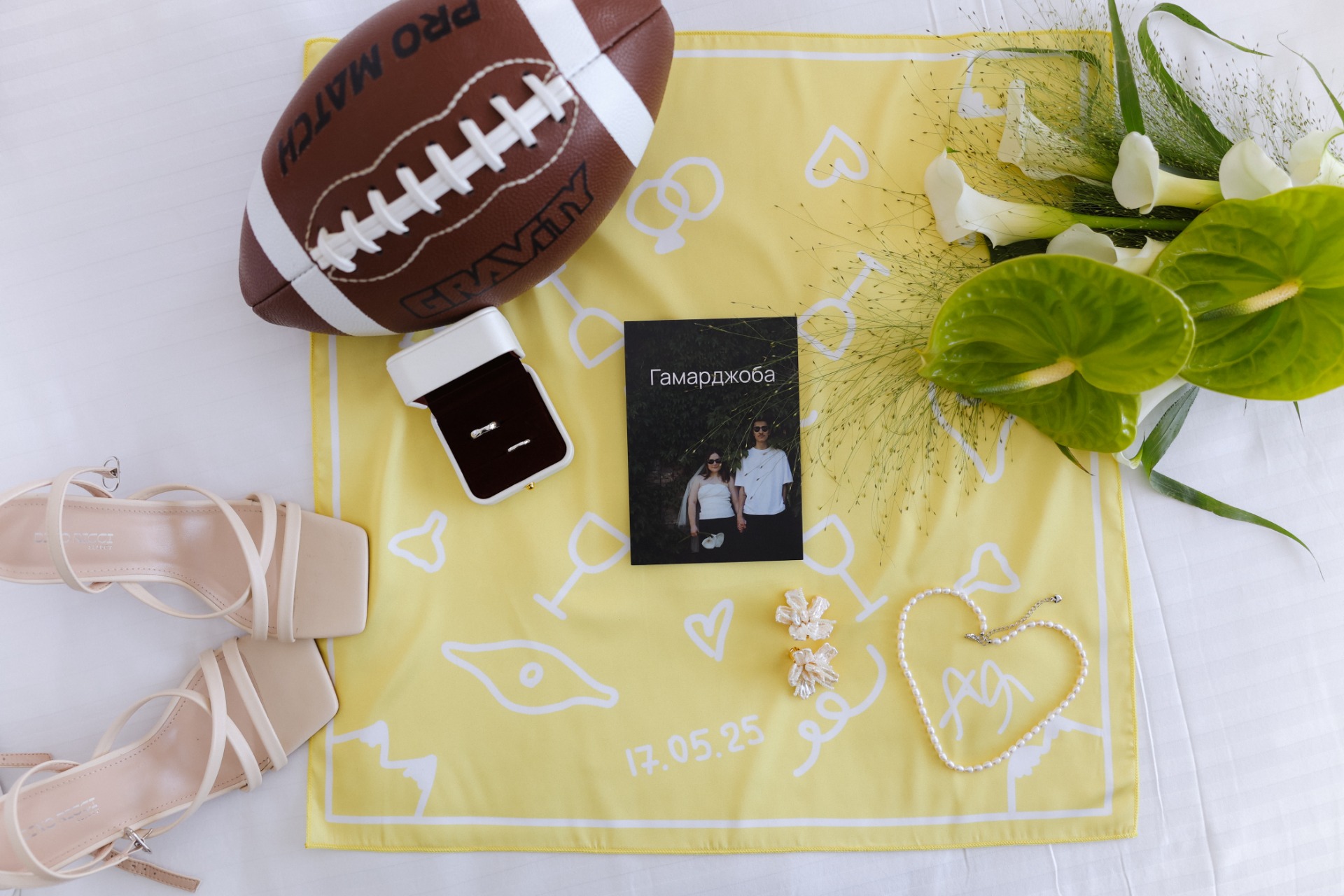 Вместо классического бросания подвязки Артур кинул мяч для американского футбола. Мы обожаем смотреть футбол, и эта деталь стала ещё одной маленькой отсылкой к нашим общим увлечениям.