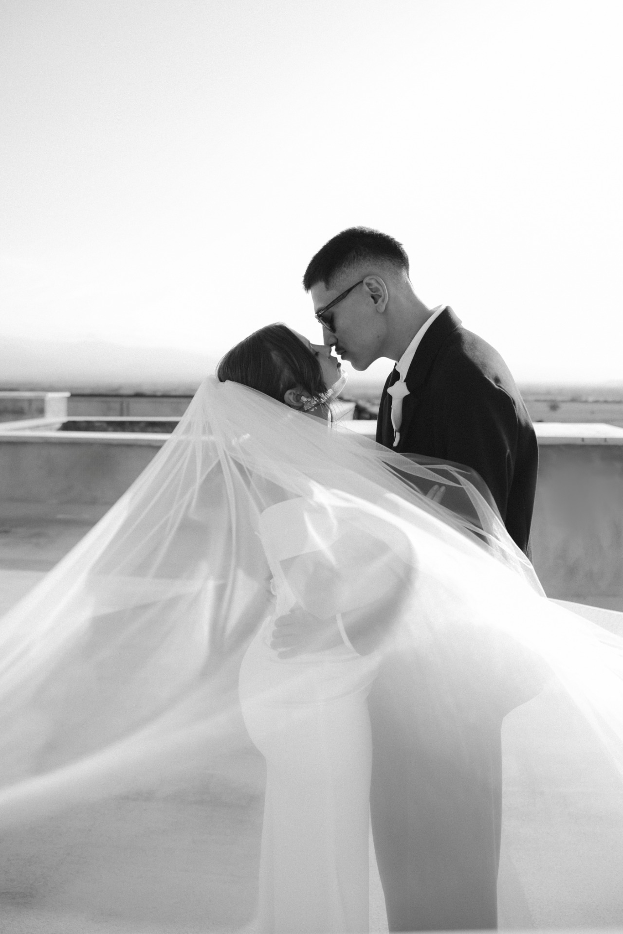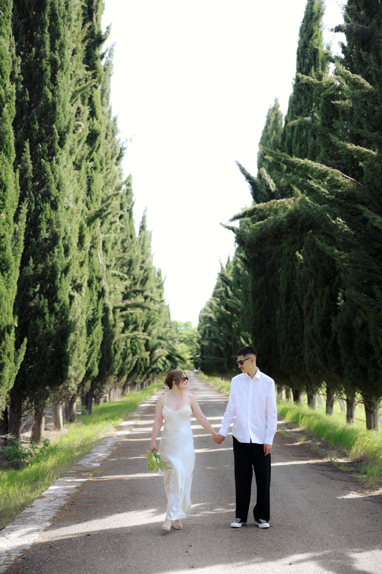 На съёмку с женихом, днём до церемонии, мы выбрали более расслабленные образы. Артур был в брюках и рубашке навыпуск, а я в платье в бельевом стиле: лёгком, воздушном, идеально подходящем для тёплого дня накануне свадьбы.