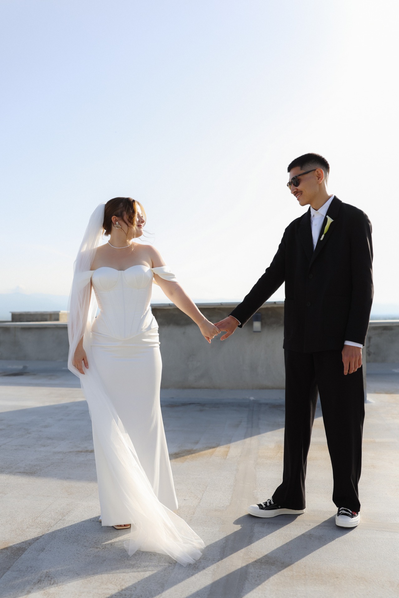 Образ жениха мы изначально задумывали максимально свободным: Артур не хотел классический костюм. В итоге он выбрал оверсайз-крой и отказался и от бабочки, и от классических туфель. Обувь тоже была выбрана осознанно — конверсы с сердечками, отражающие его стиль и наше общее отношение к деталям.