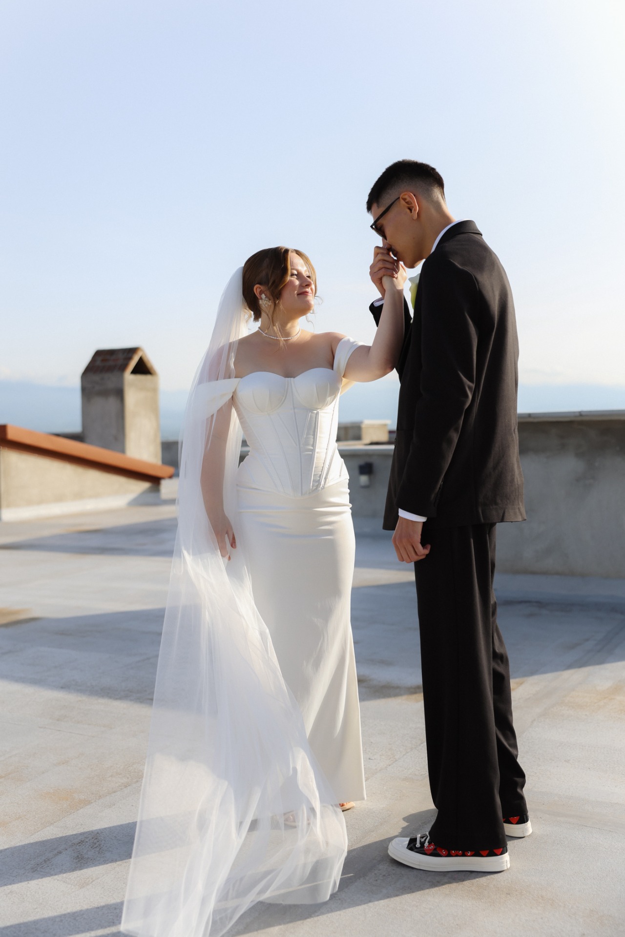 На саму церемонию и свадебный ужин я выбрала образ с корсетом. А вот к вечерней вечеринке я переоделась в короткую юбку и укороченную фату, чтобы было удобно танцевать до самого утра. В качестве украшений я выбрала чокер и серьги в виде цветов из жемчуга — акценты, отсылающие к лёгкому морскому настроению, которое пронизывало нашу свадьбу.
