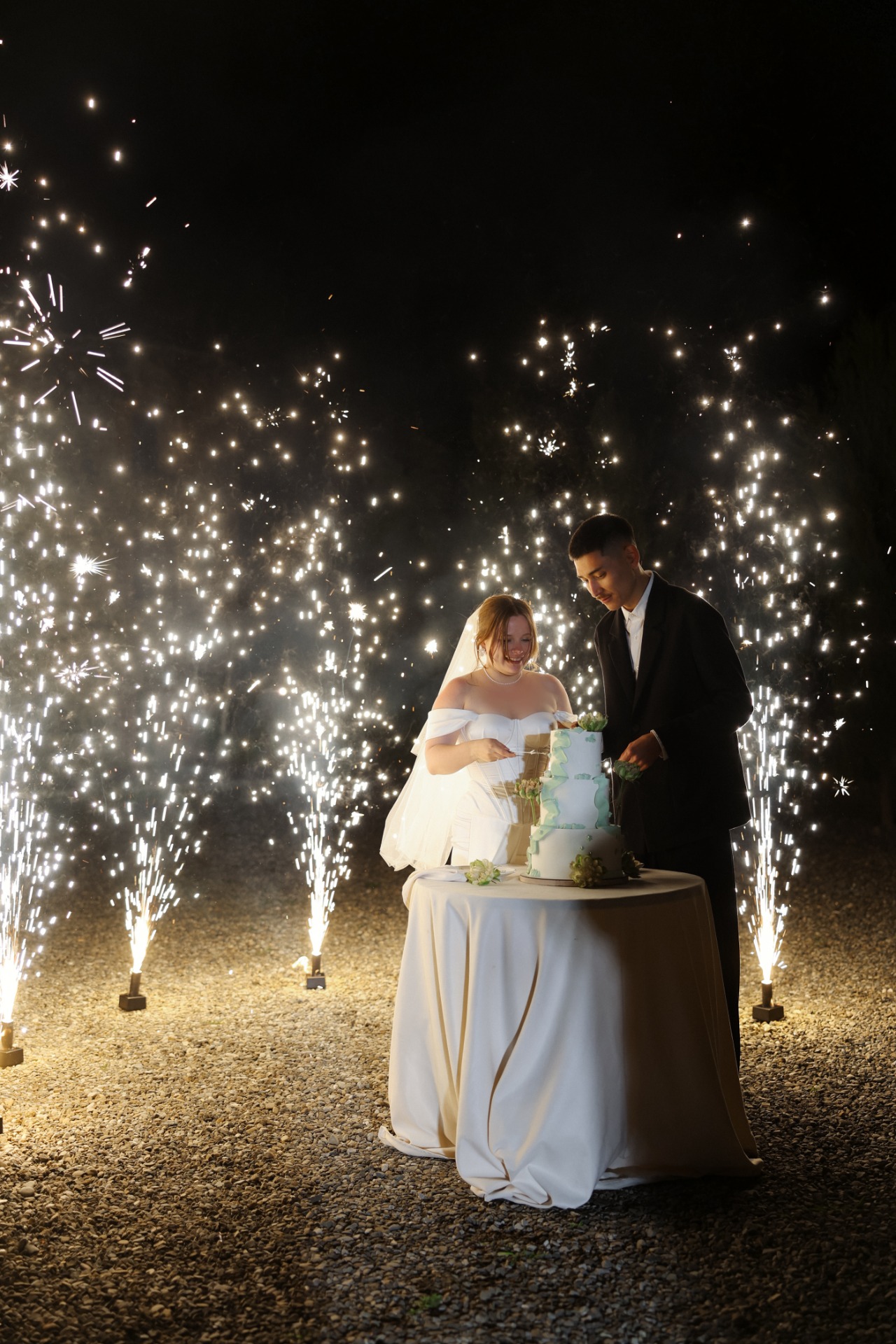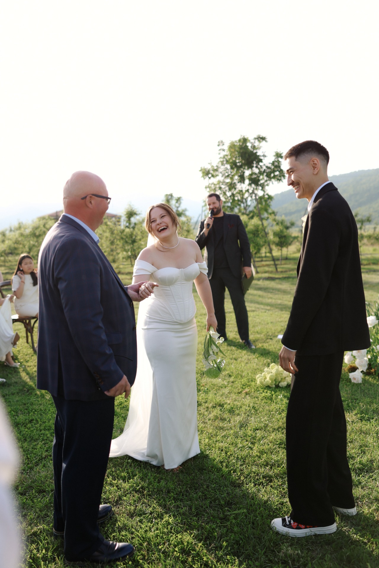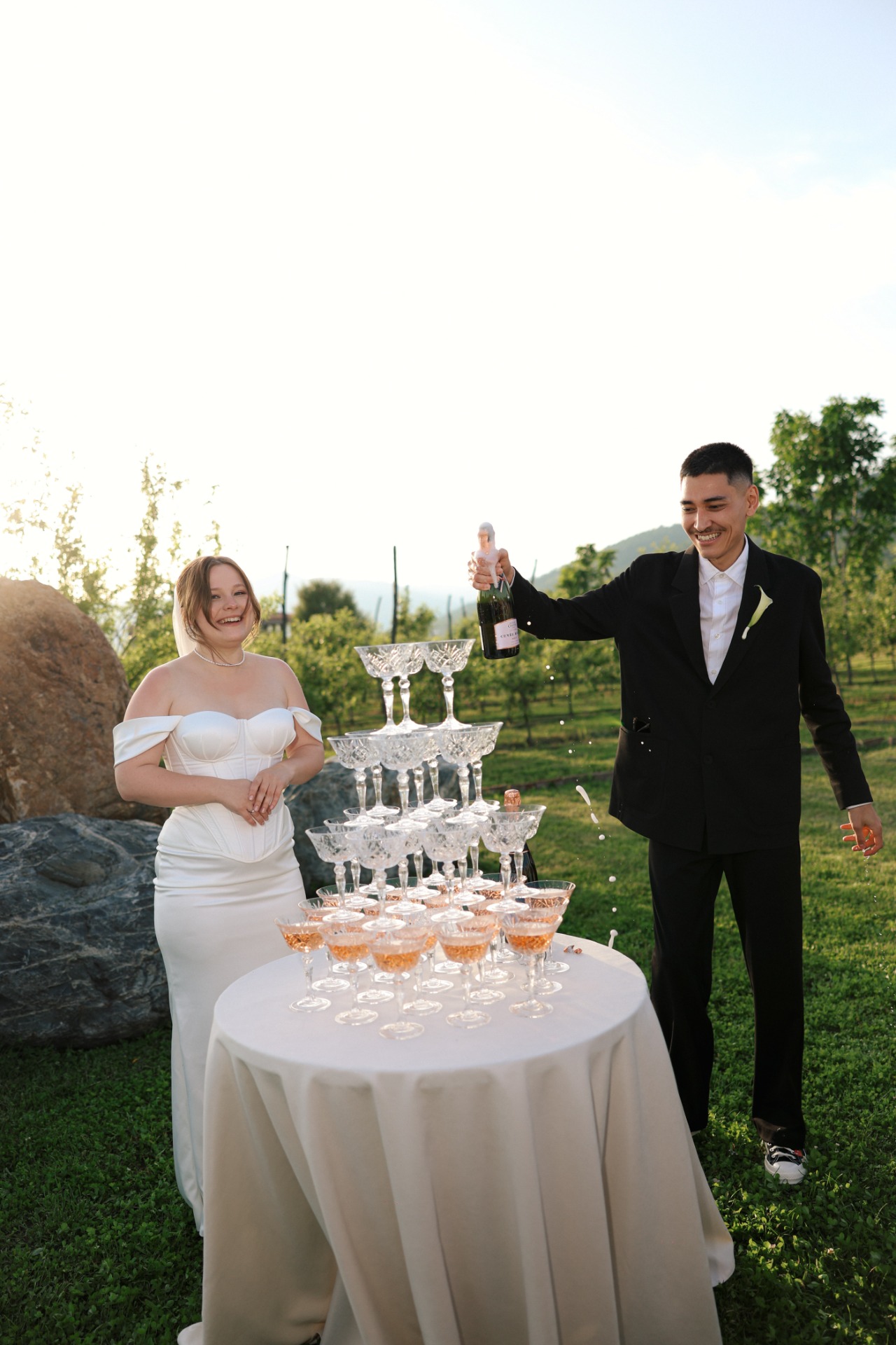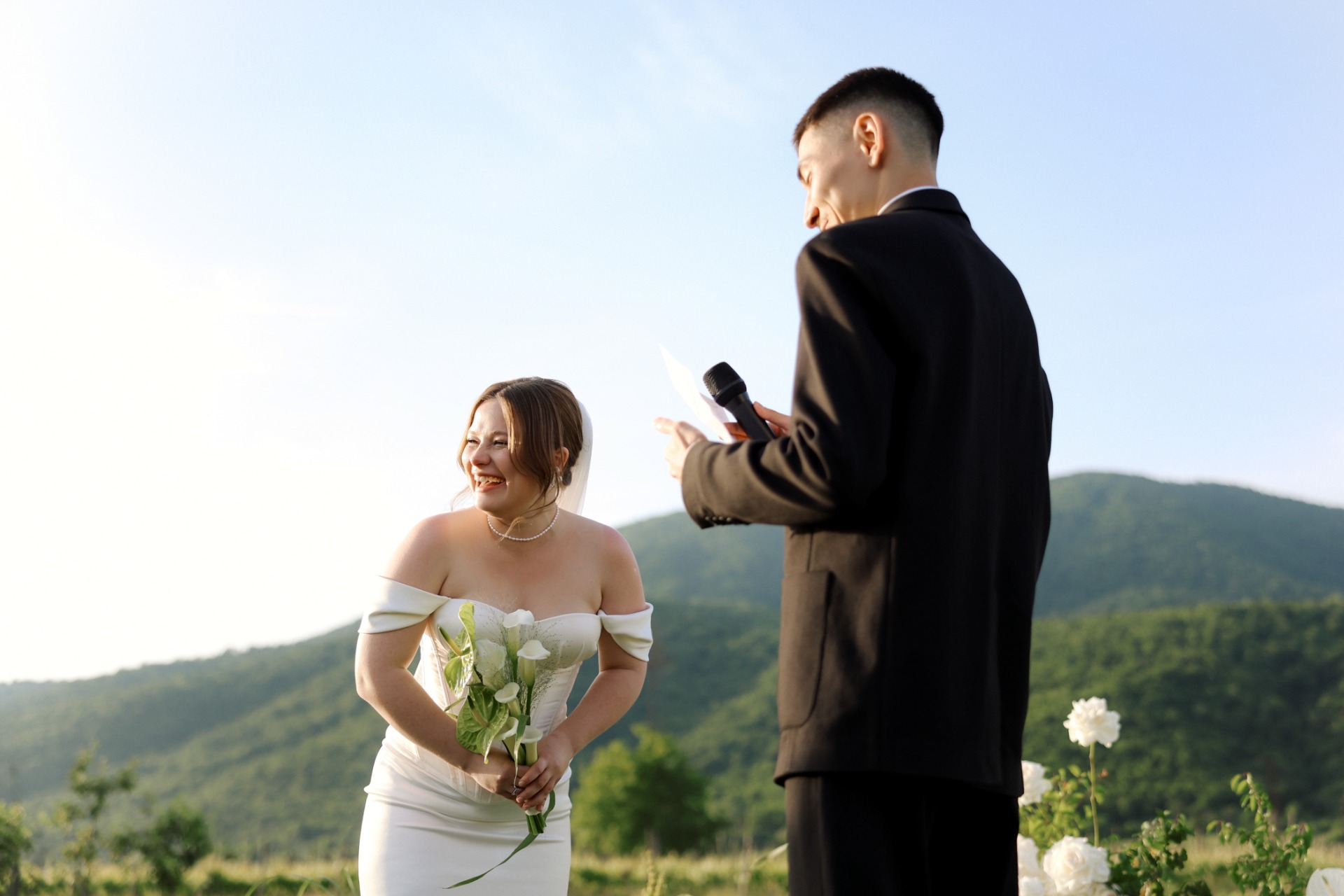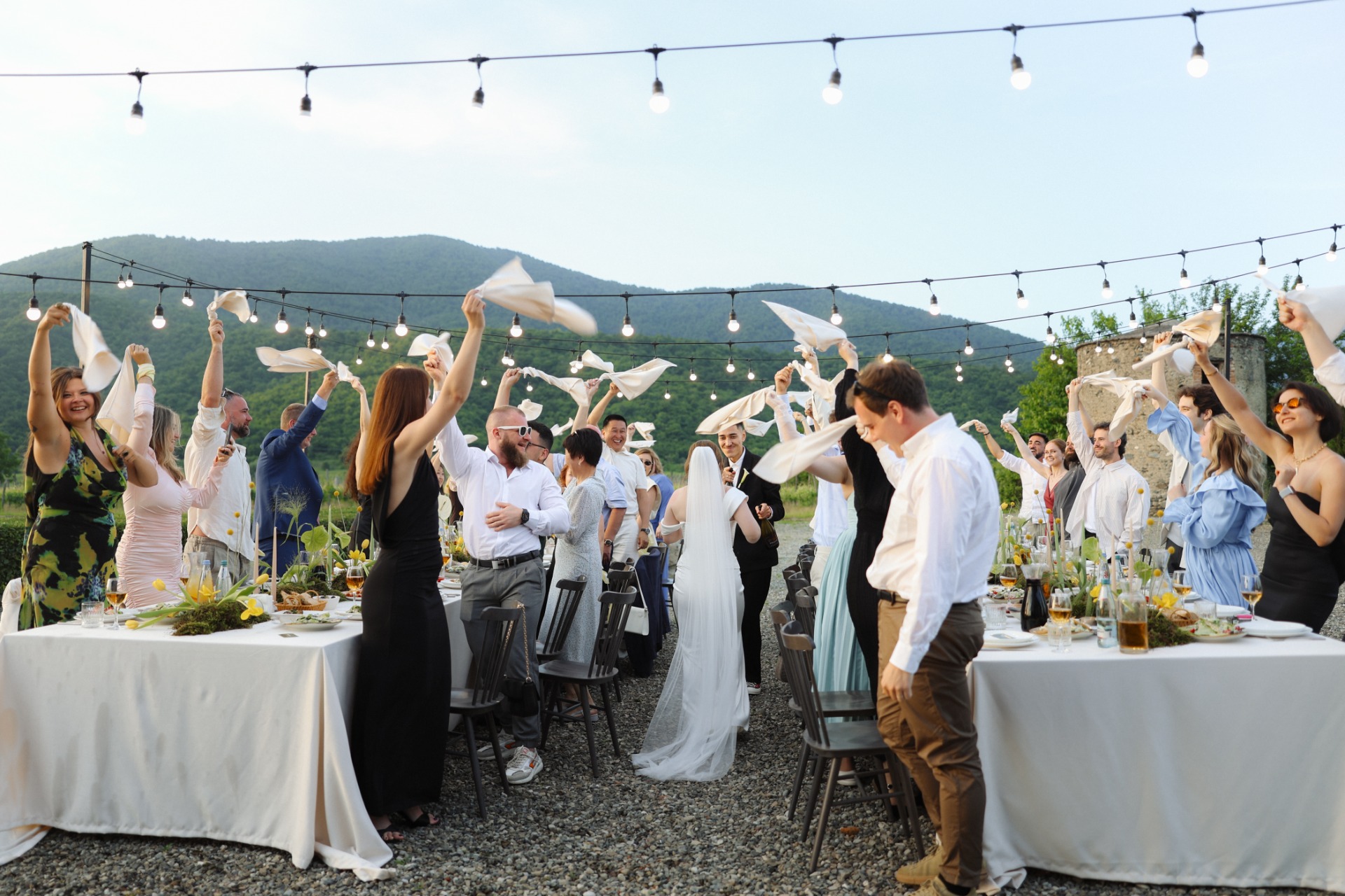 На церемонии нас ждал драйвовый выход под AC/DC — TNT: я шла с папой, и это было мощно, весело и очень по-нашему. Кульминацией стали наши клятвы — смешные и трогательные. Плакали все. Даже наш друг, который вообще-то скептически относится к браку. После церемонии — горка игристого, а на ужин мы выходили с бокалами в руках, обливали гостей и в этом моменте было столько радости и свободы!