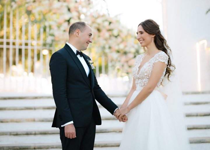 Мы решили уйти от классической арки и использовали вместо нее ажурные белые ворота, которые находились на территории виллы, а наш декоратор изящно их оформила с помощью цветочных композиций. К ним вела белая лестница, на которой мы и провели церемонию. Все было украшено в классическом стиле и бело-розовых тонах. Получилось очень органично.