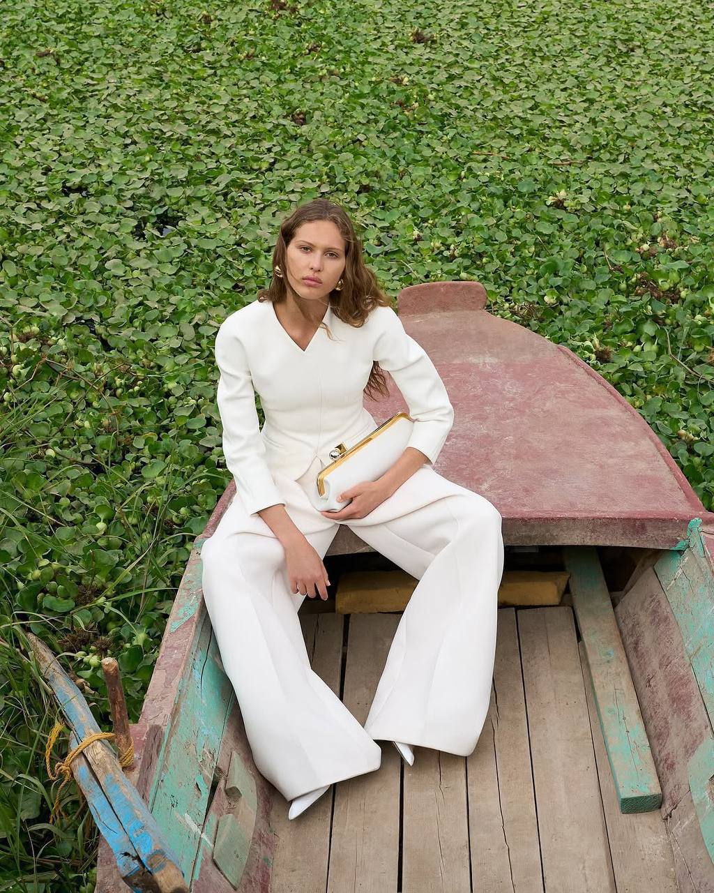 Кадры получились просто вау: съёмка прошла у подножия Великой пирамиды Гизы, на берегах Нила и среди зелёных пальмовых полей. Всё — максимально по-восточному красиво. Анджелина примерила ключевые образы коллекции — среди них объёмное пальто в горох с драматичными рукавами и длинным шлейфом, кипельно белое платье и скульптурный комплект с банановым принтом. Мухамед Хассан появился в рубашке в жёлто-белую полоску, заправленной в чёрные широкие брюки, а также в элегантном, полностью белом образе.