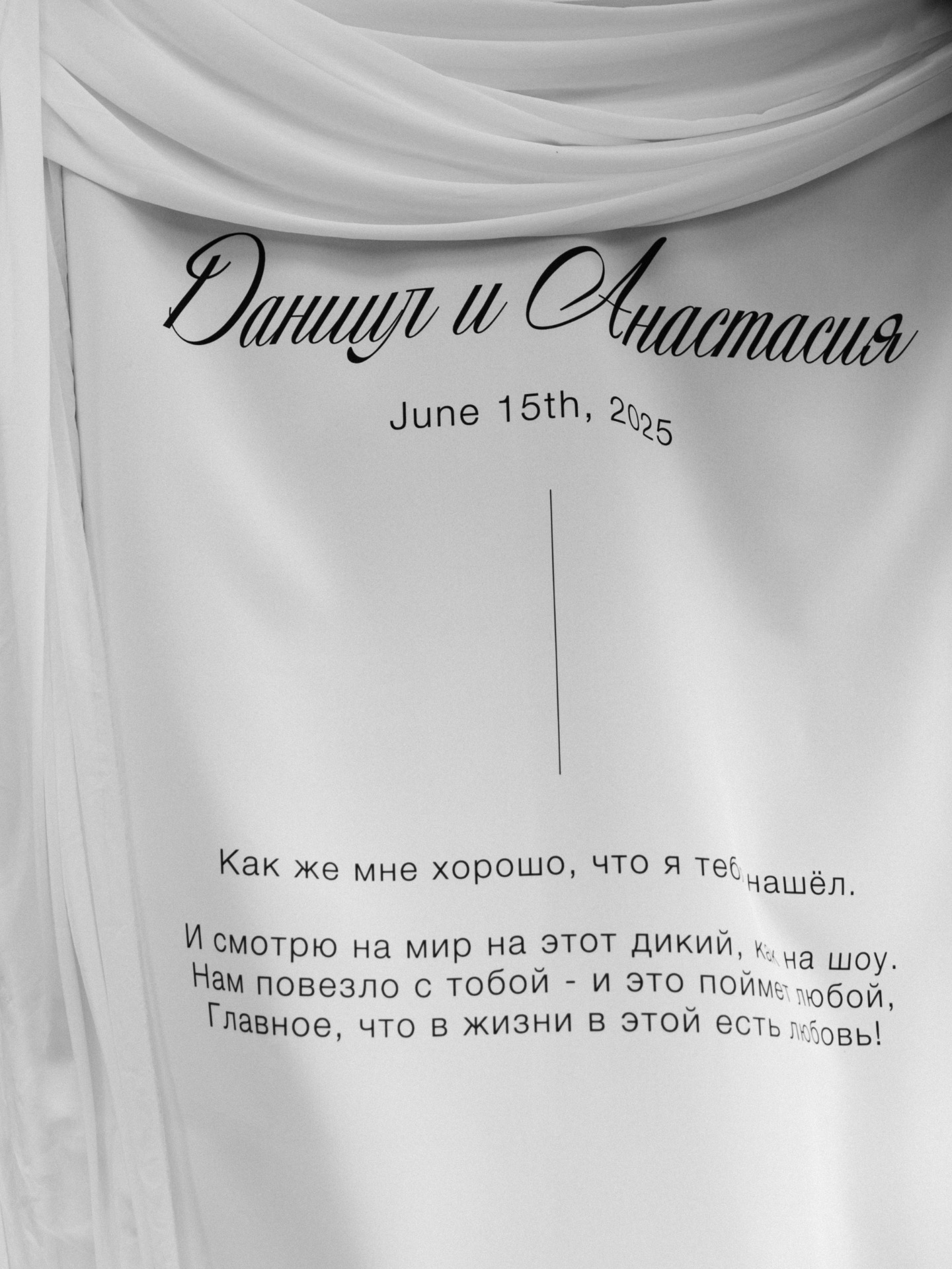 Уже с рассказа о нашей истории на церемонии все начали плакать, а, увидев мои слёзы, заплакал и жених. Гости надрывали животы от смеха благодаря развлекательному видео от ведущего с масками из Snapchat и интервью. Были трогательные сюрпризы от друзей: один написал стихотворение, подруги подготовили видеоряд из детских фото, оживлённых нейросетью, все ревели под трек «На кухне».