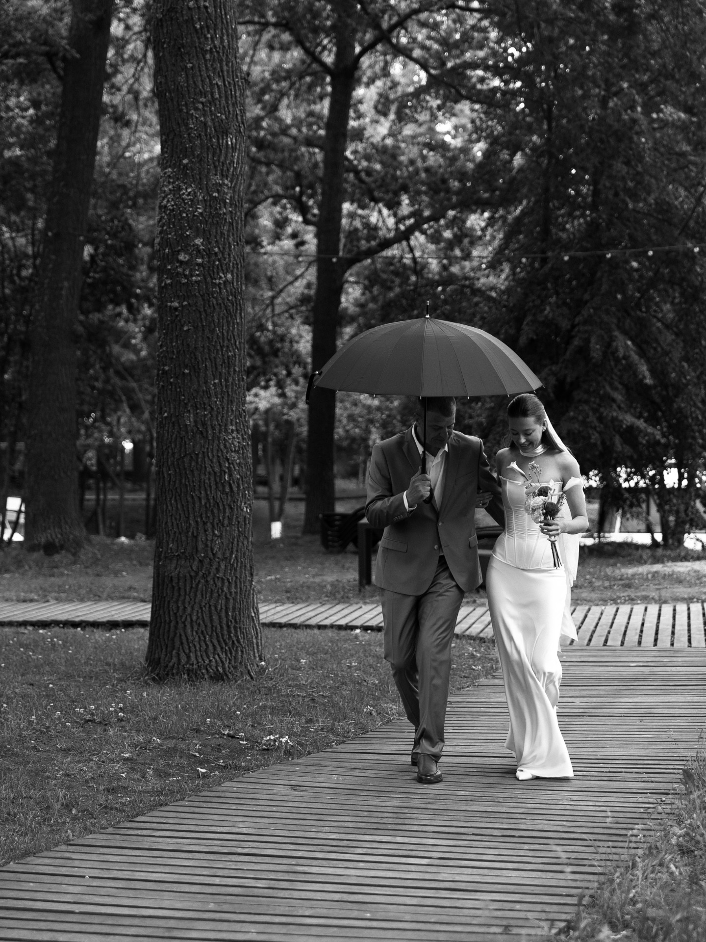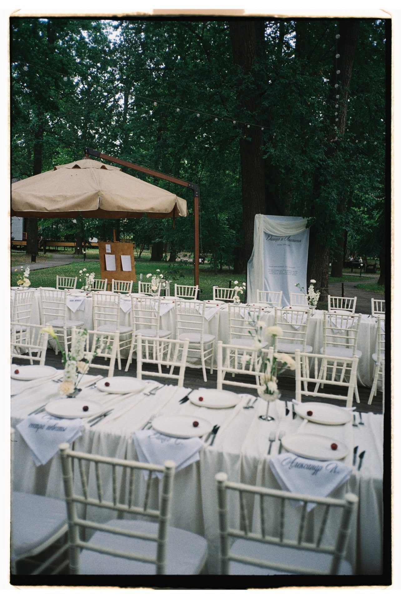 Сперва я расстроилась: июль выдался дождливым, всю неделю шли проливные дожди, и казалось, что наша идея банкета на улице уже канула в лету. Но нет! Именно в наш день прошёл небольшой дождь, который добавил особенной атмосферы на церемонии и позволил сделать стильные кадры. А после выглянуло солнце и случился невероятный закат.