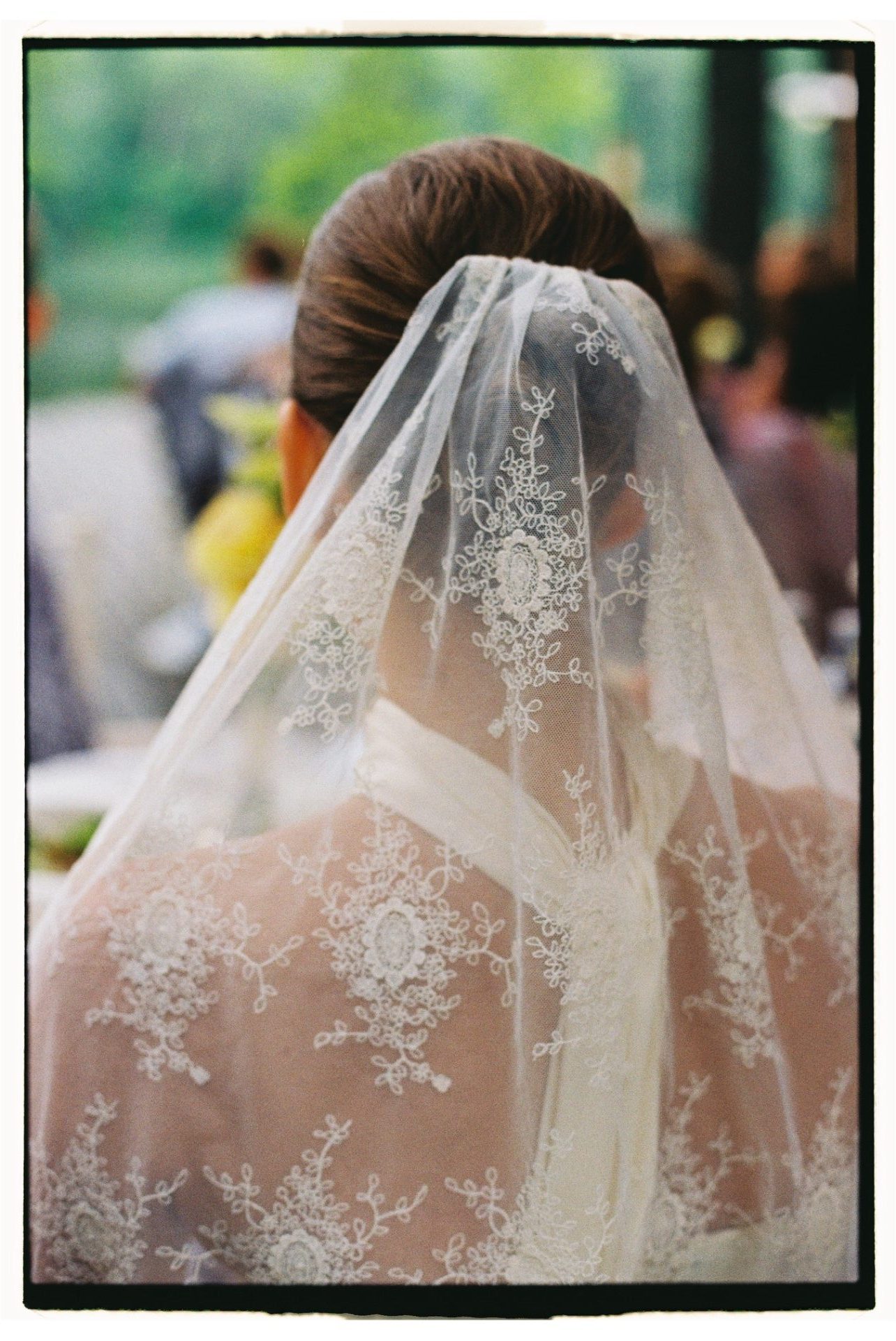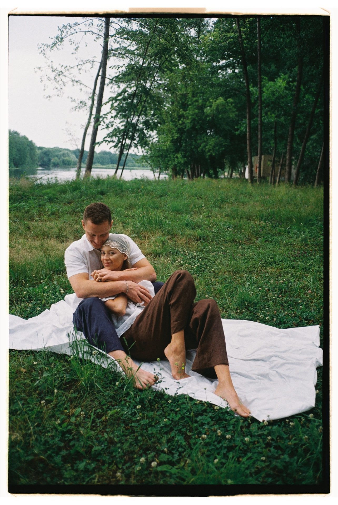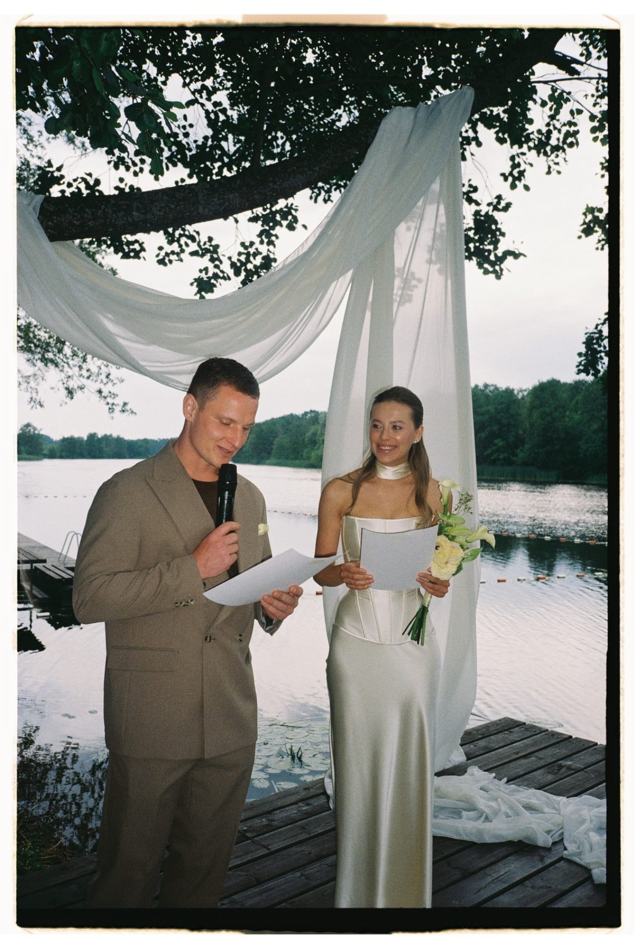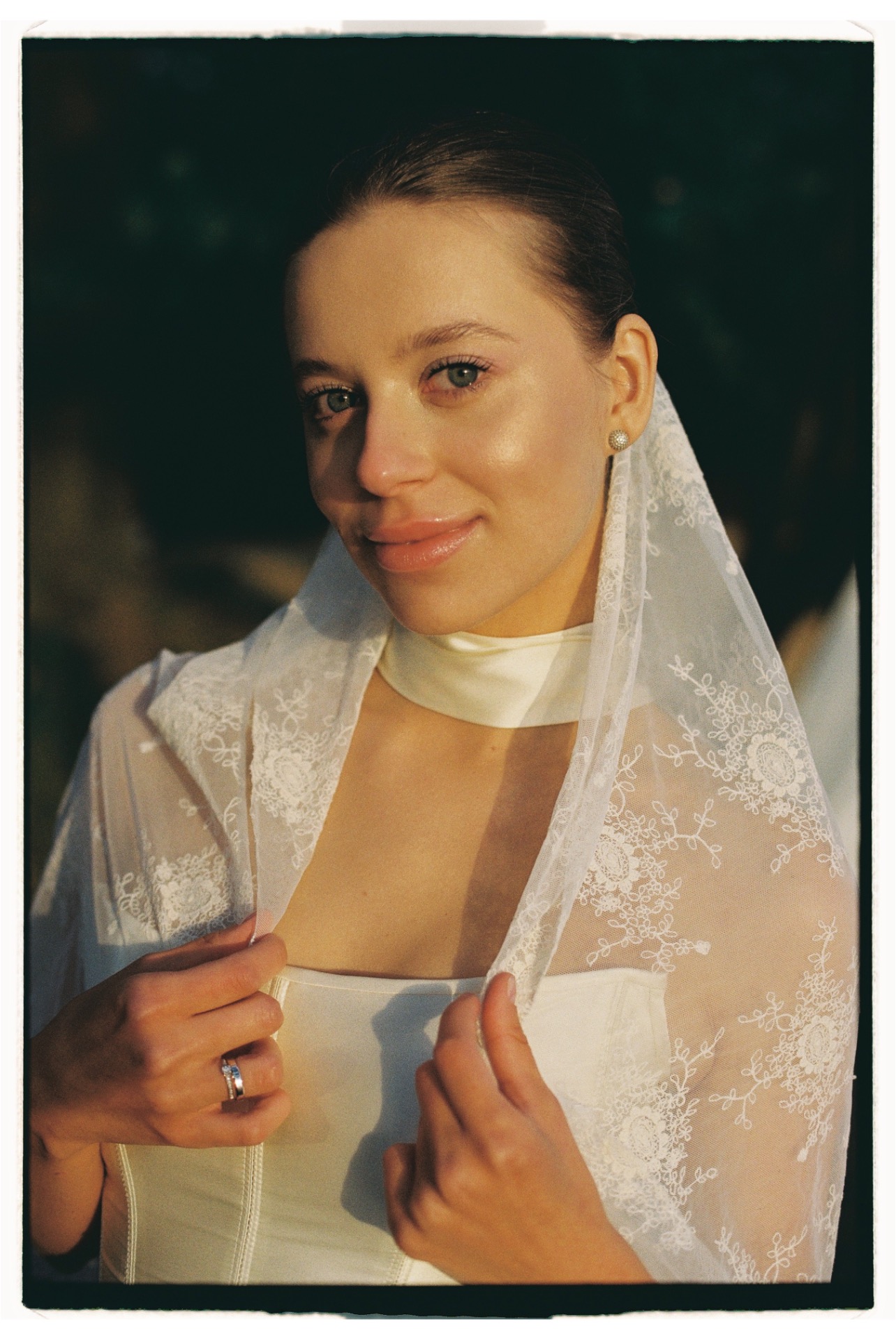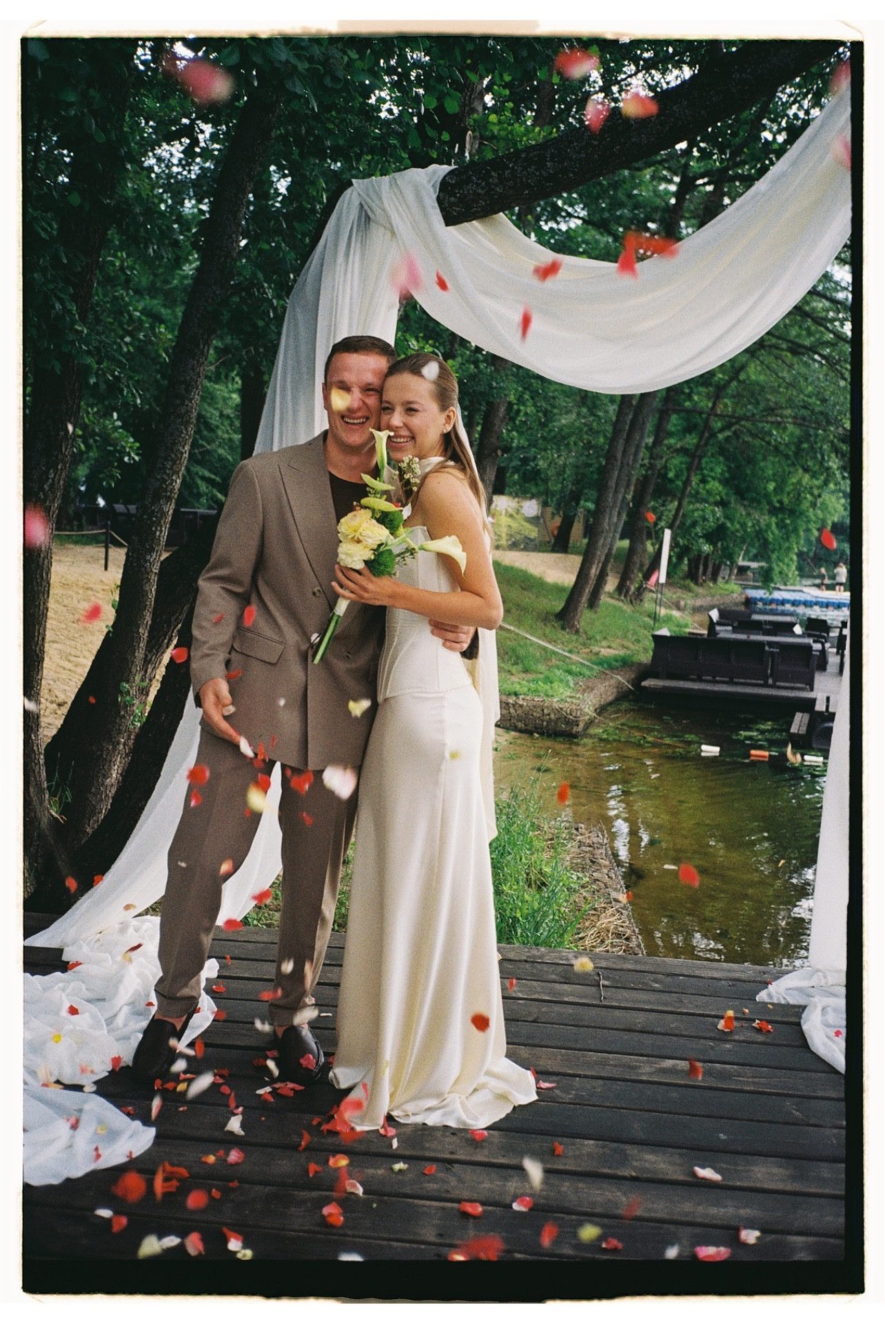 С образом невесты я определилась давно. У меня был сохранён референс юбки и корсета с лёгким шарфиком, который хранился в закромах моей фотоплёнки. Я долго откладывала пошив, надеясь, что найду другой вариант, который вдохновит меня больше. Но именно этот образ по-настоящему олицетворял меня. Я не ходила по салонам и не примеряла платья, сразу знала, что буду шить на заказ. Ателье нашло потрясающий шёлк невероятного цвета и качества. Оттенок сливочного масла и лёгкая, струящаяся юбка идеально вписались в локацию на берегу реки, особенно в свете закатного солнца, я чувствовала себя по-настоящему красивой. Образ я дополнила фатой из винтажного кружева, мне хотелось совместить фактуру шёлка и кружева.