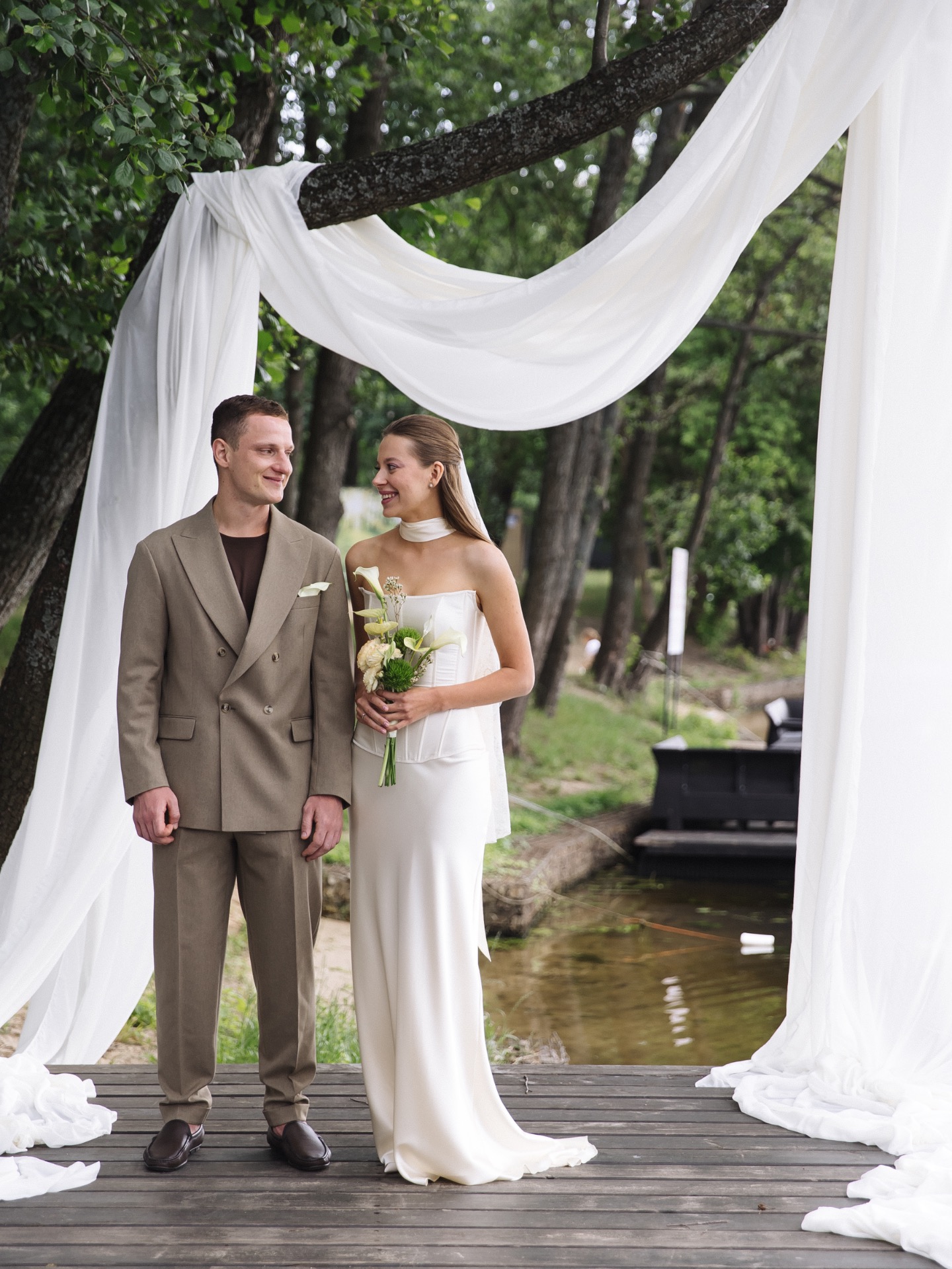 Все детали торжества я искала точечно, вдохновляясь Pinterest и Weddywood. Благодаря чёткому представлению визуальной картины нашей свадьбы, всё шло легко, я точно знала, чего хочу. Я собрала подробный мудборд и описала концепцию, чтобы подрядчики поняли наш замысел максимально точно. Особое внимание уделяла тканям, фактурам и мелочам.