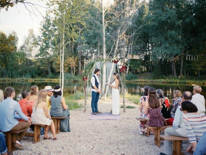 Изначально мы планировали классический вечер в какой-нибудь красивой усадьбе. Месяца за три пришло озарение – это не наше. Сменили вектор на простоту и легкость. Выбрали стиль бохо, яркие цвета, уютную беседку чуть ли не в лесу и отказались от ведущего. Точнее, мы сами вели вечер и получали от этого колоссальное удовольствие.