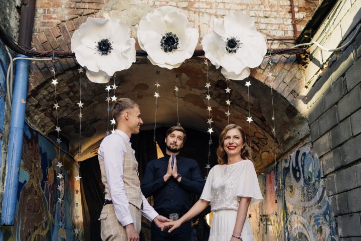 В один из душевных вечеров я сообщила подругам, что, если решу когда-либо выйти замуж, хочу сделать это там. У бара есть территория на улице, она чем-то похожа на питерский дворик: форма — колодец, вход через арку, много граффити, мебель из паллет, береза на крыше… Чтобы сделать все чуть нежнее, добавили деталей: много гирлянд (электрических и бумажных), головки огромных белых маков, расставленные по периметру мыльные пузыри и маленькие таблички с Игорем Николаевым и его фразой «Выпьем за любовь» для фото.