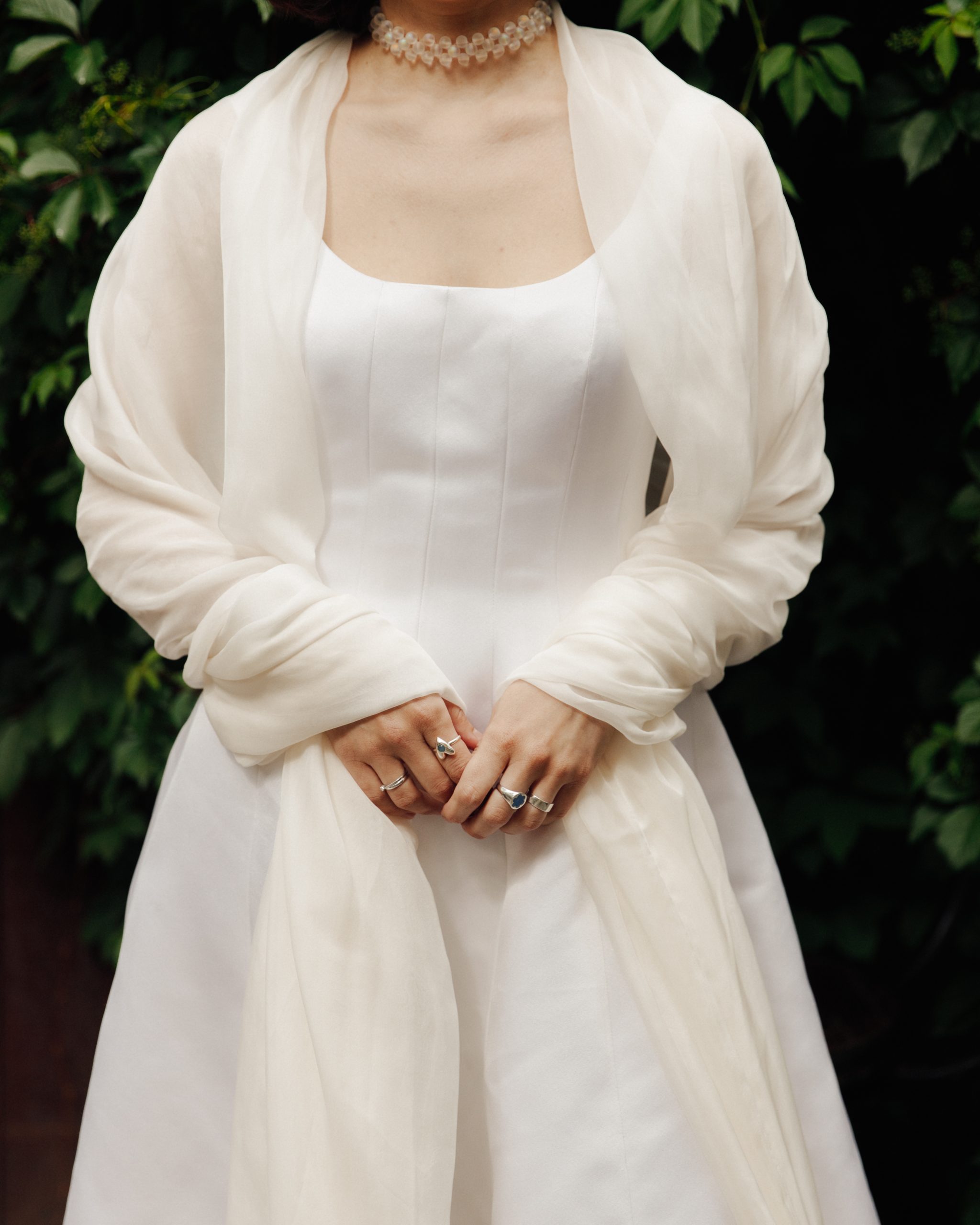 До самого конца я не могла решить, что добавить к образу: фату, ободок или накидку. Я даже купила ткань для фаты-банта, но в последний момент мне стало жаль её разрезать. Так появился длинный прозрачный шарф. Он стал главным спасением: в оба свадебных дня на улице было +14 и дождь, а шёлк отлично согревал меня в непогоду.