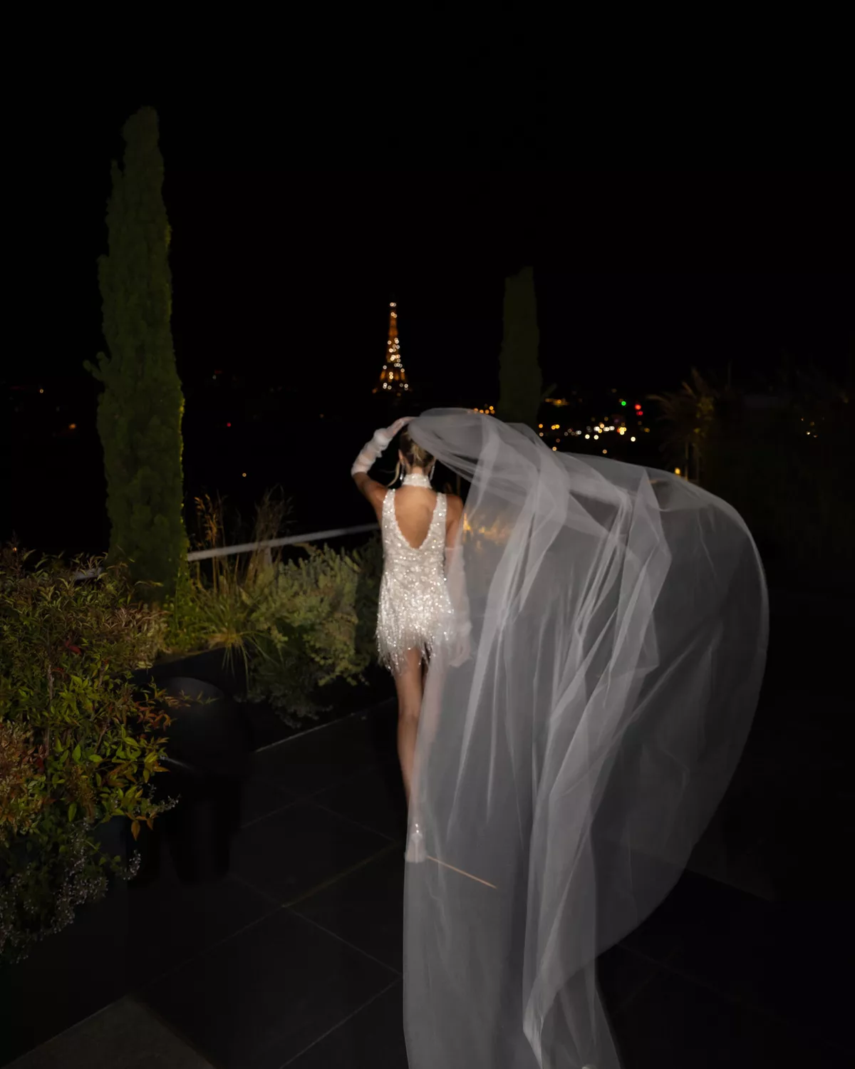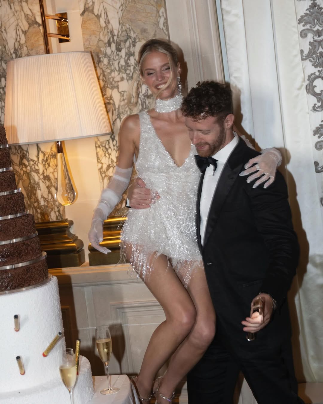 Второй образ — вечерний: платье в духе «Великого Гэтсби» с кружевами и сверкающей бахромой. Леони дополнила его чокером в тон и украшением с вышитыми инициалами пары. Акцентом стала фата с надписью Toi et Moi. «Эта фраза особенно важна для меня», — рассказывает Леони. «Алекс выгравировал её на моём кольце после того, как сделал предложение».